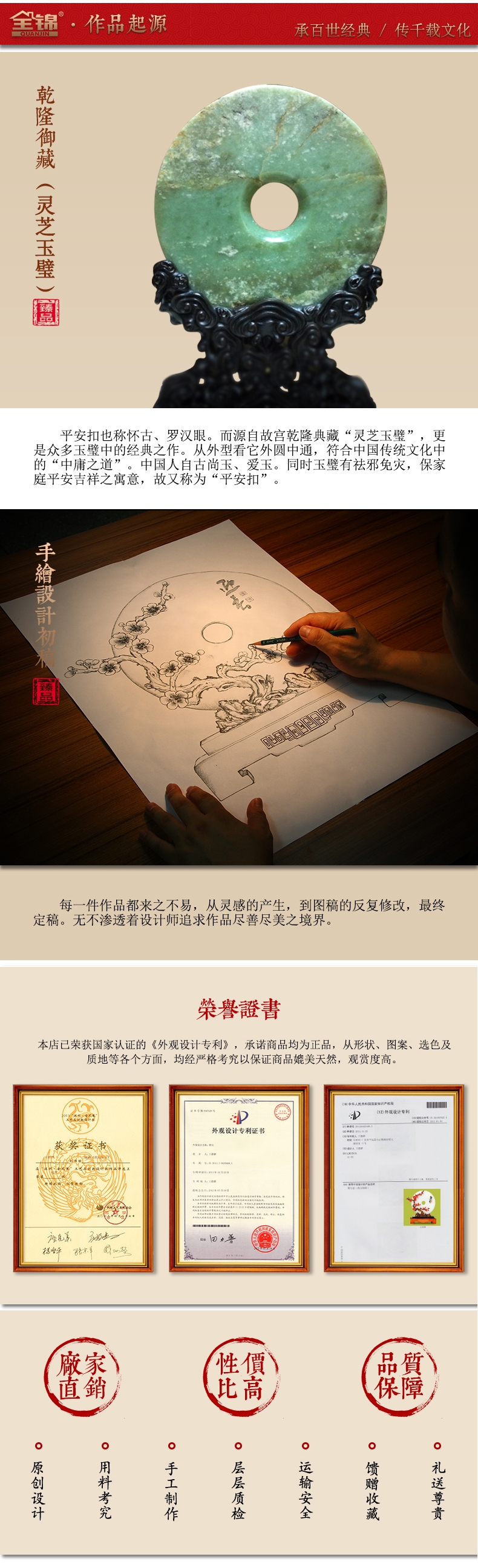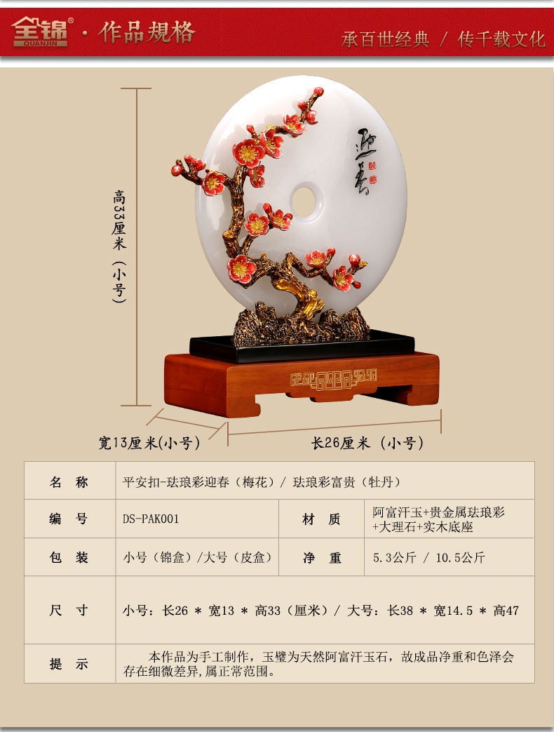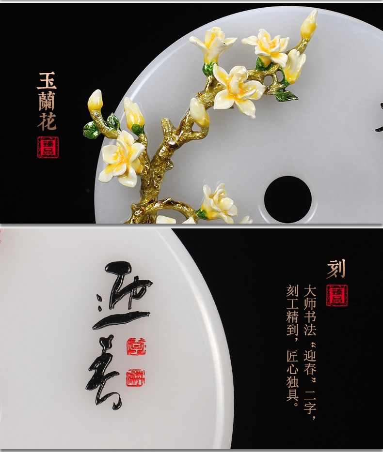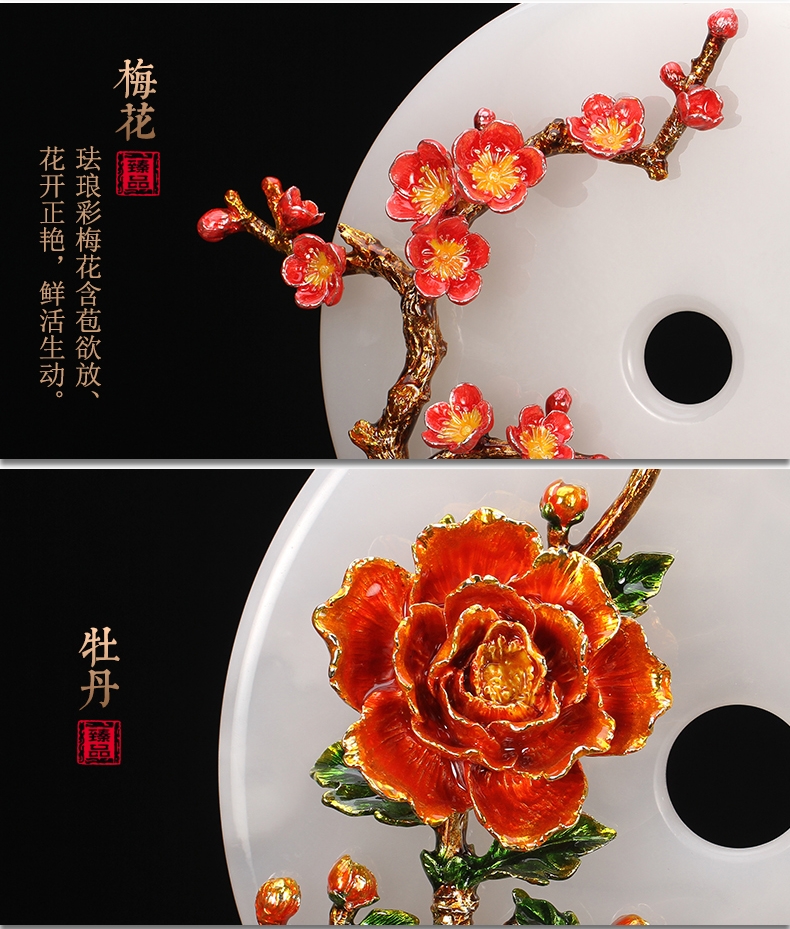 贵金属珐琅彩牡丹,与平安扣的完美结合,配以古典勾角;平安扣玉质温润剔透,珐琅彩牡丹或花开正艳或含苞欲放;整体效果层次分明、端庄高贵、生机盎然。