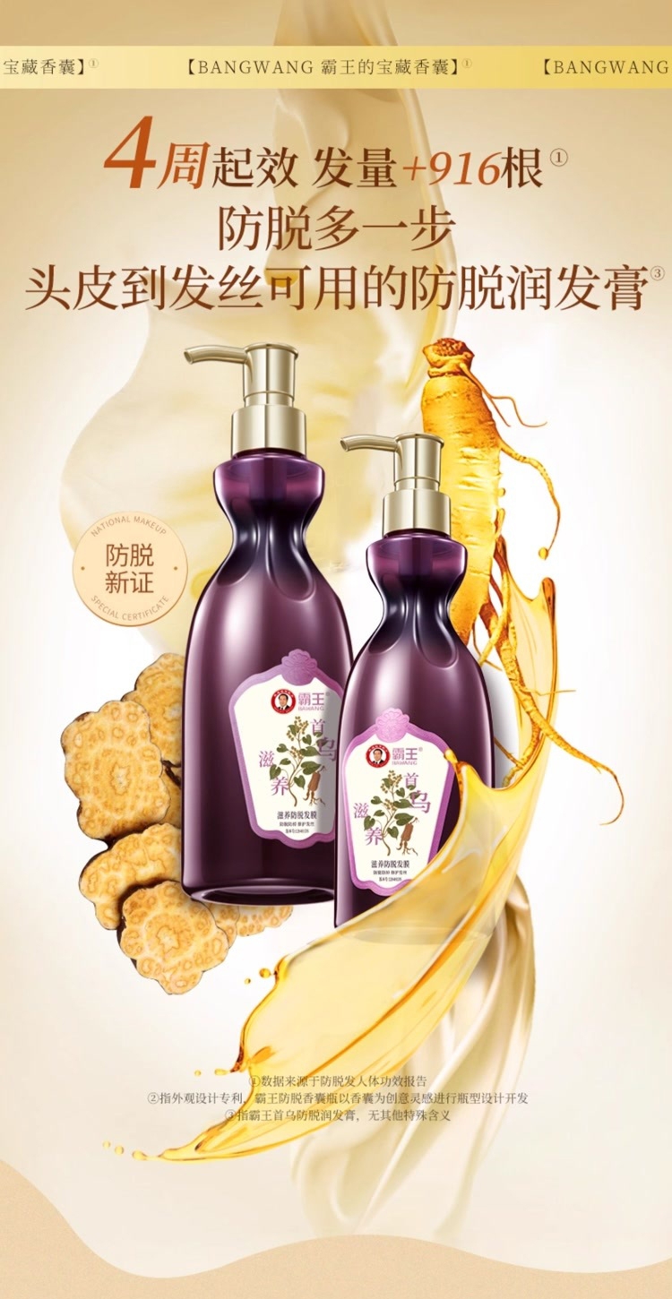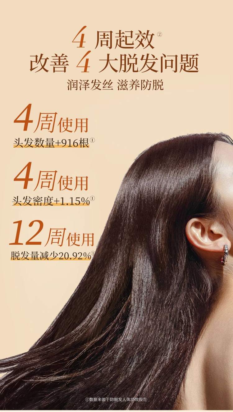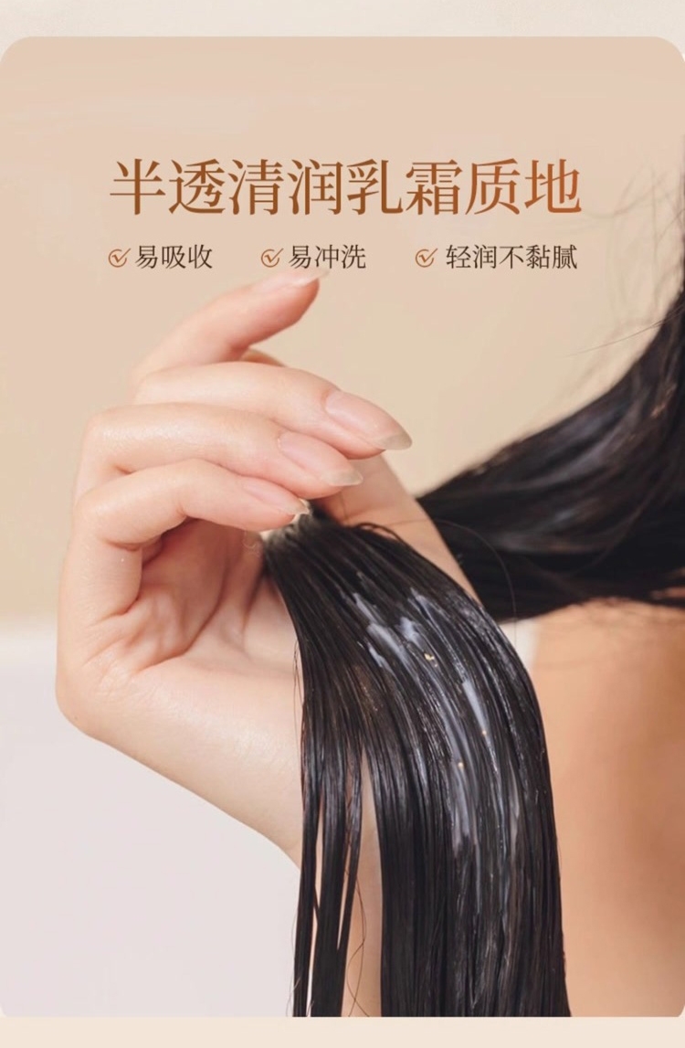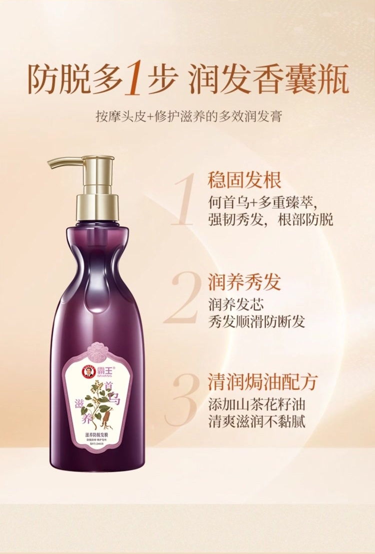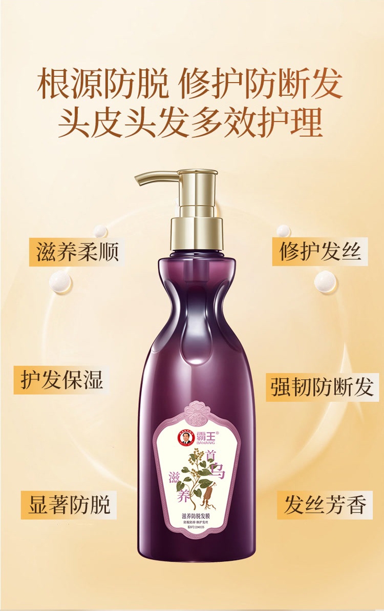稳固发根,何首乌+多重臻萃,强韧秀发,根部防脱;润养秀发,沁润发芯,秀发顺滑防断发;清润焗油配方,添加银杏+库拉索芦荟,清爽滋润不黏腻