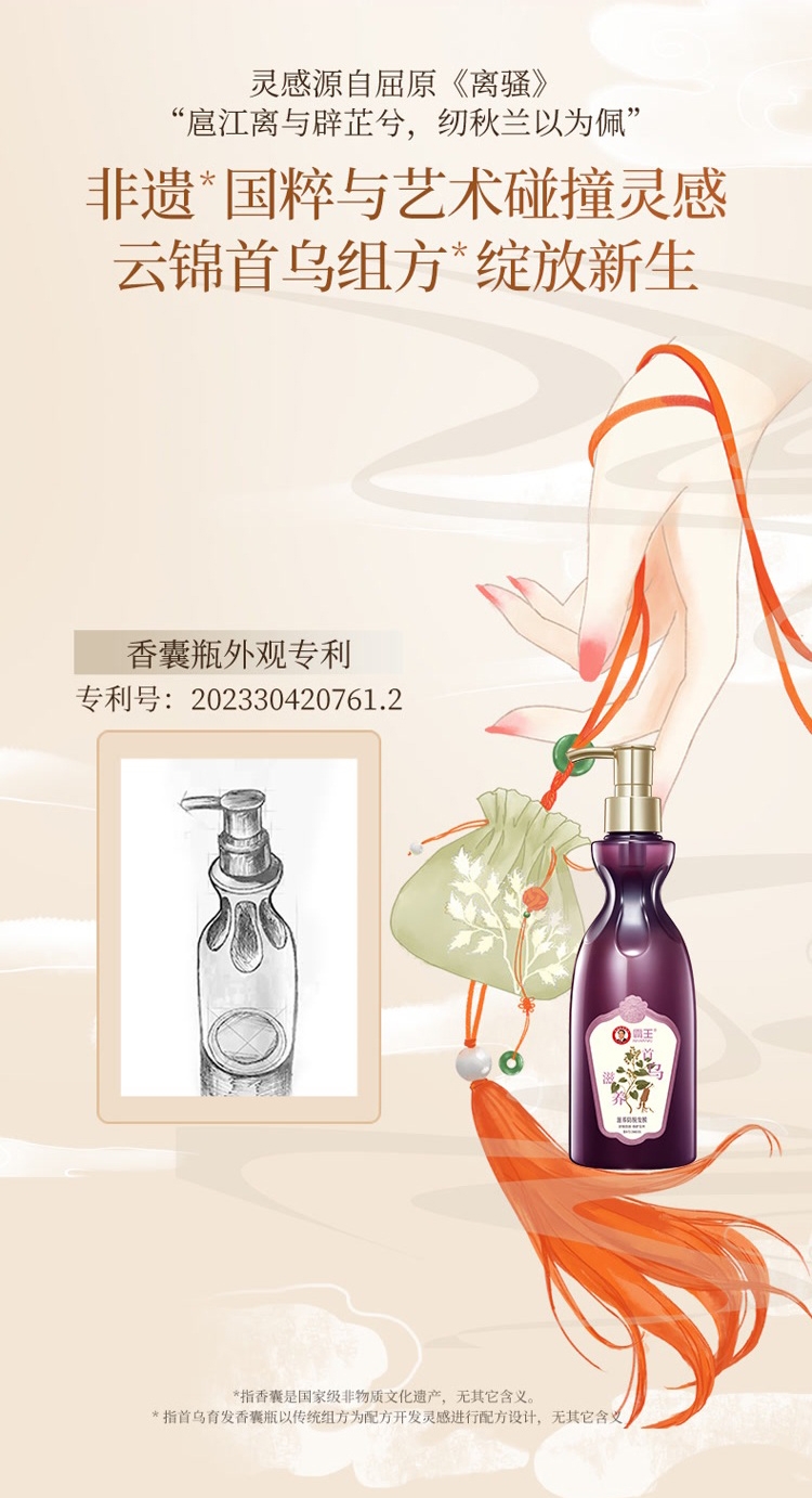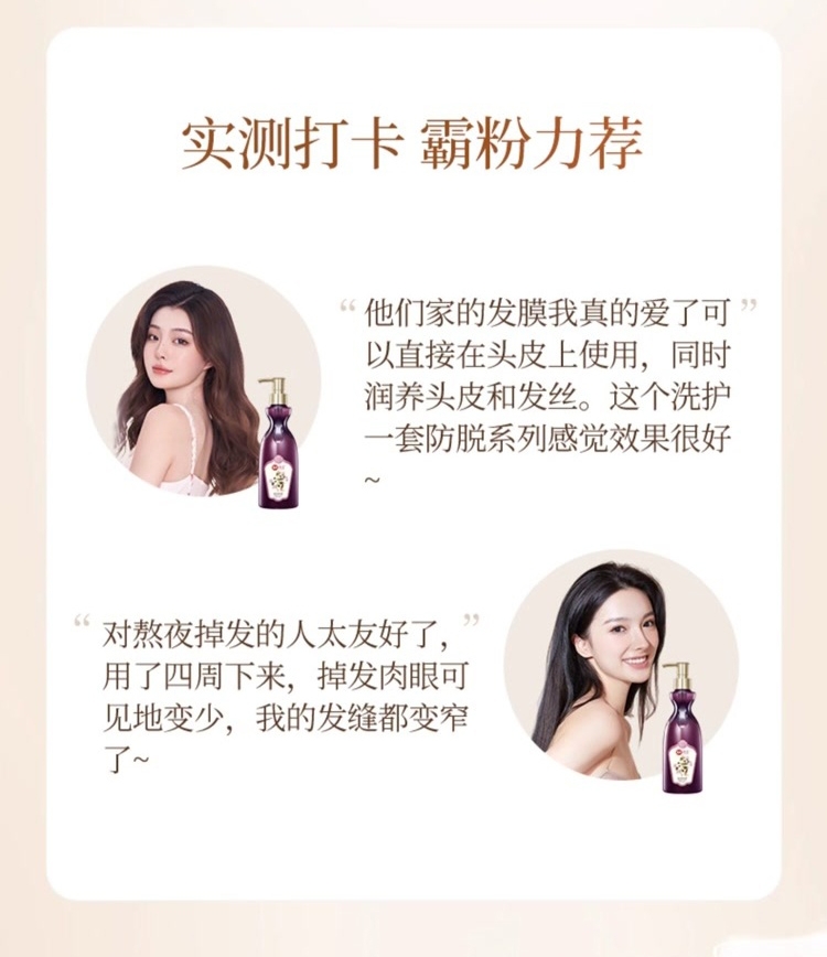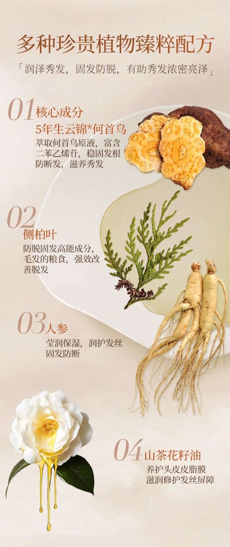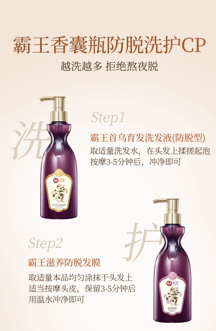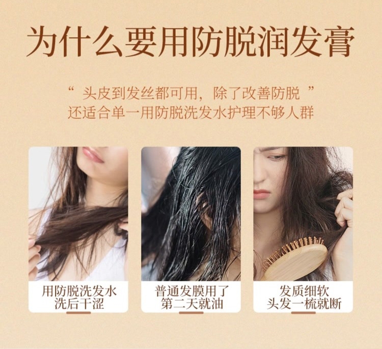 稳固发根,何首乌+多重臻萃,强韧秀发,根部防脱;润养秀发,沁润发芯,秀发顺滑防断发;清润焗油配方,添加银杏+库拉索芦荟,清爽滋润不黏腻
