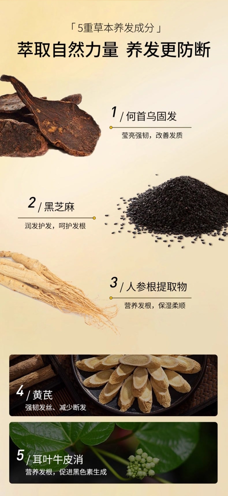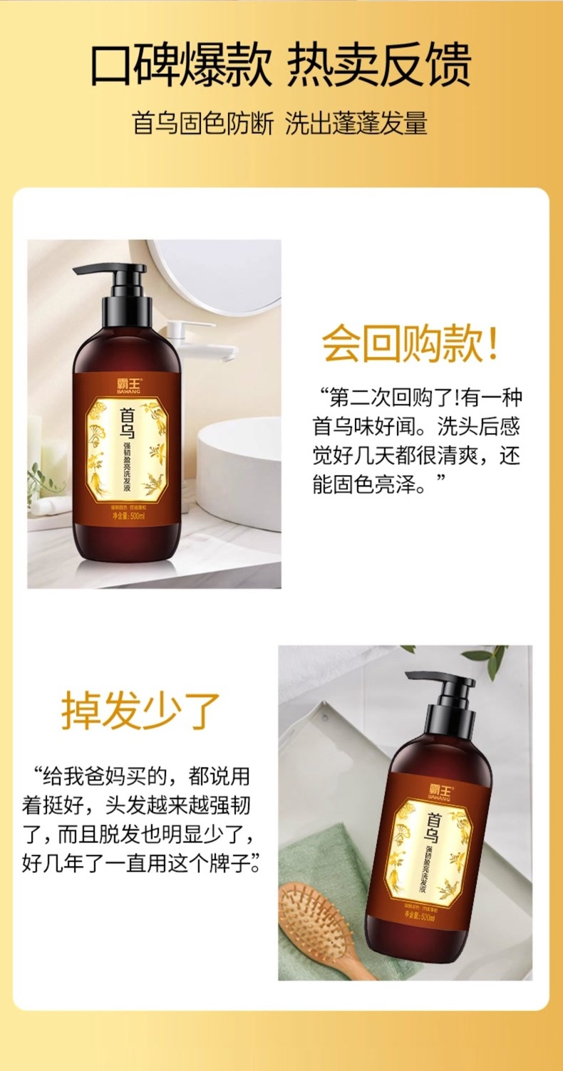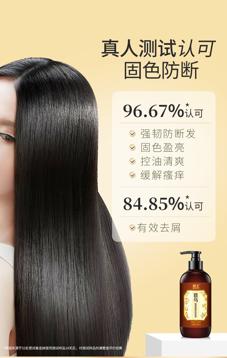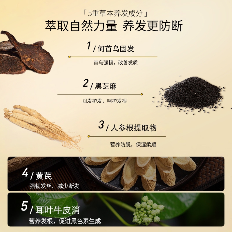 强根固发防脱发,减少头发脱落;精选何首乌、人参、黑芝麻等多种植物精华养护发根;调理头皮环境,经常使用改善发质,头发亮泽顺滑;育发特证+功效认证,防脱育发固发
