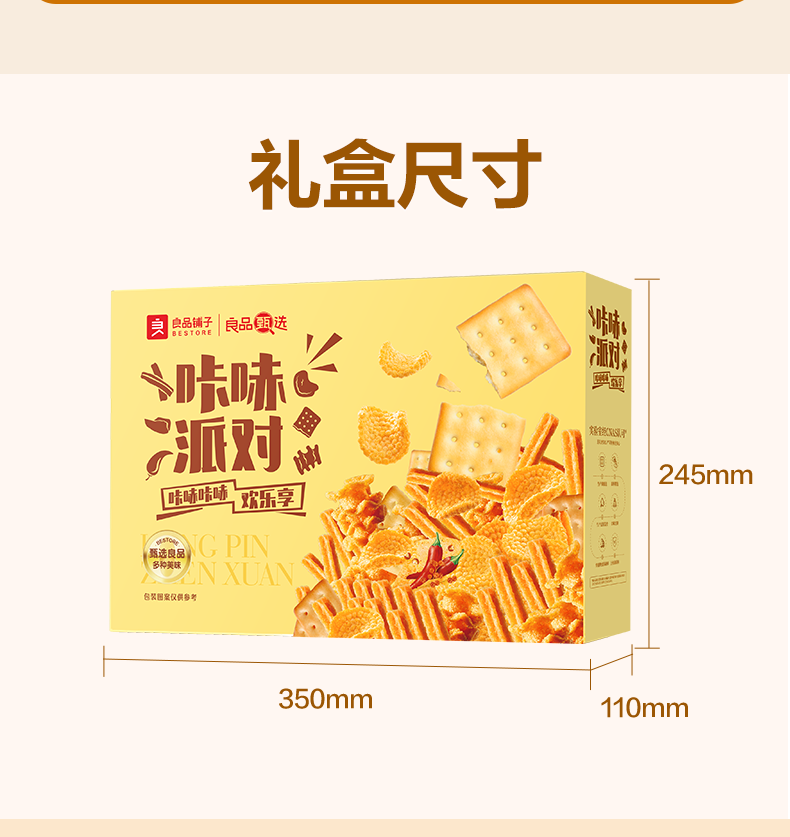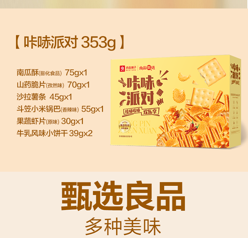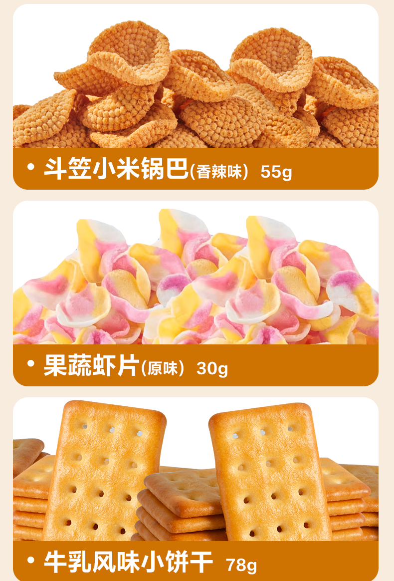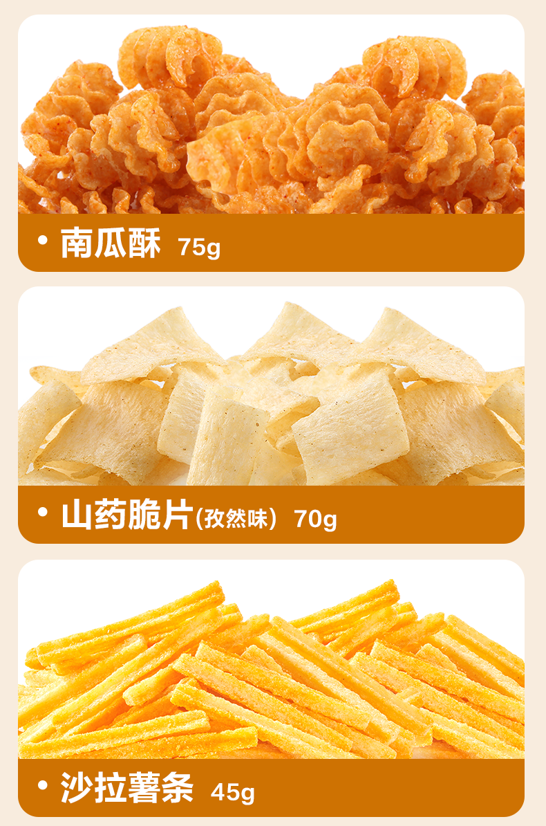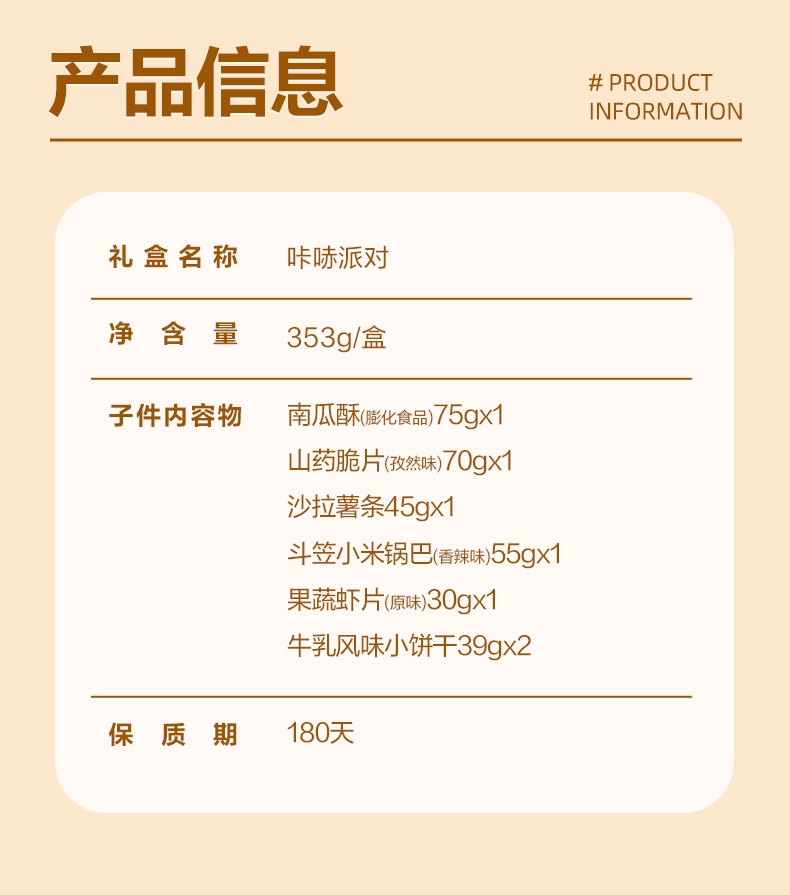 内配:南瓜酥(膨化食品) 山药脆片(孜然味)70g 沙拉薯条45g 斗笠小米锅巴(香辣味)55g 果蔬虾片(原味)30g 牛乳风味小饼干(39g)