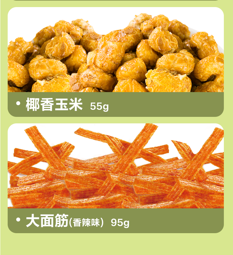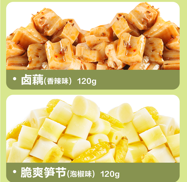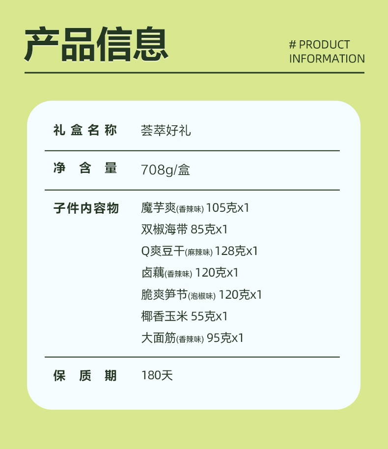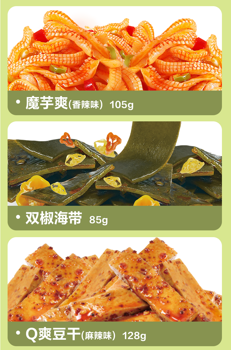 内配:魔芋爽(香辣味)105克 双椒海带85克 Q爽豆干(麻辣味)128g 卤藕(香辣味)120g 脆爽笋节(泡椒味)120克 椰香玉米55g 大面筋(香辣味)95g