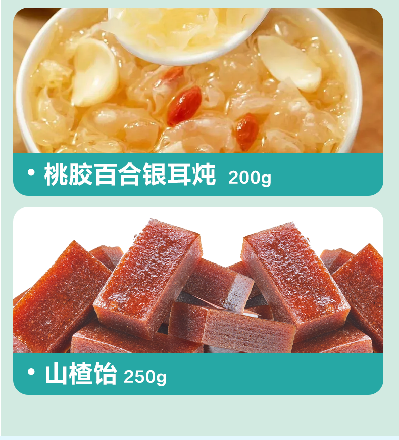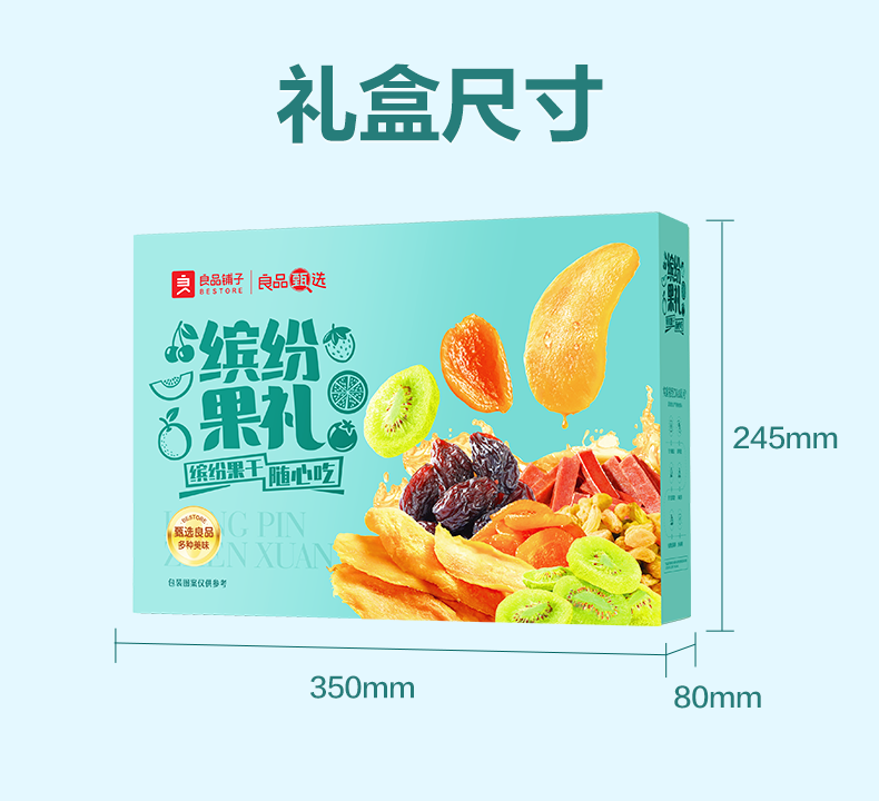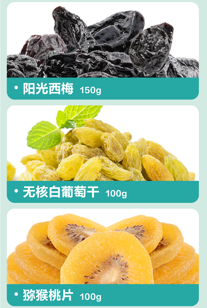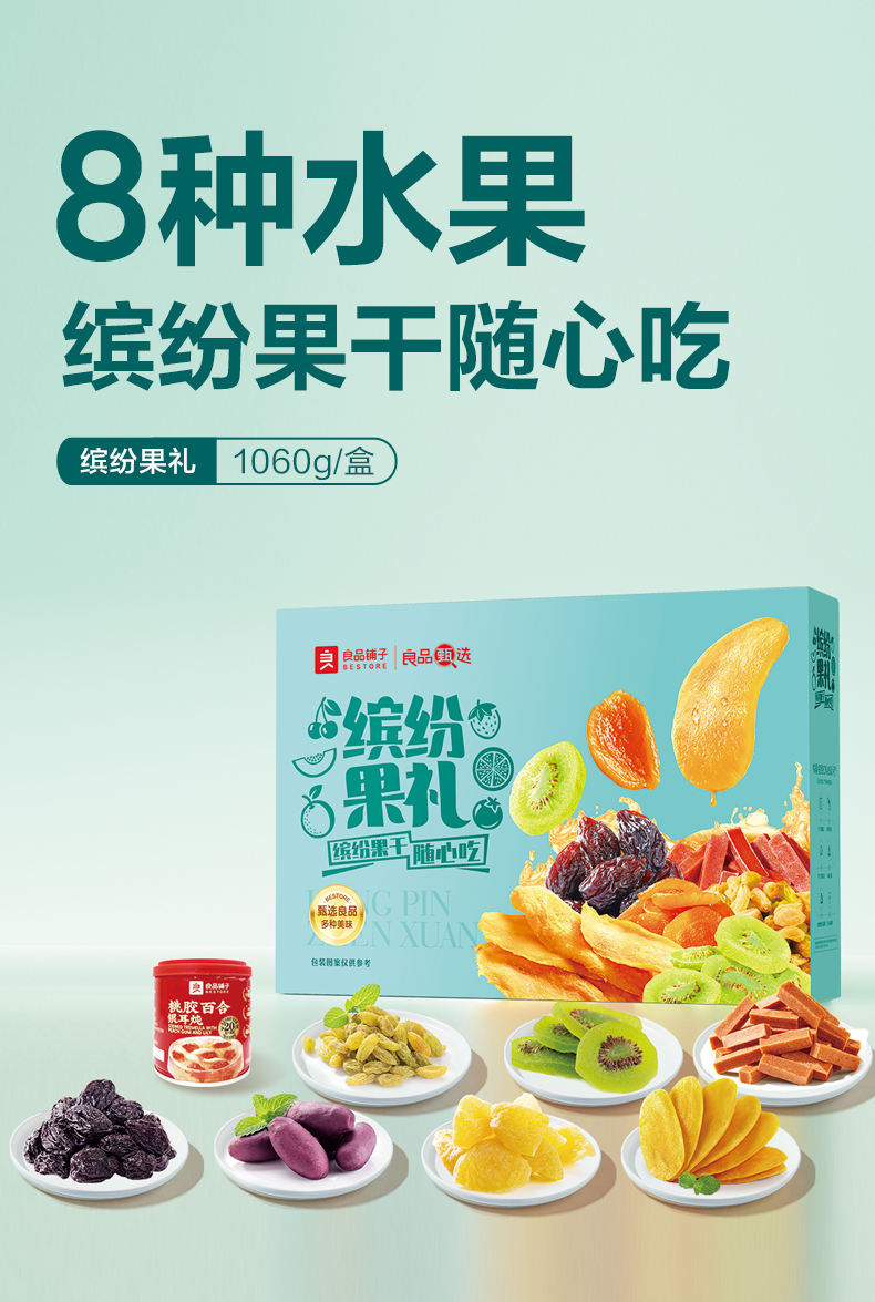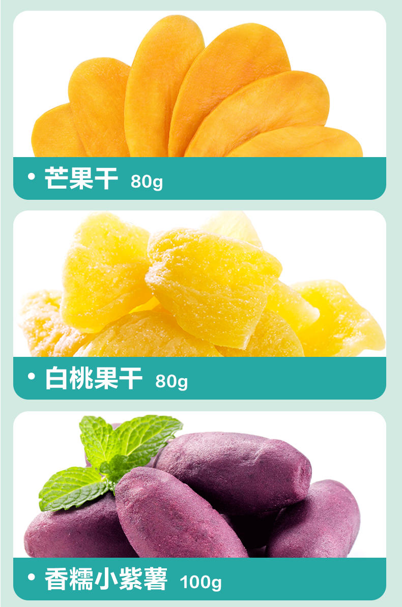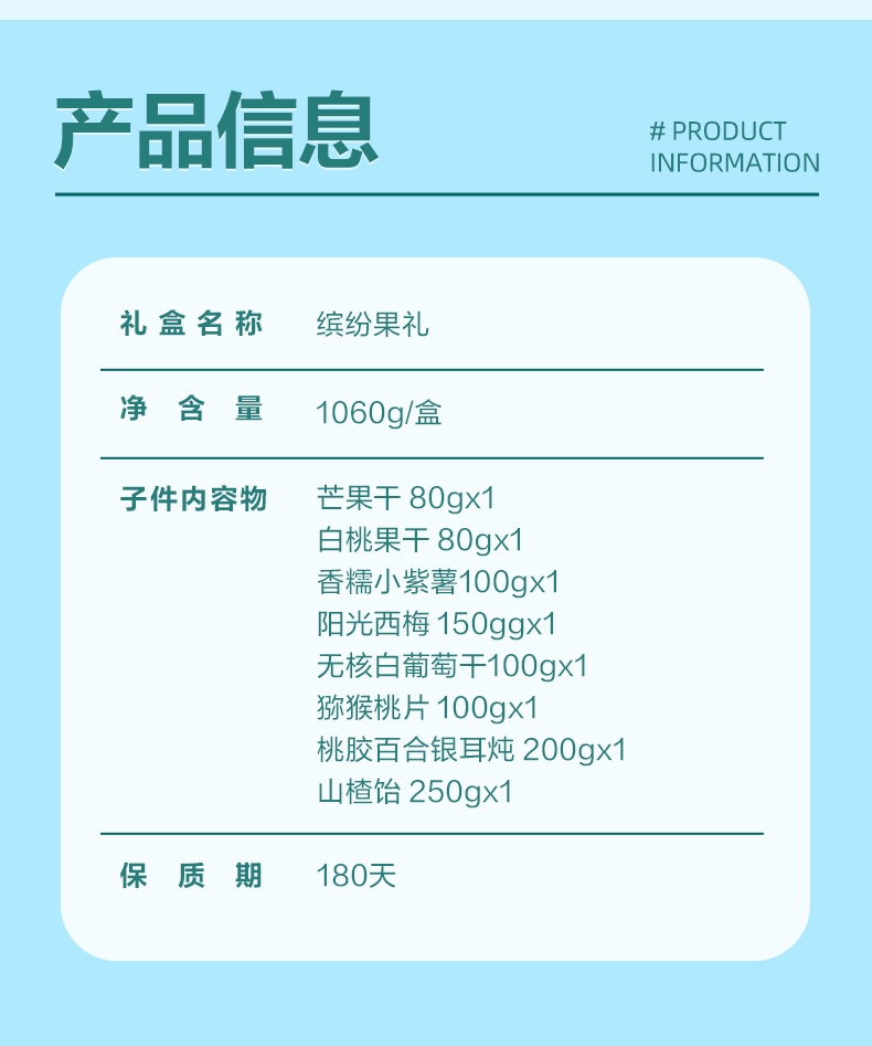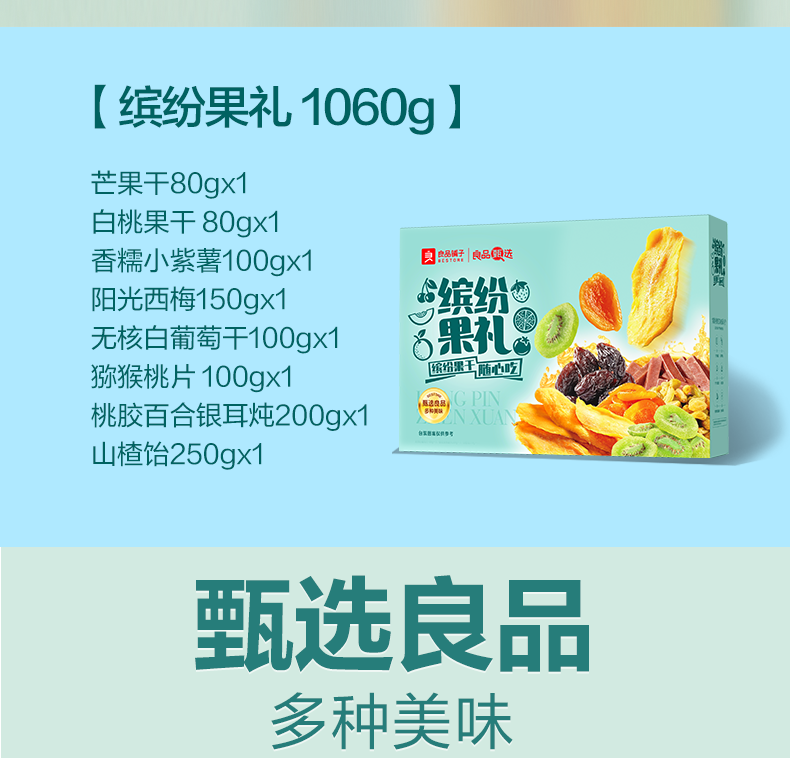 内配:芒果干(80g) 白桃果干80g 紫薯仔(100G) 阳光西梅150g 无核白葡萄干100g 猕猴桃片(100g) 椰果黄桃罐头 山楂饴250g