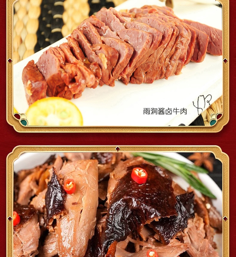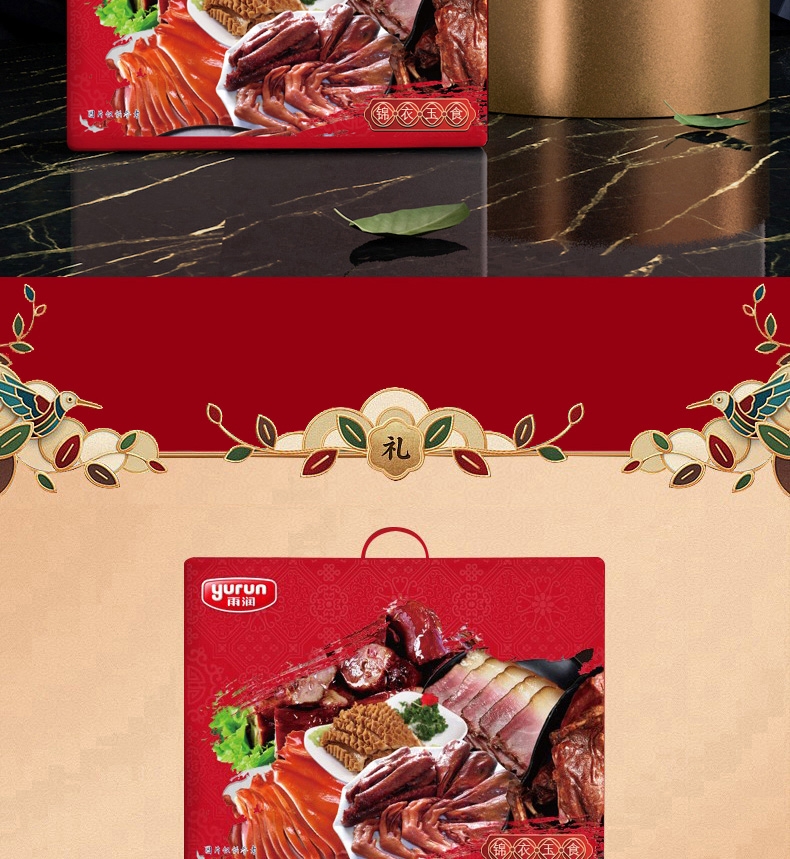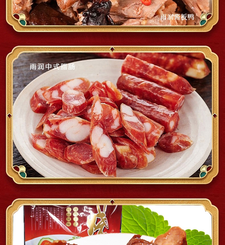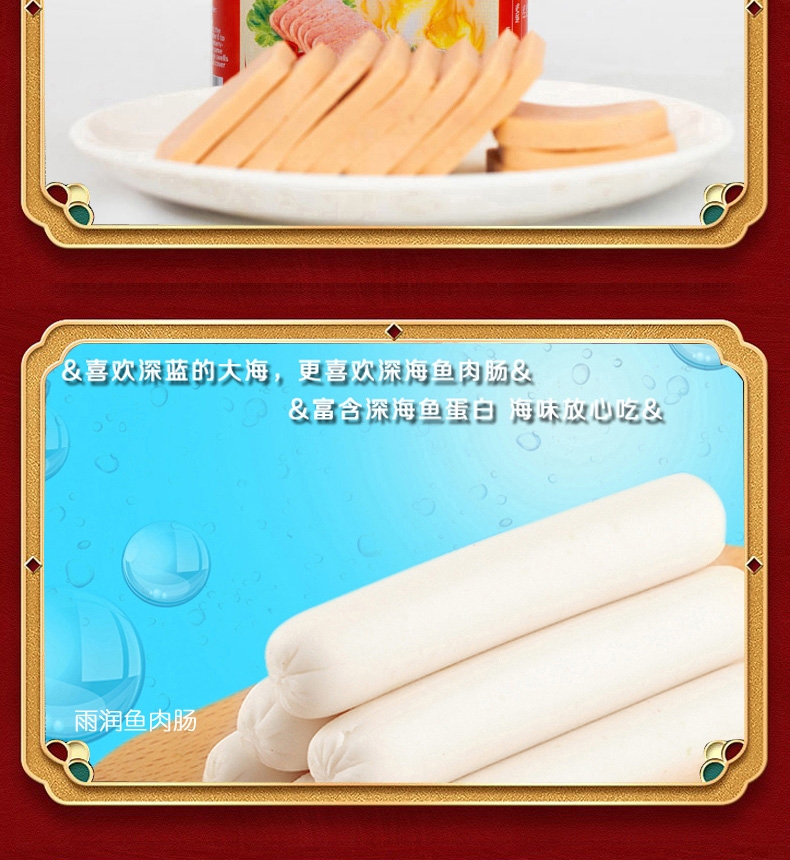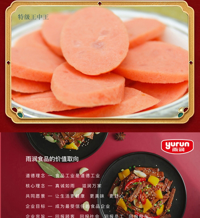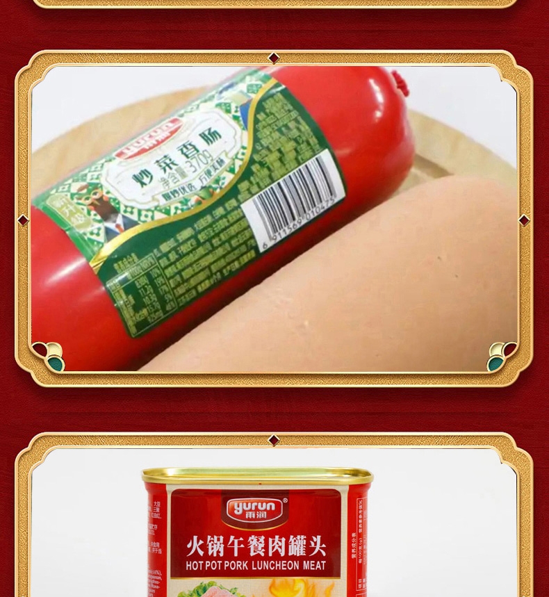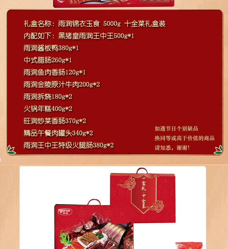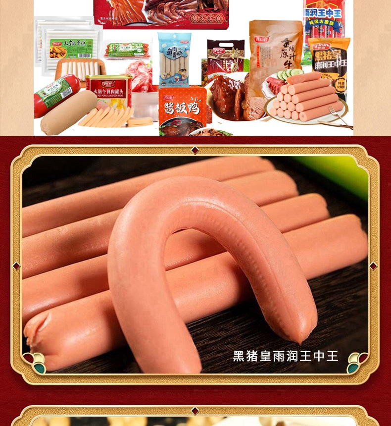 配置:黑猪皇雨润王中王500g*1 雨润酱板鸭380g*1 中式腊肠260g*1 雨润鱼肉香肠120g*1 雨润金陵原汁牛肉200g*2 雨润拆烧180g*2 火锅年糕400g*2 旺润炒菜香肠370g*2 精品午餐肉罐头340g*2 雨润王中王特级火腿肠380g*2