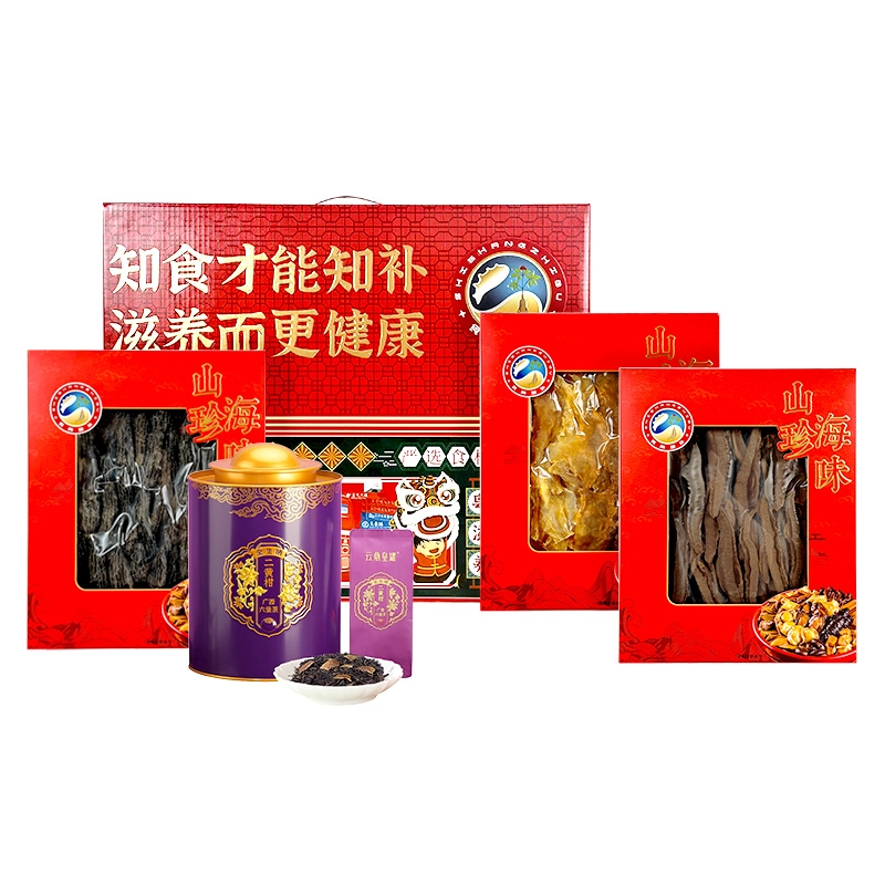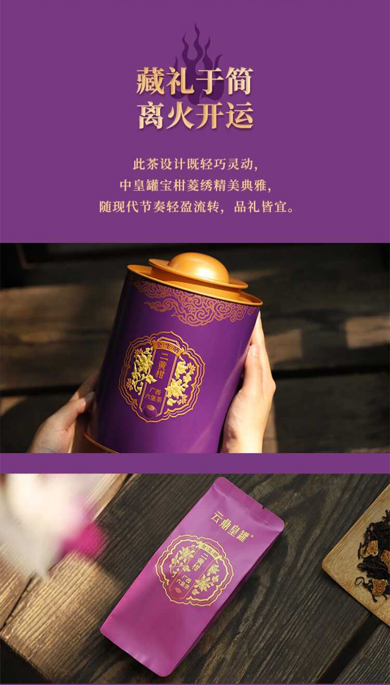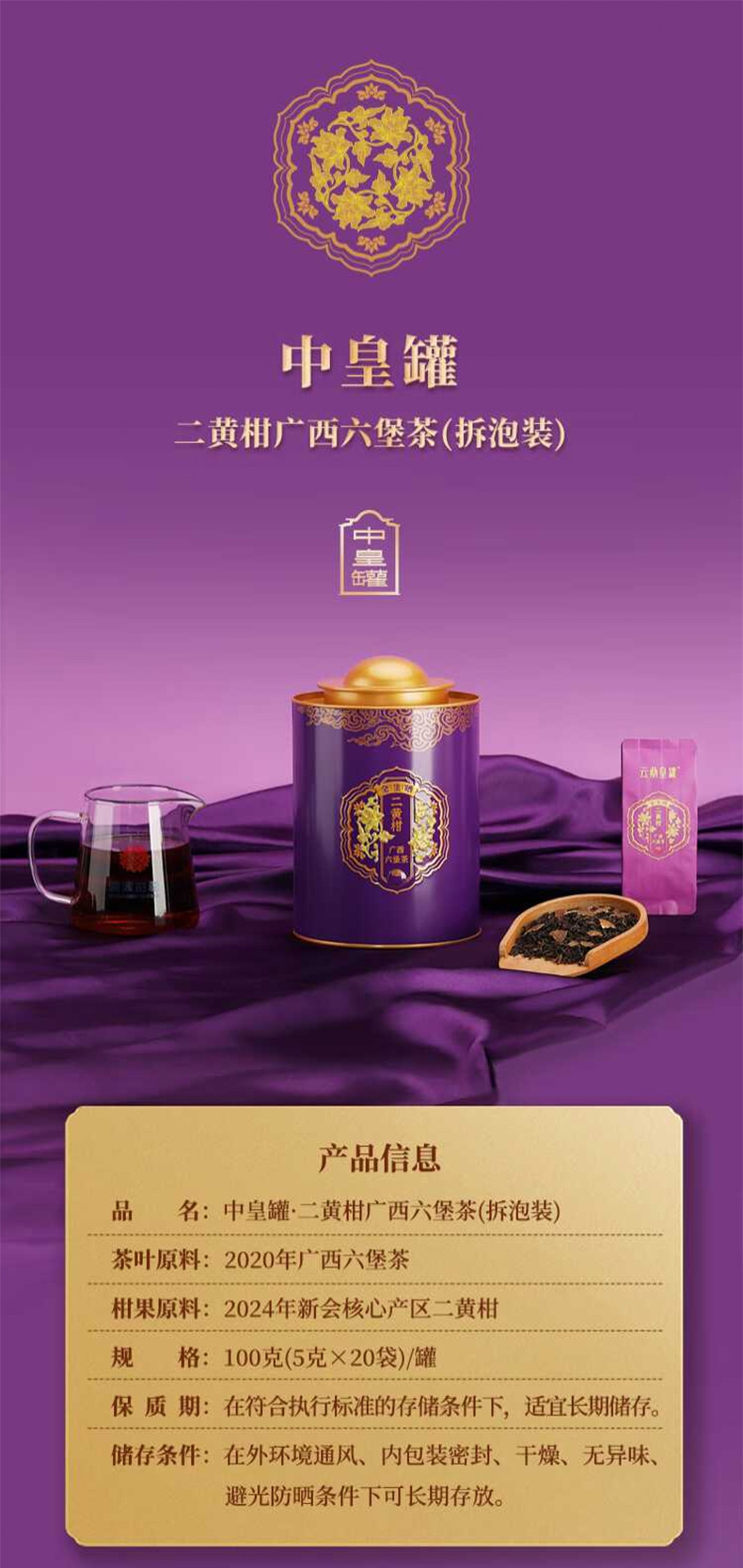 配置清单:中皇罐二黄柑广西六堡茶(拆泡装)100克、鳕鱼胶150克(60头)、羊肚菌60克、紫灵芝150克