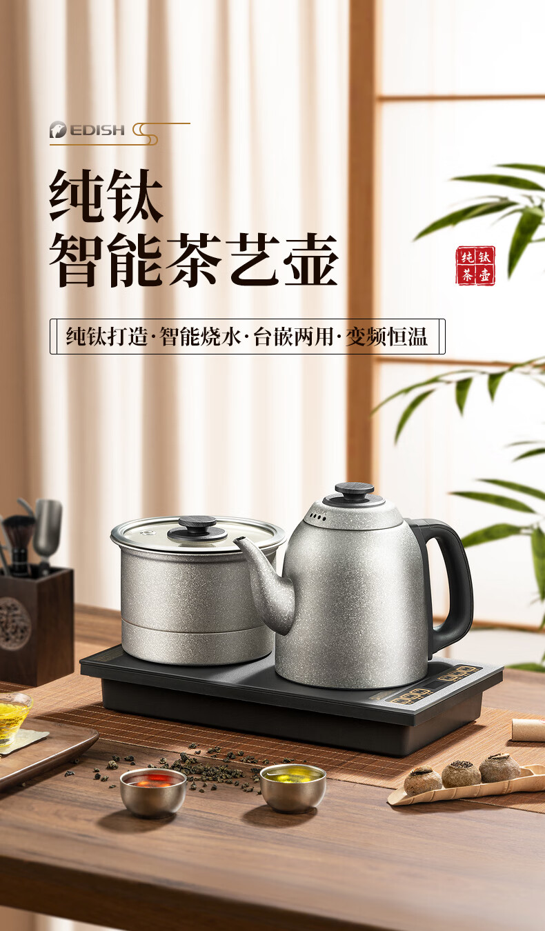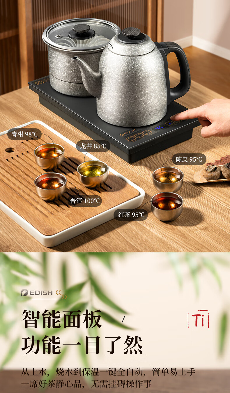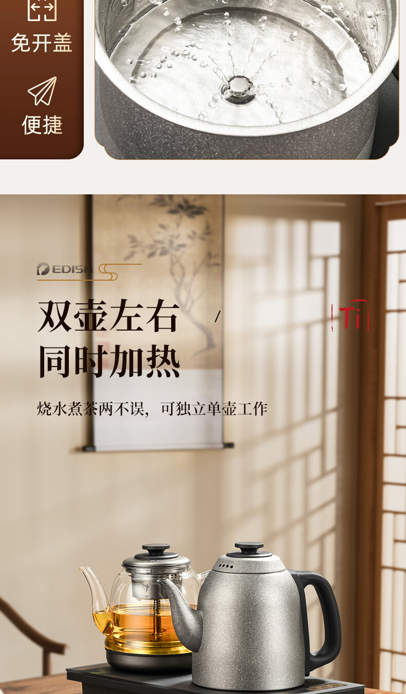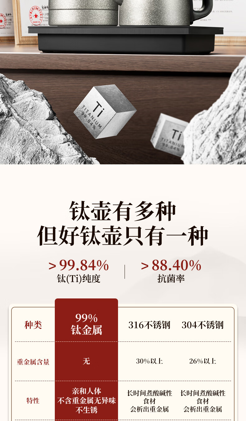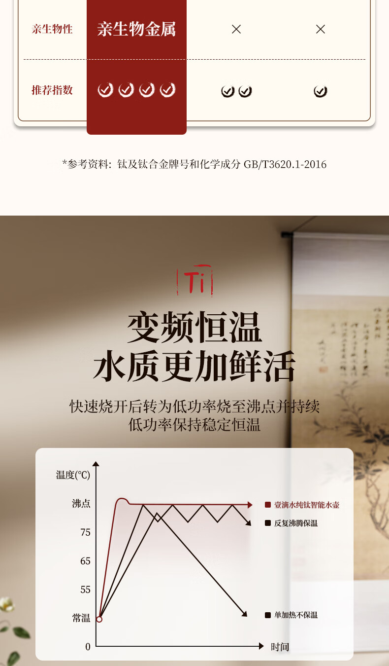 内外99.8%纯钛、;抑制多种细菌滋生、保鲜饮品不变味;壶内上水、变频恒温、水质更加鲜活;多重防干烧保护、可视智能显温面板;保鲜饮品不变味、安全健康