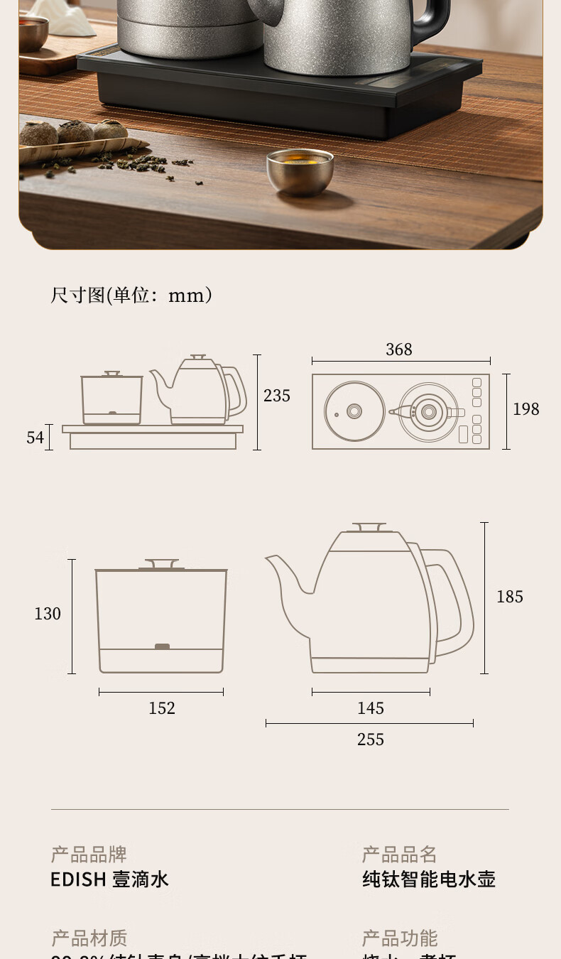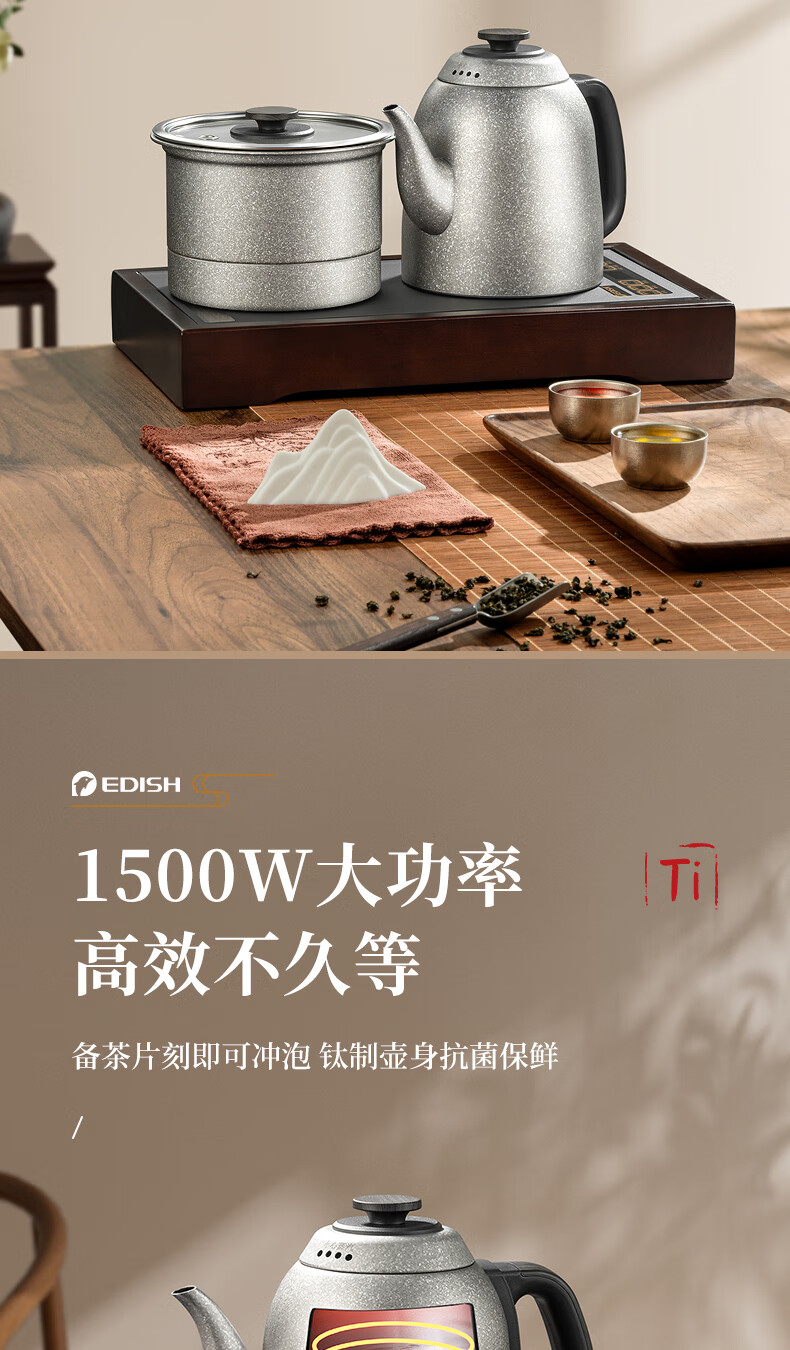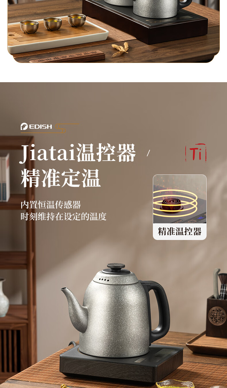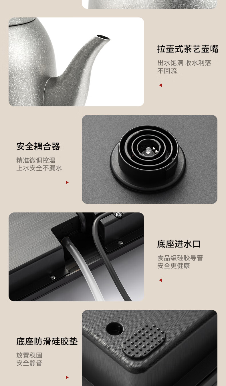 内外99.8%纯钛、;抑制多种细菌滋生、保鲜饮品不变味;壶内上水、变频恒温、水质更加鲜活;多重防干烧保护、可视智能显温面板;保鲜饮品不变味、安全健康