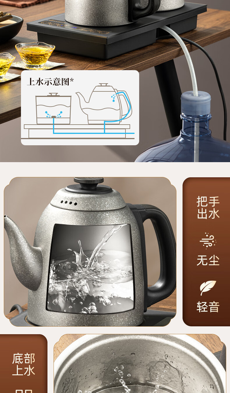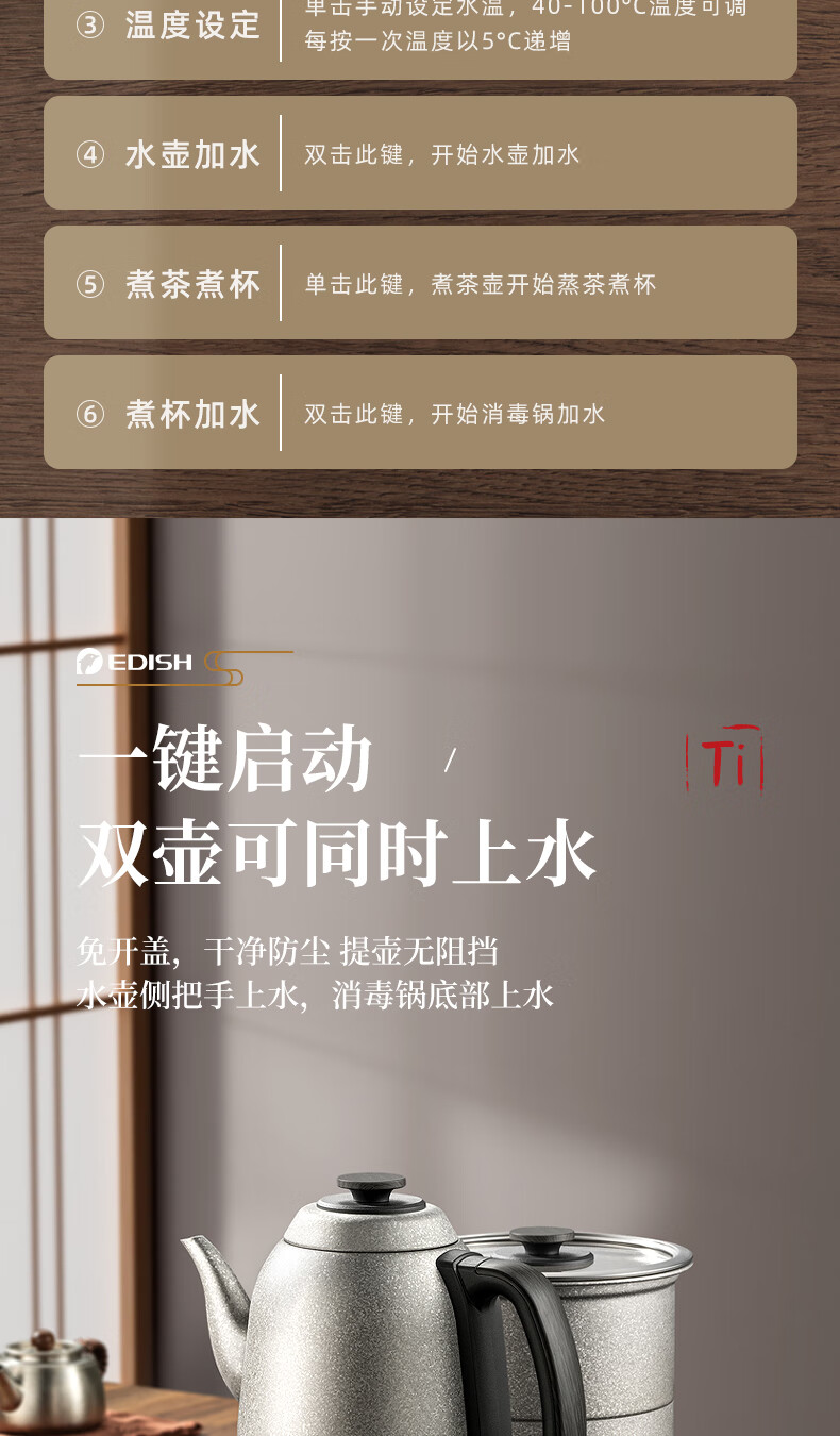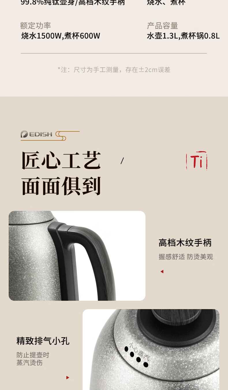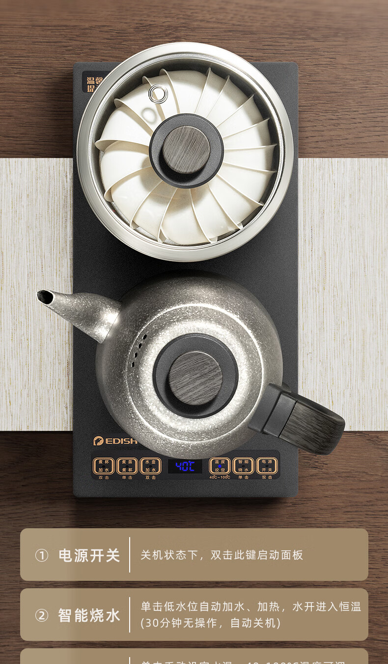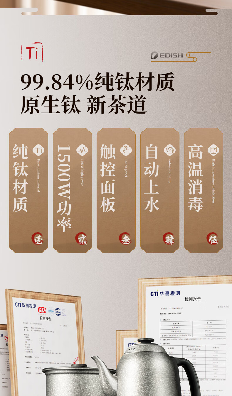 内外99.8%纯钛、;抑制多种细菌滋生、保鲜饮品不变味;壶内上水、变频恒温、水质更加鲜活;多重防干烧保护、可视智能显温面板;保鲜饮品不变味、安全健康