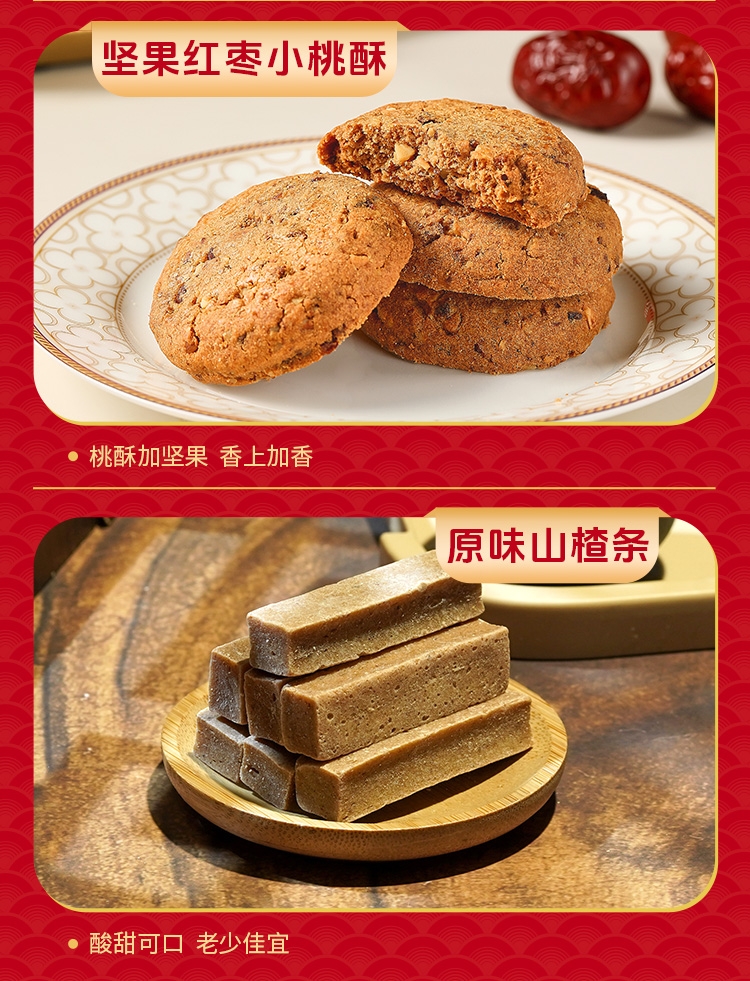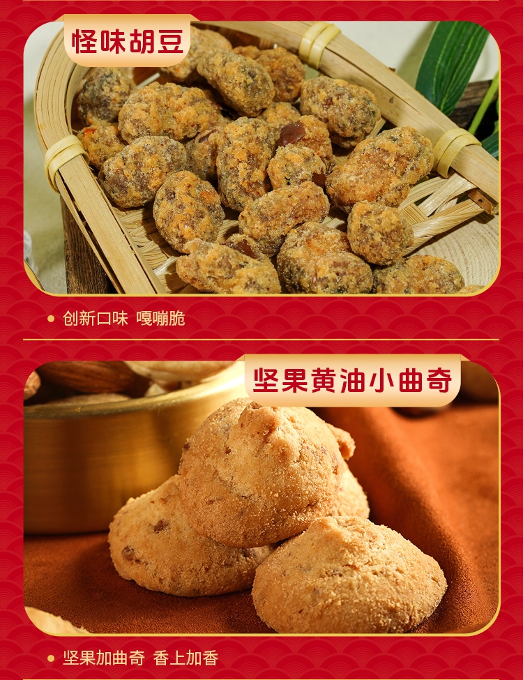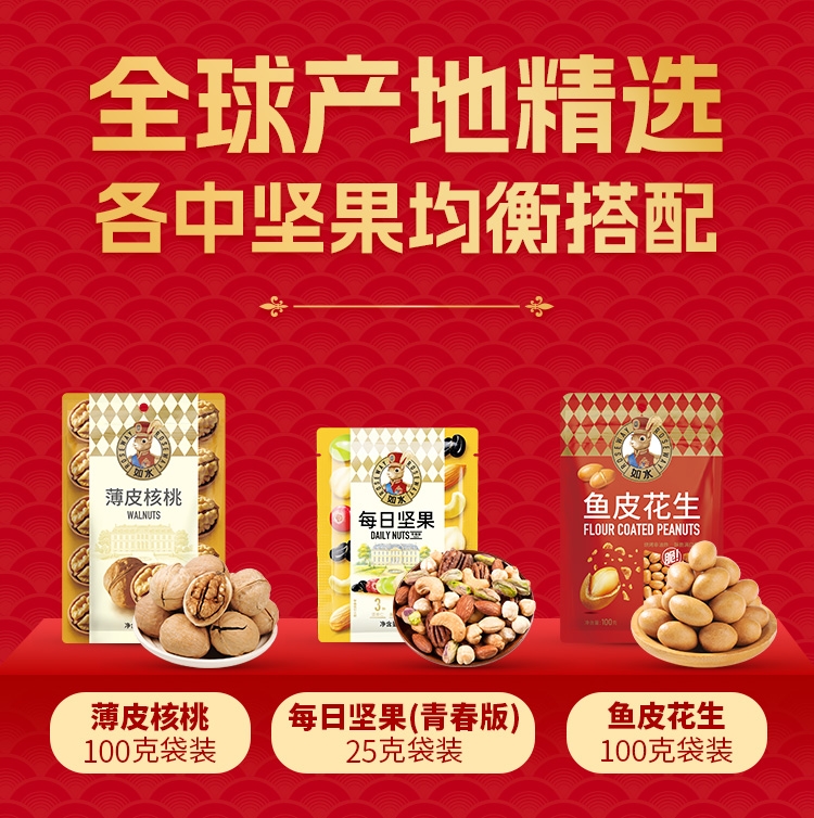 如水坚果全球原产地直采,只挑 选高等级高品质原材料;4种坚果炒货+1种蜜饯 +1种酥糖+1种曲奇;美好寓意:“红运”即好运、旺运.