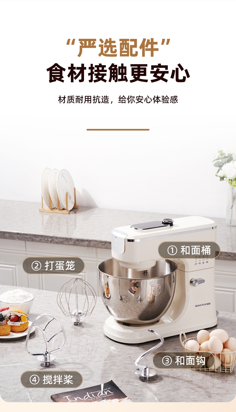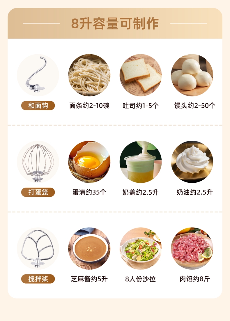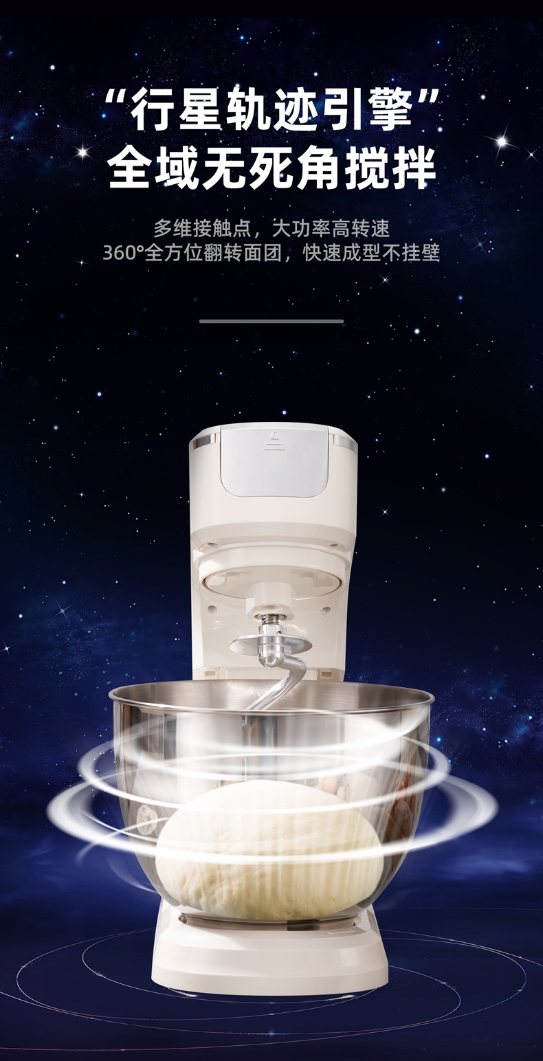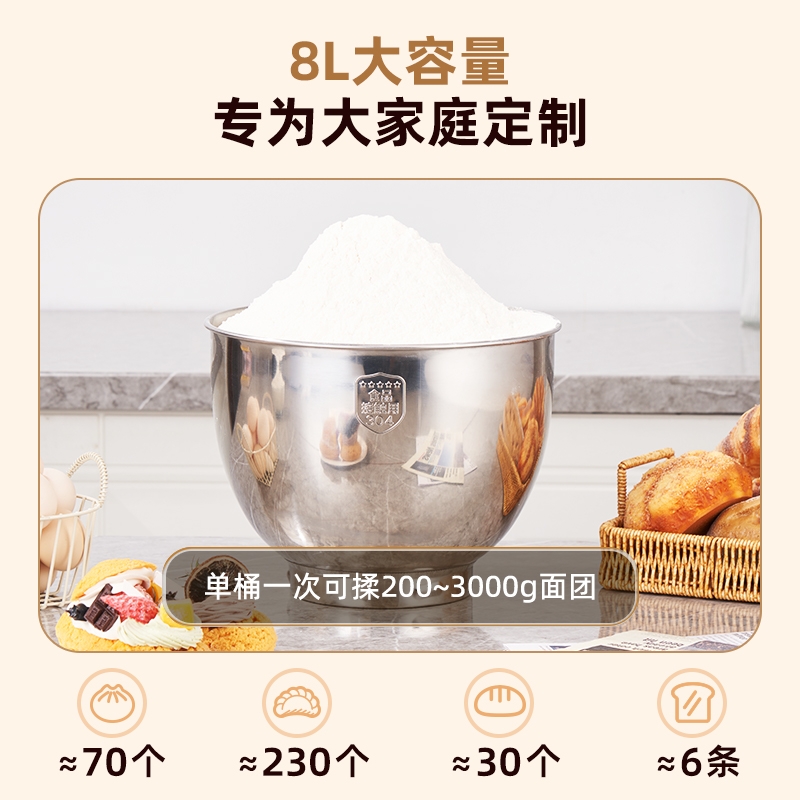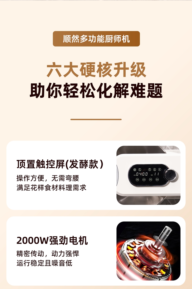 配置清单:2000W大功率,动力足,快速揉好各种面团。 304 不锈钢材质,模拟专业手法 11 档灵活调速,大容量,满足多口之家或私房烘焙需求。 顶部触控屏,定时恒温发酵,揉面发酵一体化。 底部 6 个吸盘,揉面时稳固机身,减少震动噪音 可选配扩展配件,解锁更多面条玩法