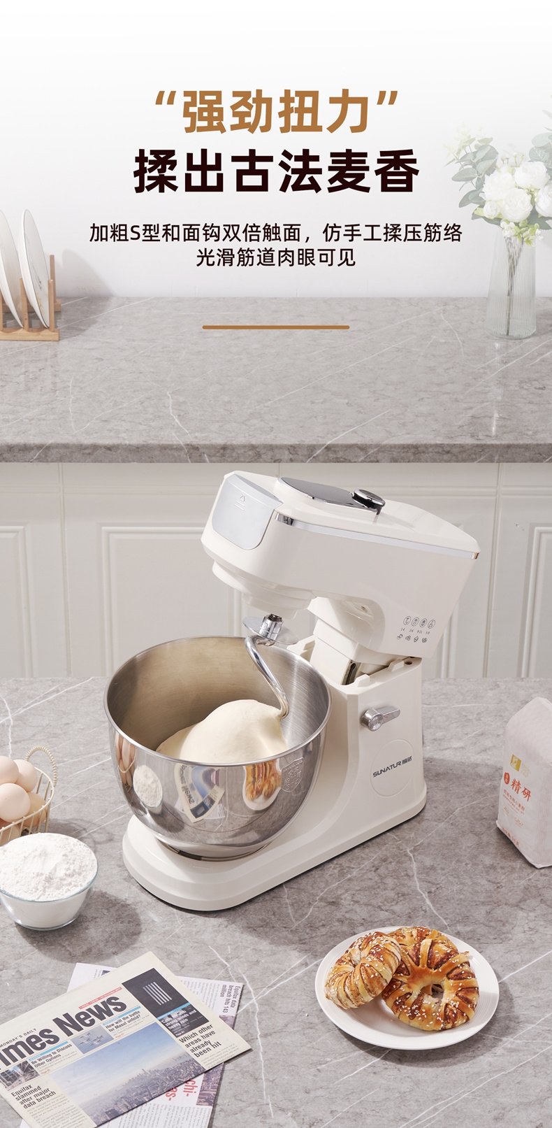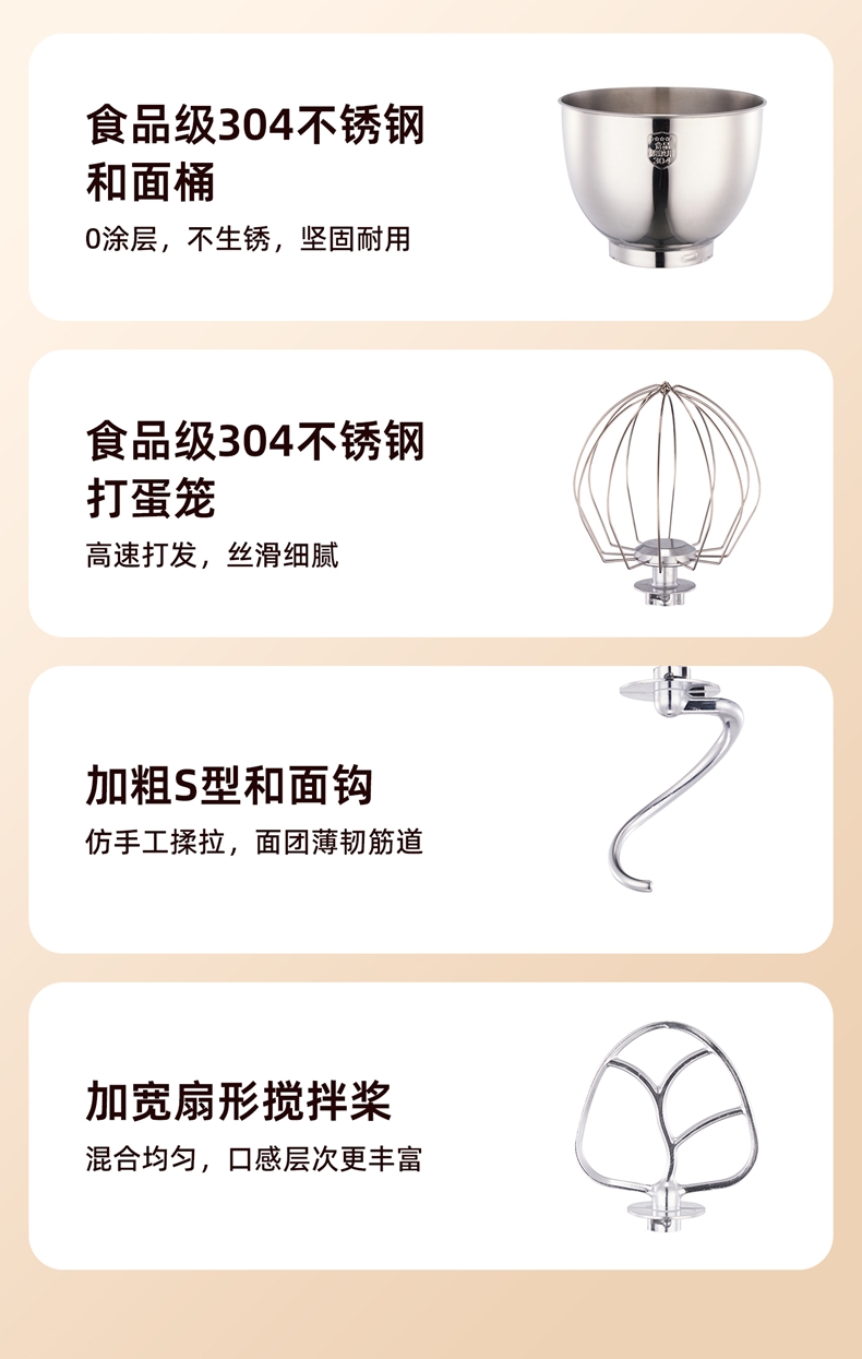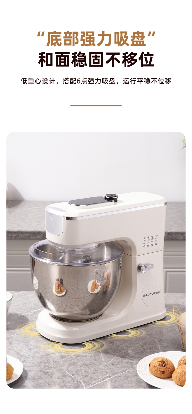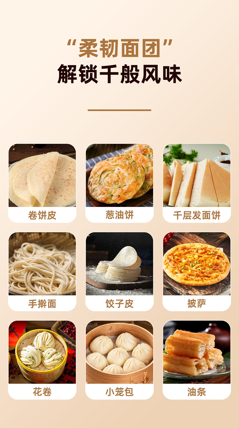 配置清单:2000W大功率,动力足,快速揉好各种面团。 304 不锈钢材质,模拟专业手法 11 档灵活调速,大容量,满足多口之家或私房烘焙需求。 顶部触控屏,定时恒温发酵,揉面发酵一体化。 底部 6 个吸盘,揉面时稳固机身,减少震动噪音 可选配扩展配件,解锁更多面条玩法
