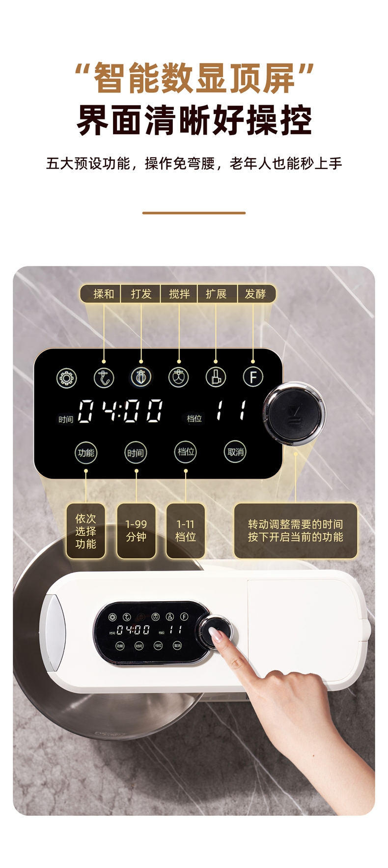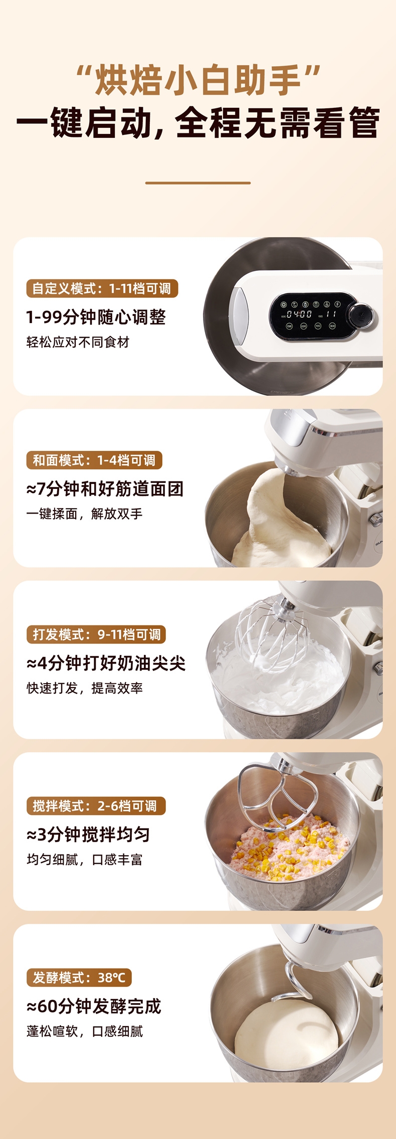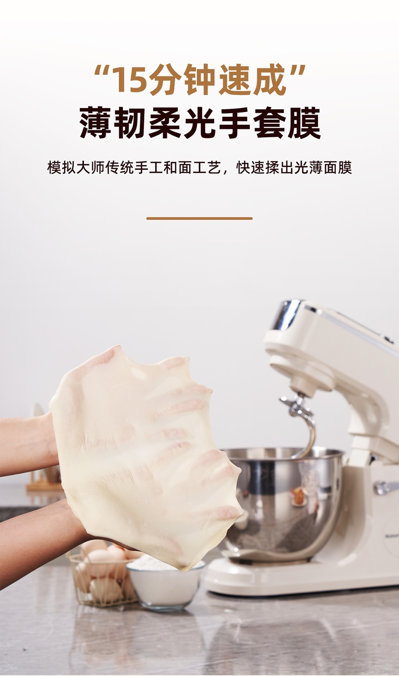 多档调速:11 档灵活调速,适配不同揉面阶段与面团;定时恒温发酵,揉面发酵一体化。;支持扩展配件,可以另购配件,解锁增加玩法!