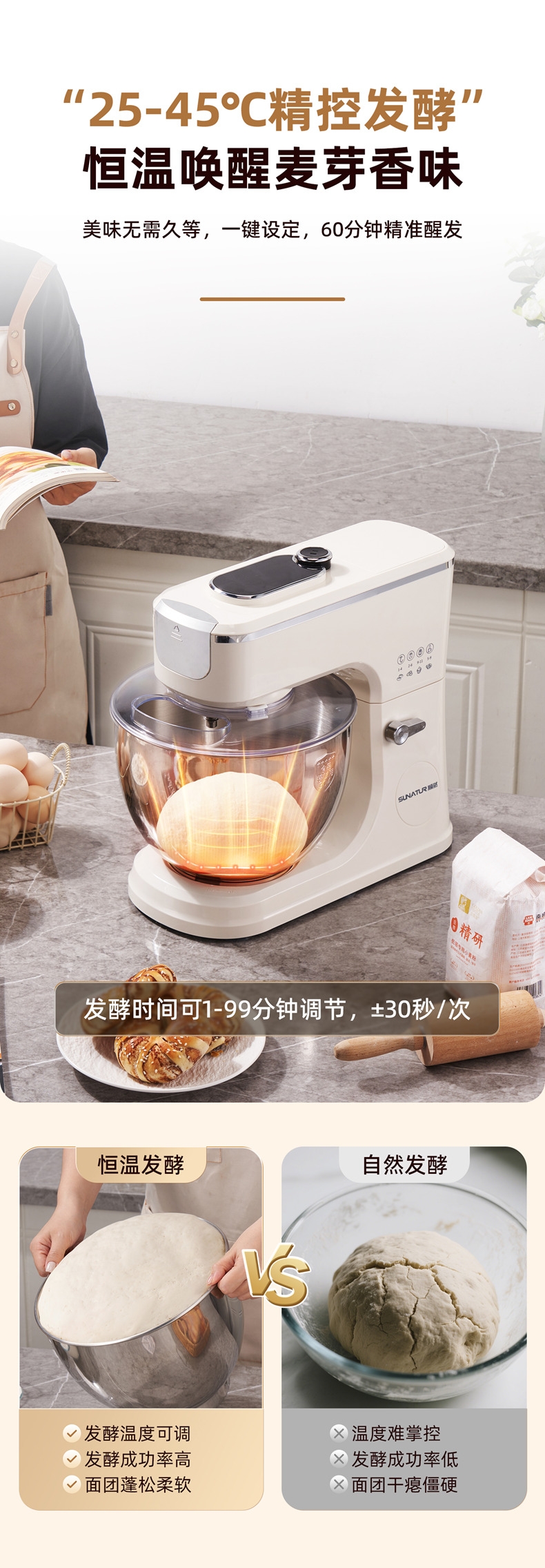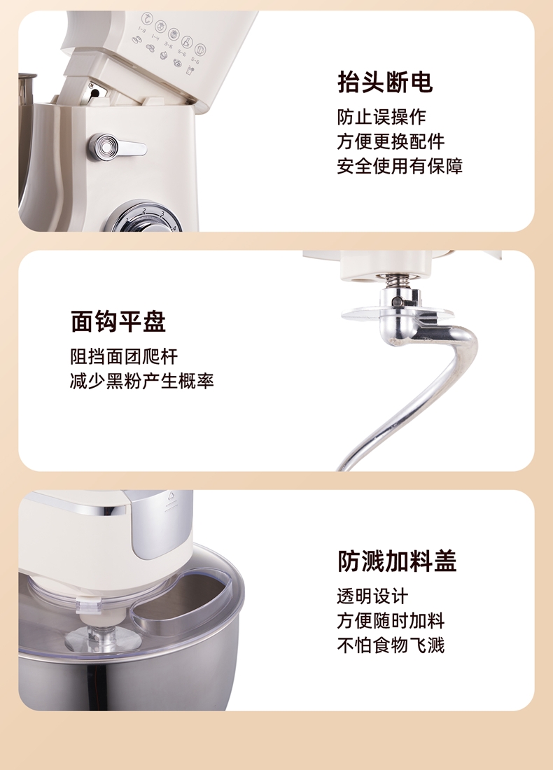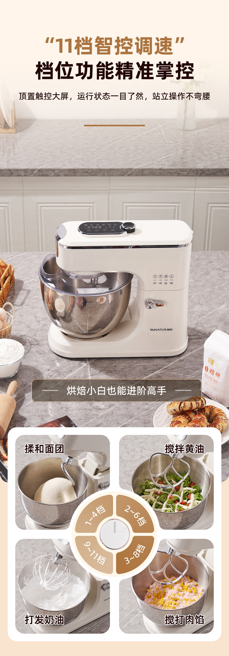 多档调速:11 档灵活调速,适配不同揉面阶段与面团;定时恒温发酵,揉面发酵一体化。;支持扩展配件,可以另购配件,解锁增加玩法!