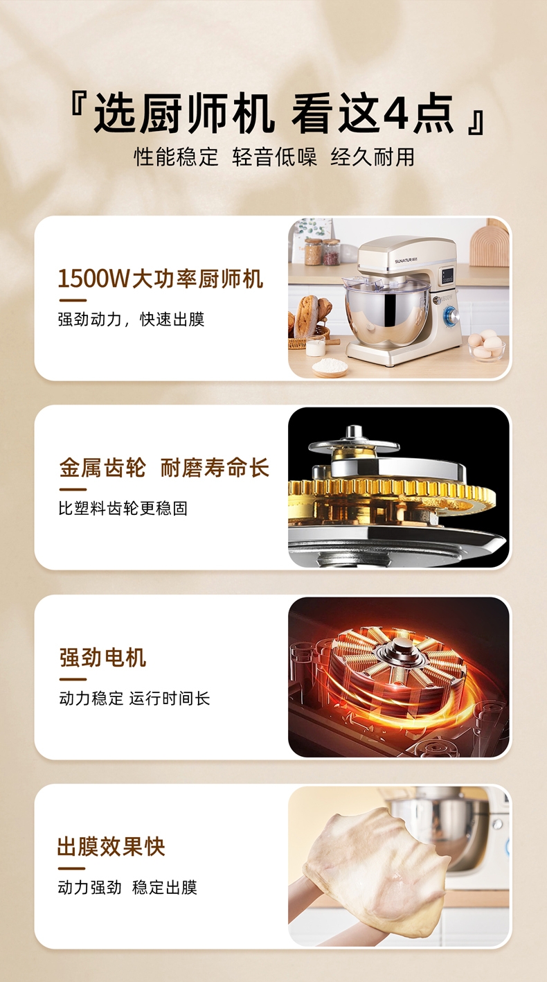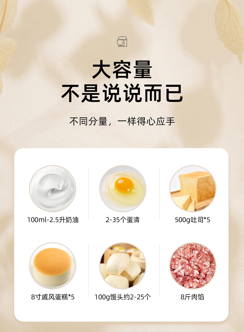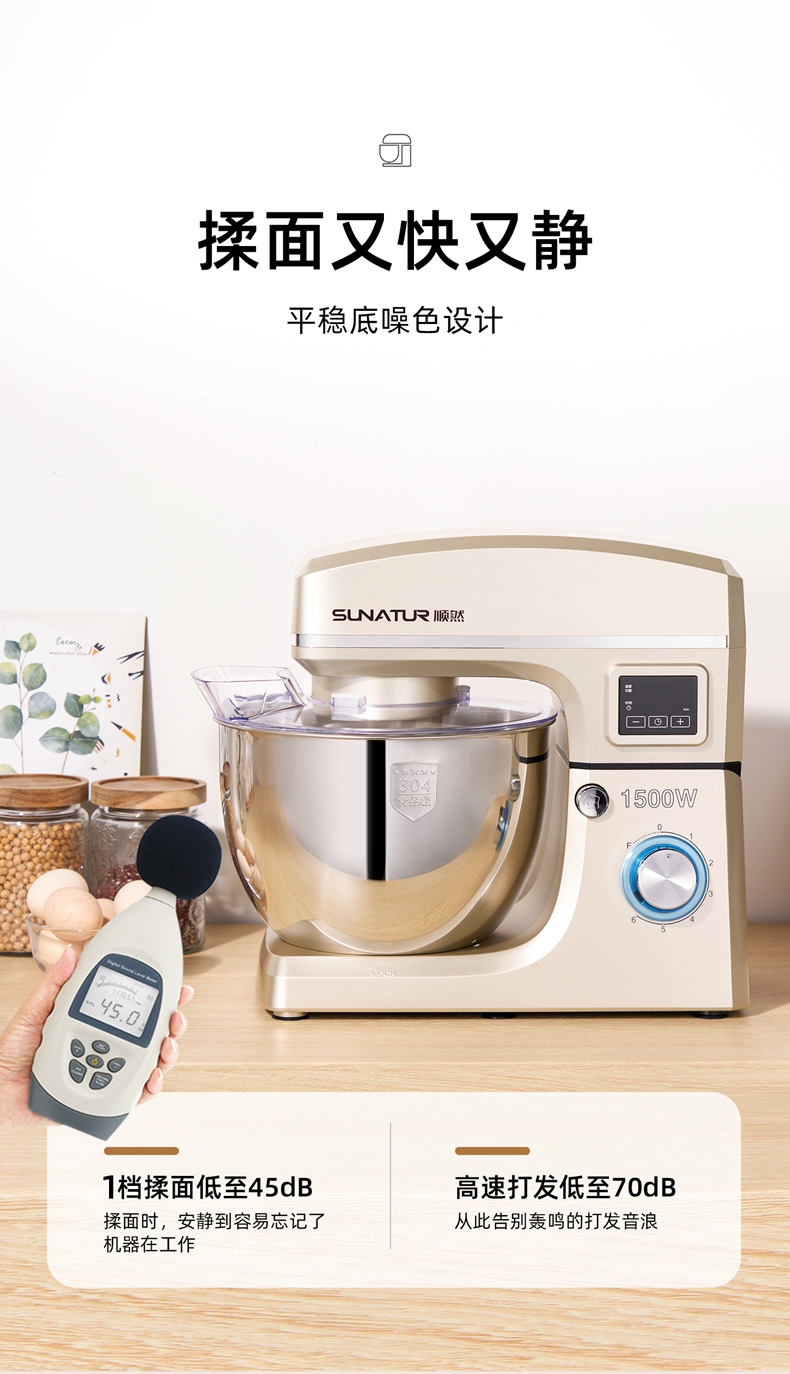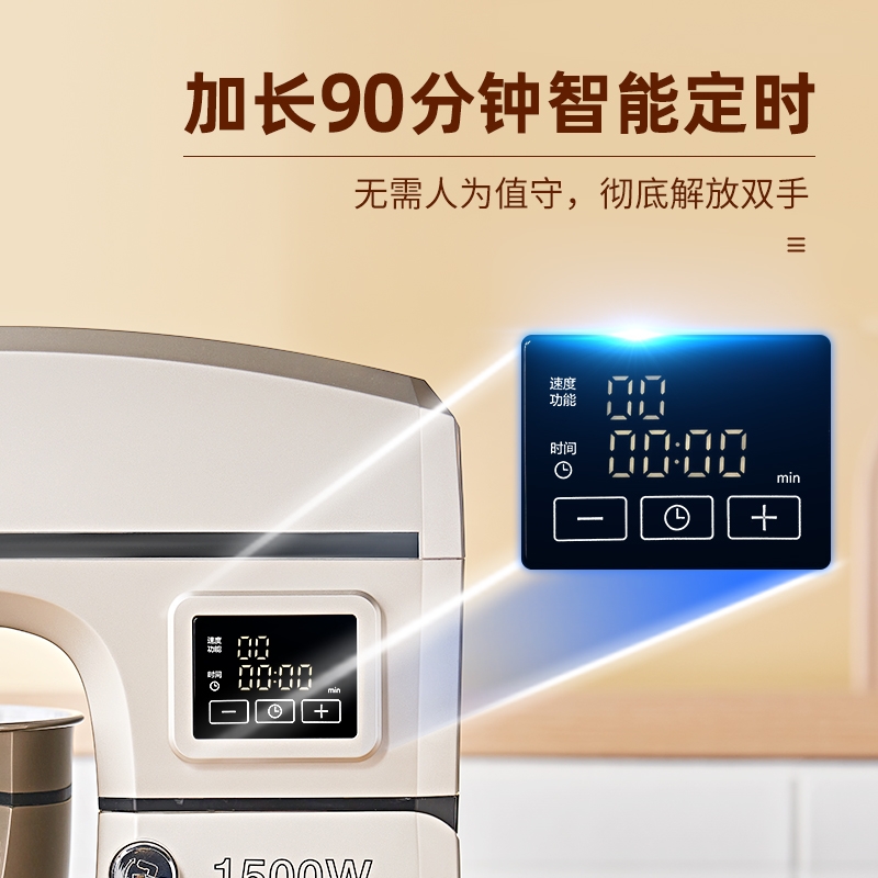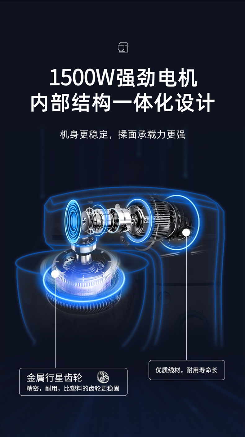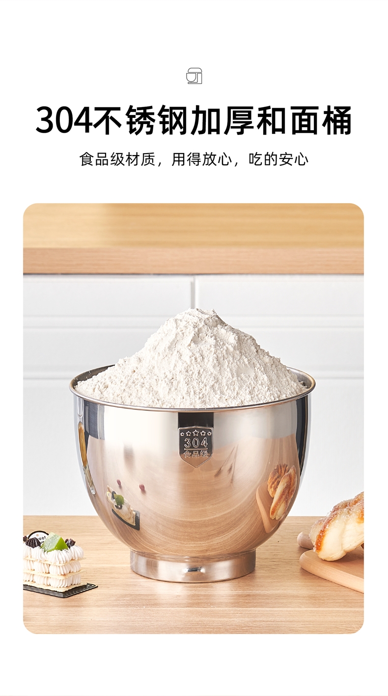 8升大容量 1500W大功率 304不锈钢桶;1500w大功率电机,大功率和面打发快;加固吸盘底座,防滑防晃动 定时发酵功能