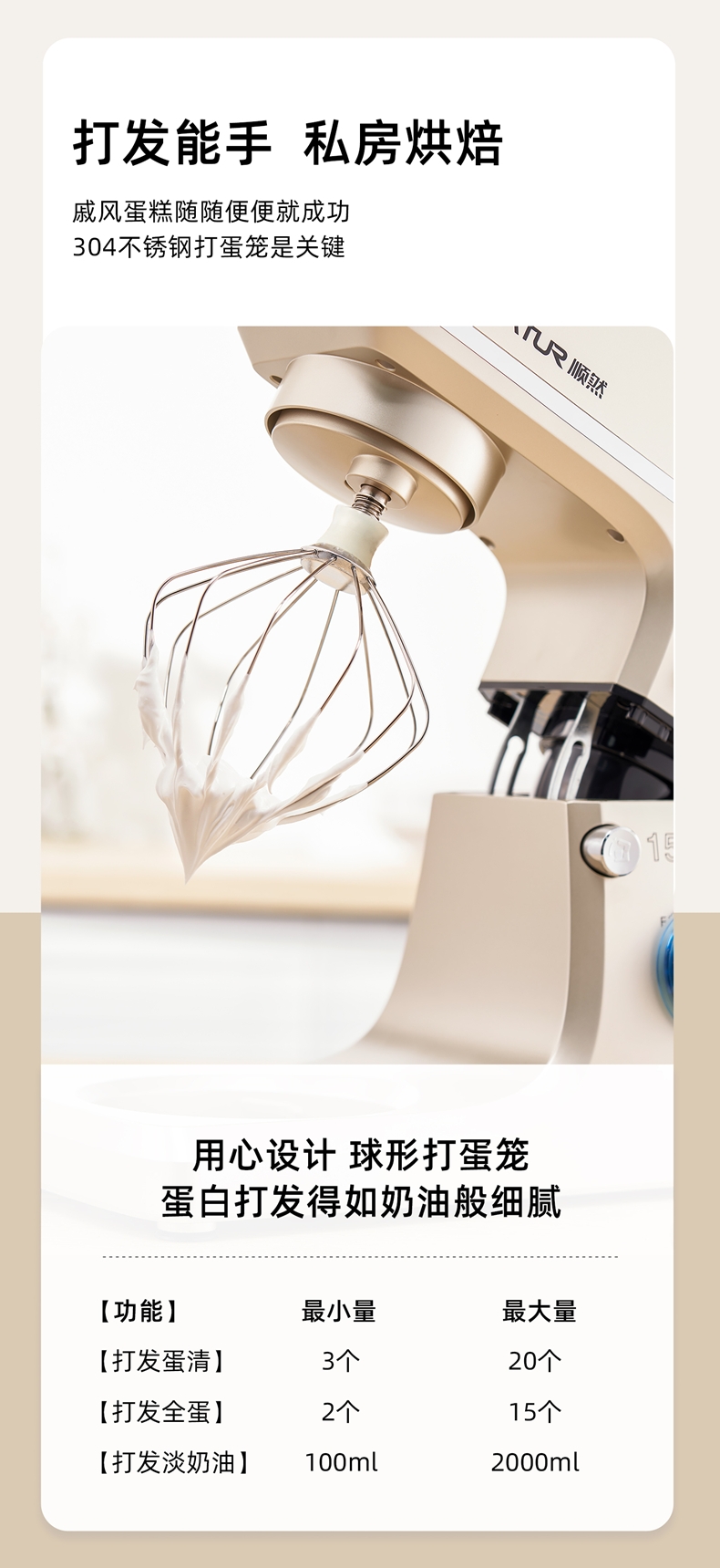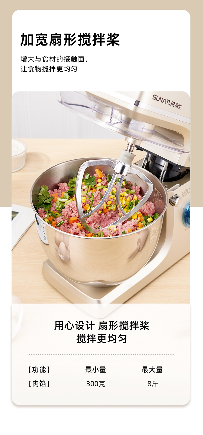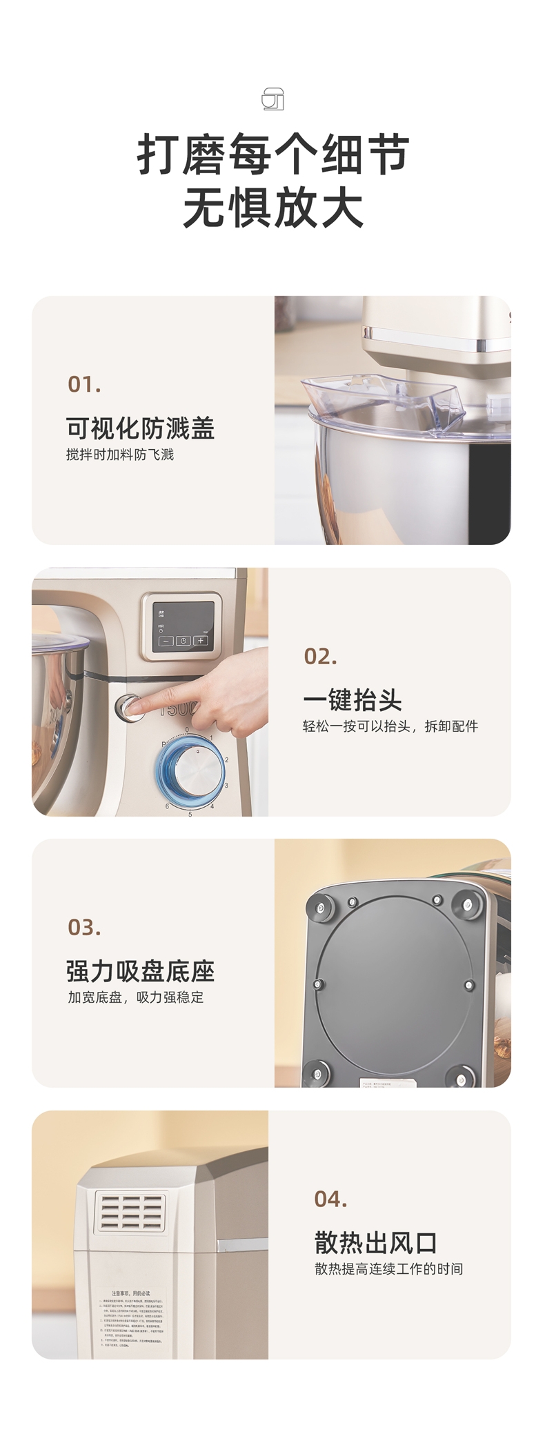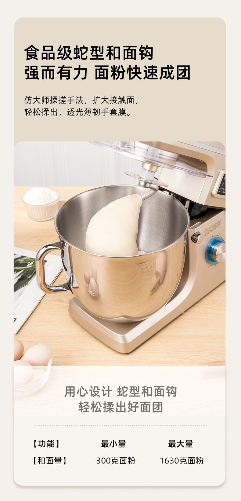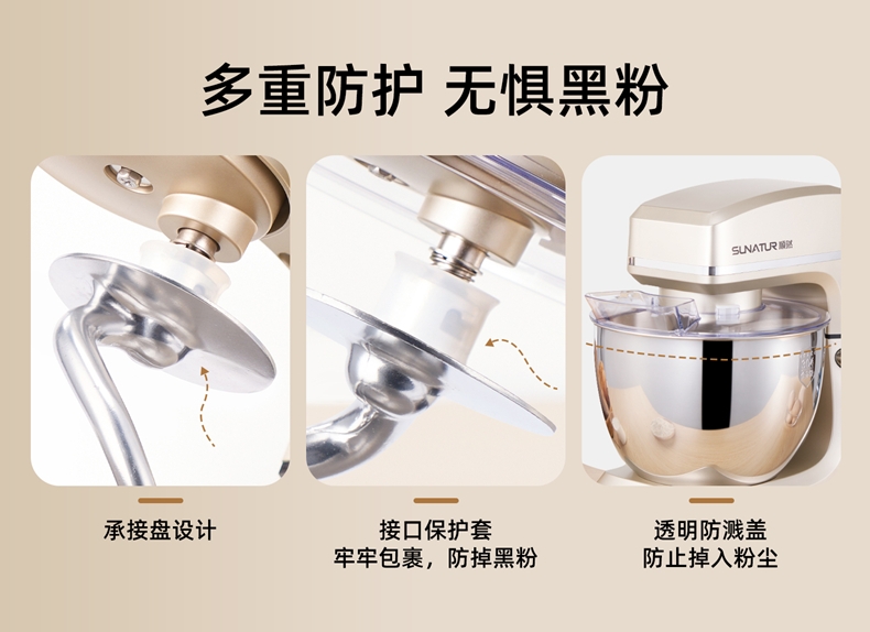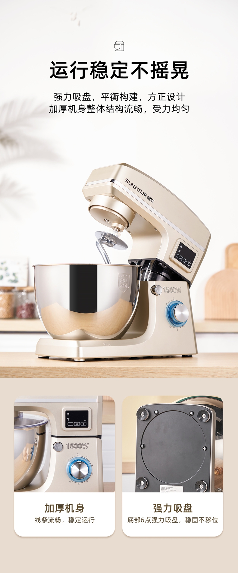 8升大容量 1500W大功率 304不锈钢桶;1500w大功率电机,大功率和面打发快;加固吸盘底座,防滑防晃动 定时发酵功能