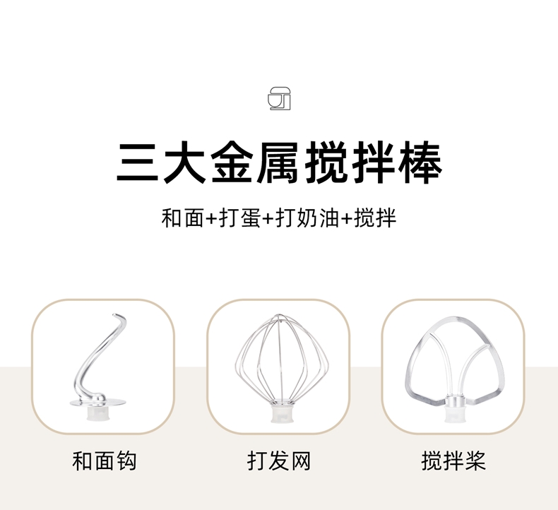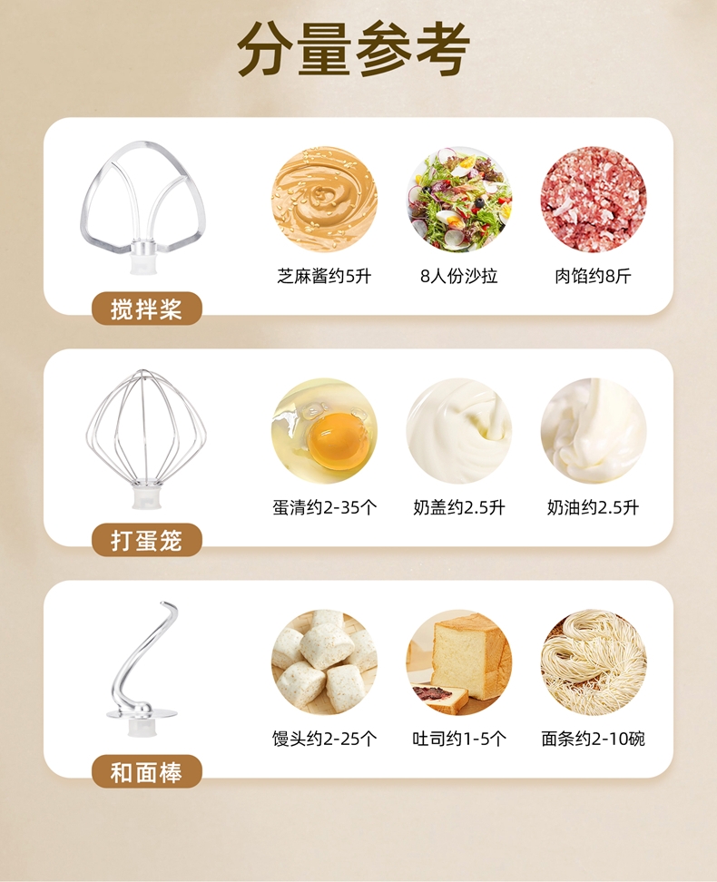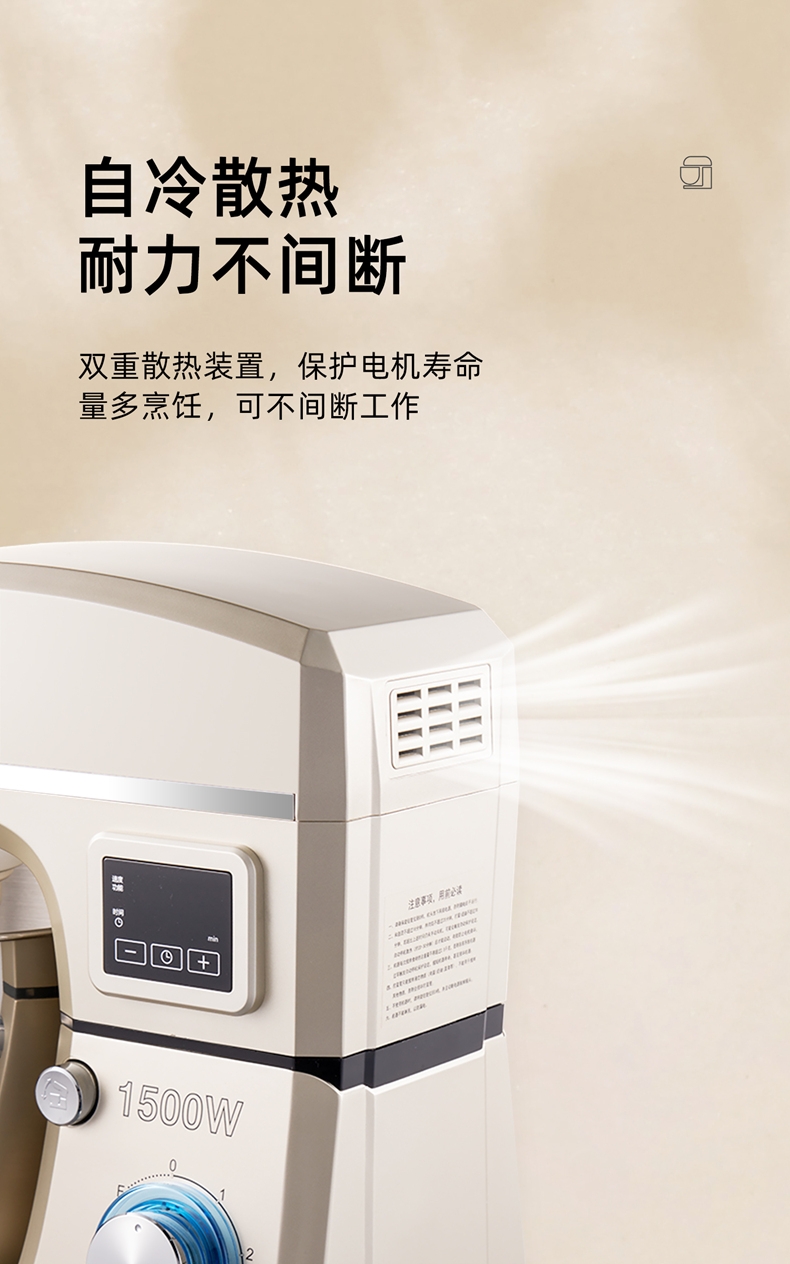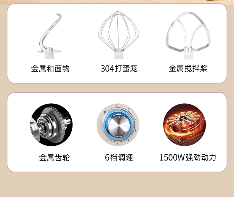 配置清单:1500w大功率电机,大功率和面快 打发快 8升 容量家商两用,可和5斤面团,打发2500ml奶油,30个鸡蛋 3大配件,6档位随心操作,可视化防溅盖中途加料不费劲 一键抬头设计,抬头即断电,加固吸盘底座,防滑防晃动 定时恒温发酵功能,面温控制25-38度发酵实现和面醒面一体