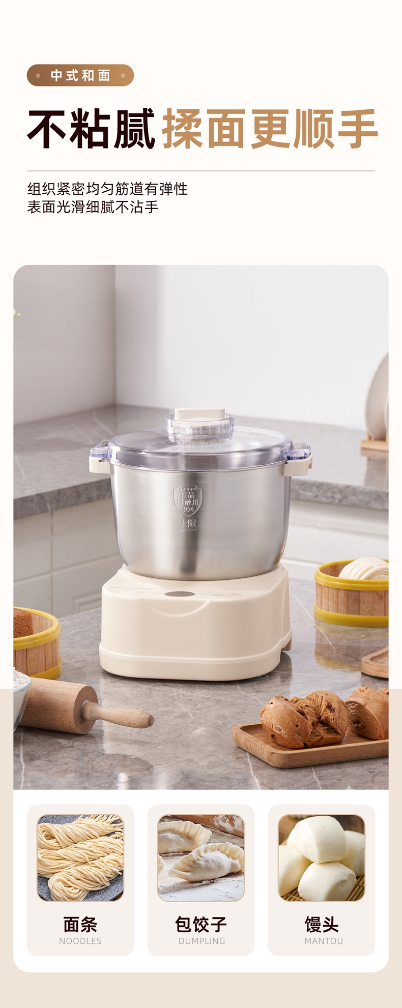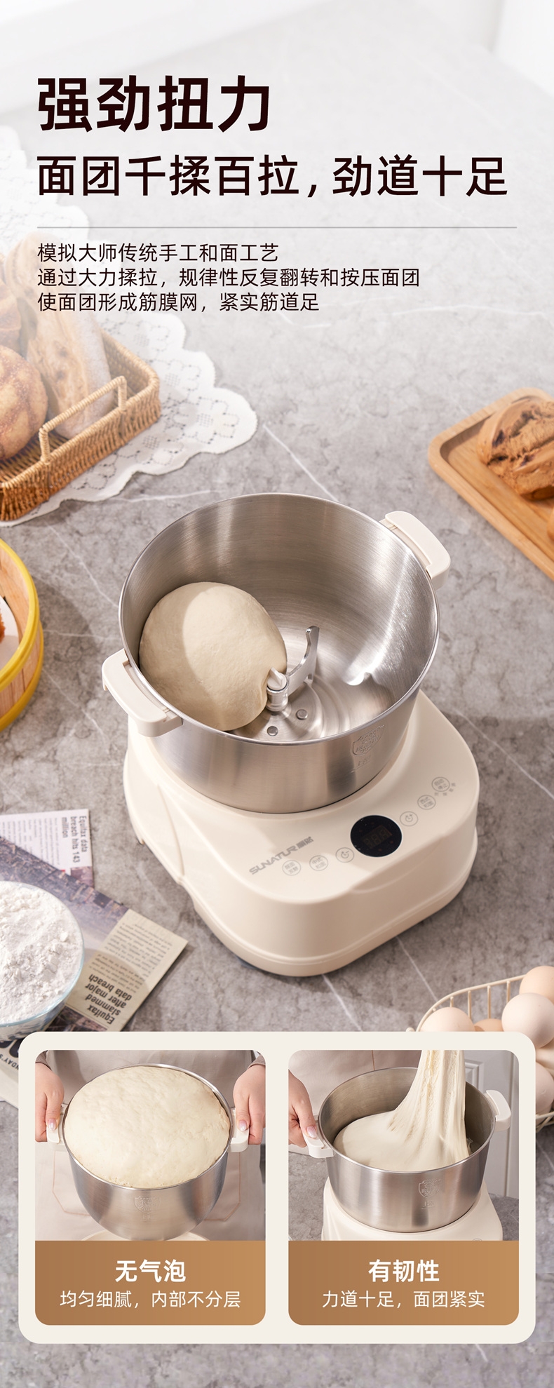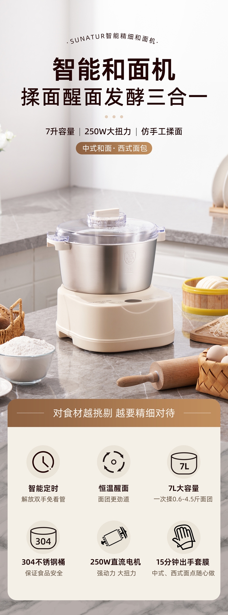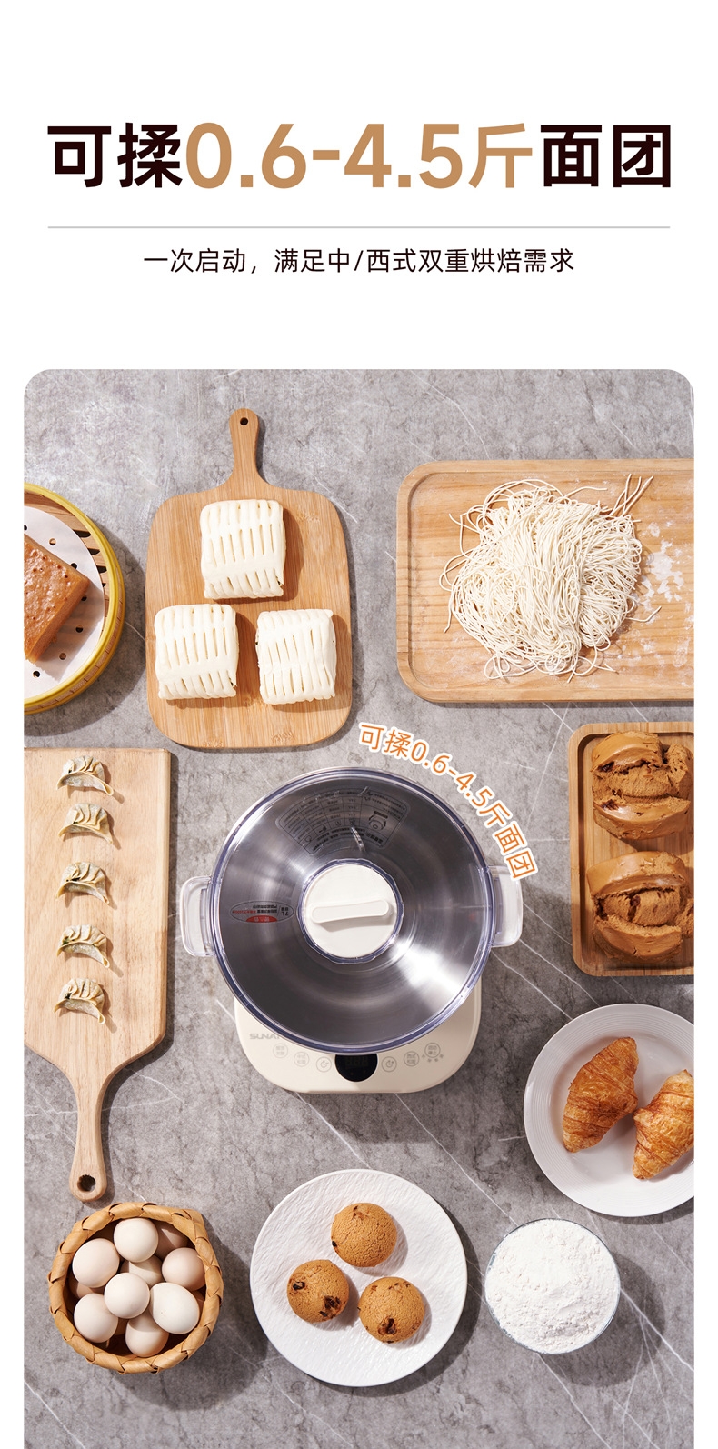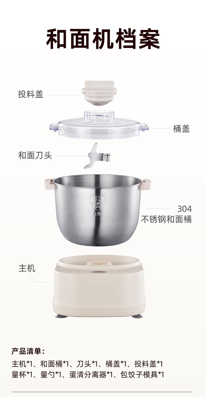 配置清单:功能多样:7升容量具备全自动和面、发酵、醒面功能,还可用于蛋清奶盖打发、搅拌肉馅等,能满足中西式面点制作需求。 智能便捷:带有微电脑定时功能,智能揉面 + 恒温醒面,无需人工长时间看管,省力又省心。 材质优良:食物接触材质为 304 不锈钢,坚固耐用且卫生健康,清洗方便;机身采用 ABS 材质,简约小巧。 动力强劲:250 瓦大动力电机,配合十字锥形盖,能轻松揉出 三光 面团,快速出膜。 噪音较小:直流轻音设计,运行时噪音低,不会对日常生活造成干扰。