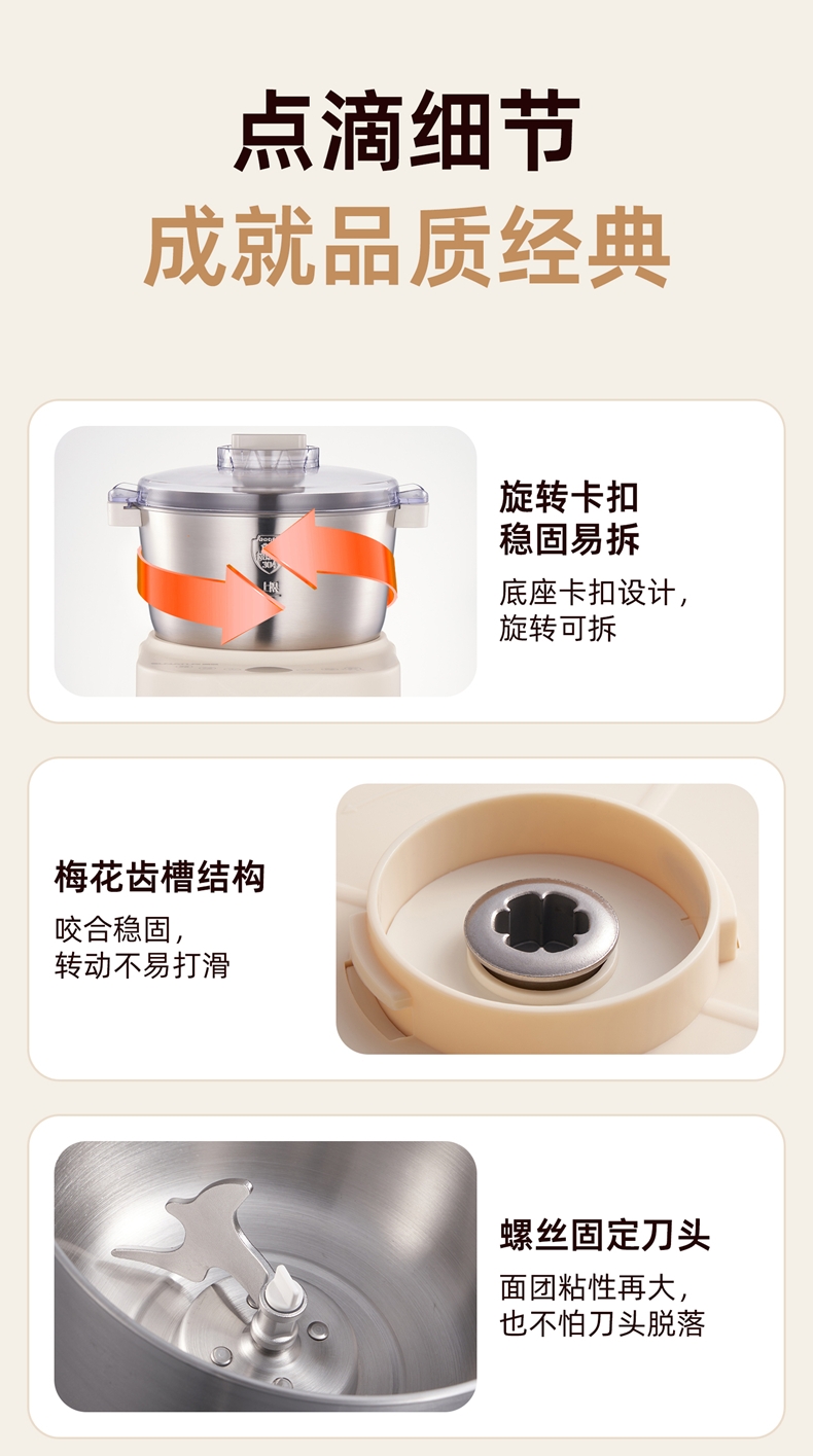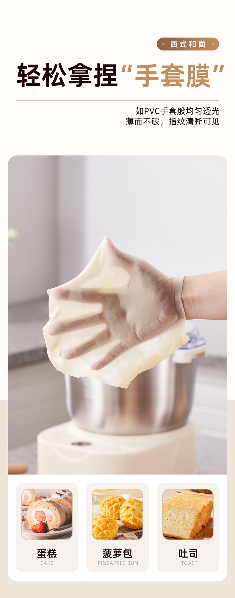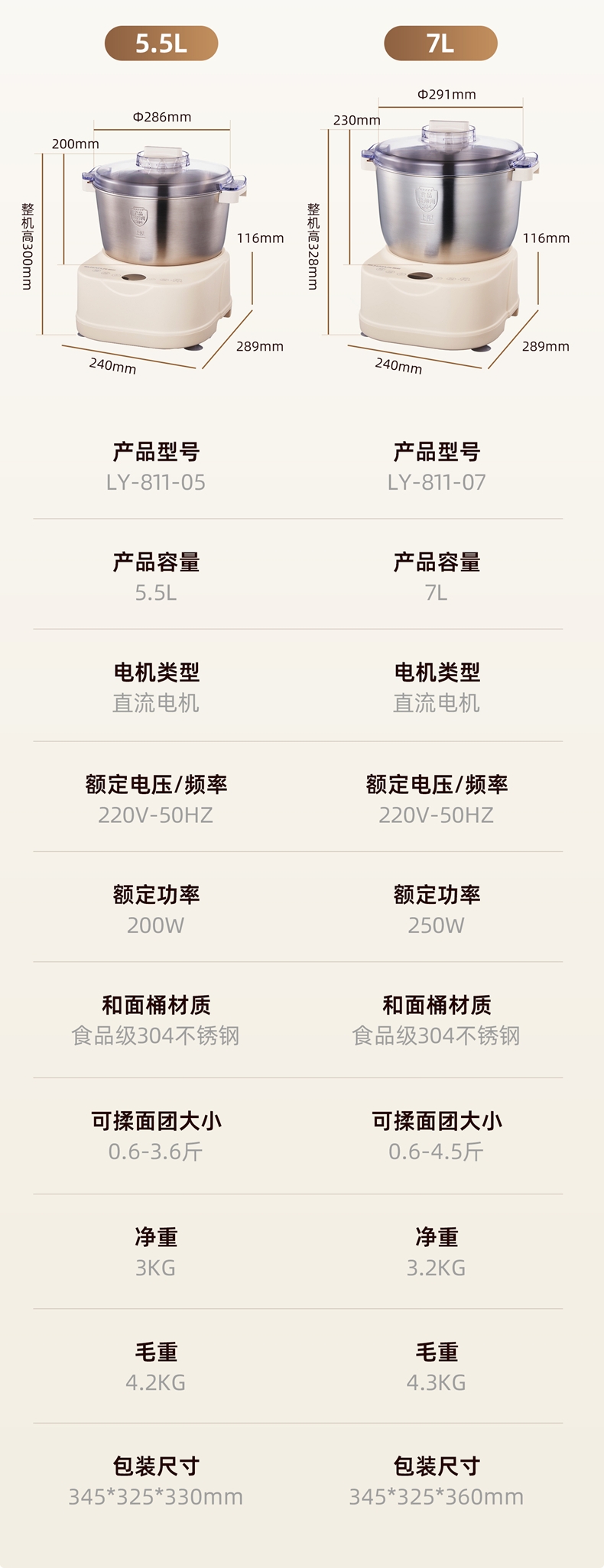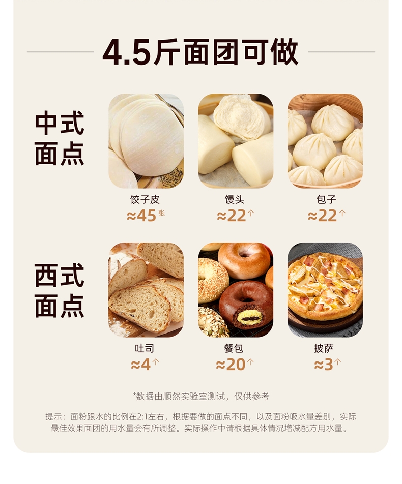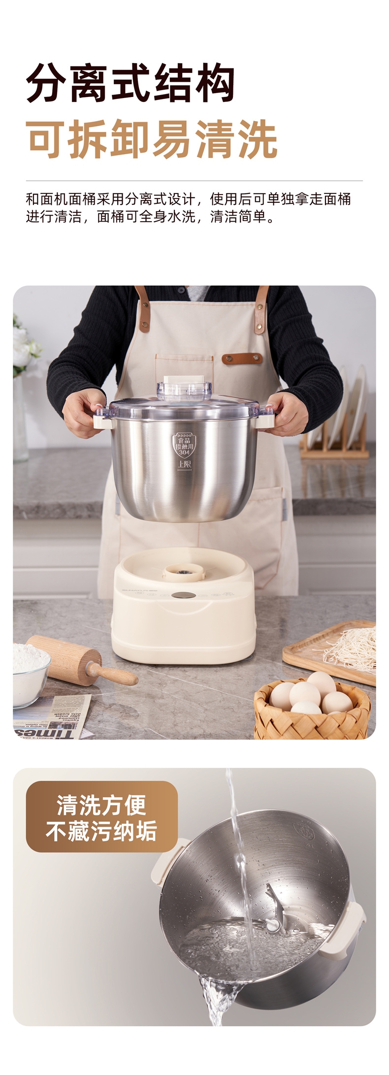 配置清单:功能多样:7升容量具备全自动和面、发酵、醒面功能,还可用于蛋清奶盖打发、搅拌肉馅等,能满足中西式面点制作需求。 智能便捷:带有微电脑定时功能,智能揉面 + 恒温醒面,无需人工长时间看管,省力又省心。 材质优良:食物接触材质为 304 不锈钢,坚固耐用且卫生健康,清洗方便;机身采用 ABS 材质,简约小巧。 动力强劲:250 瓦大动力电机,配合十字锥形盖,能轻松揉出 三光 面团,快速出膜。 噪音较小:直流轻音设计,运行时噪音低,不会对日常生活造成干扰。