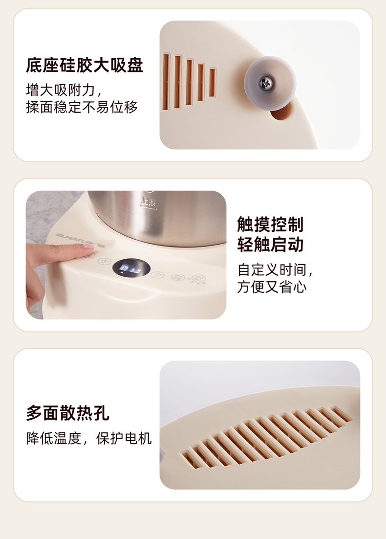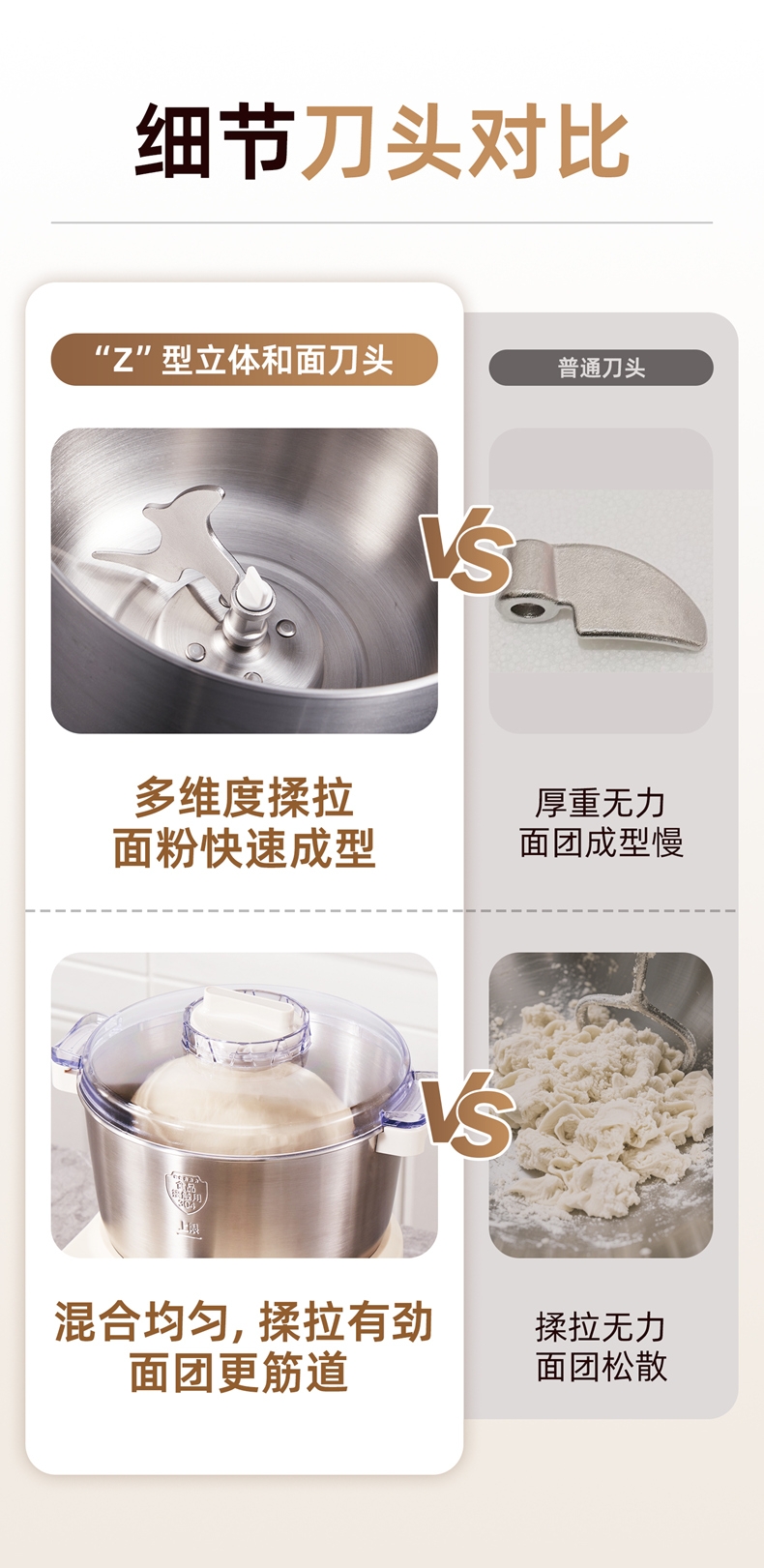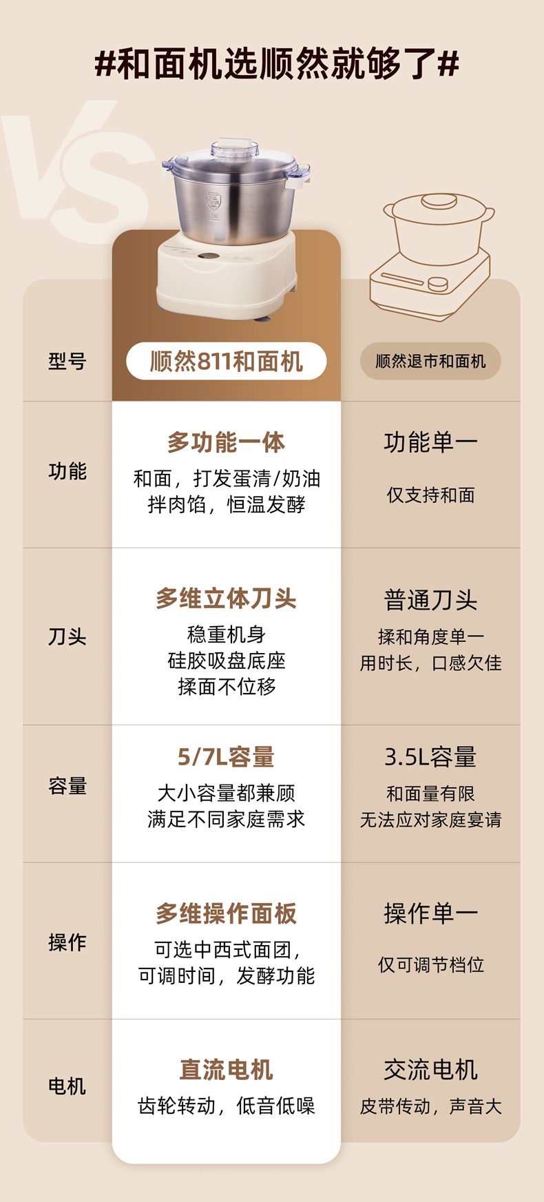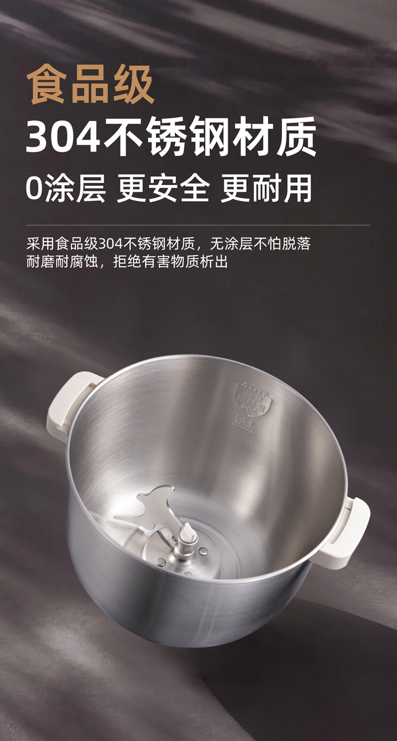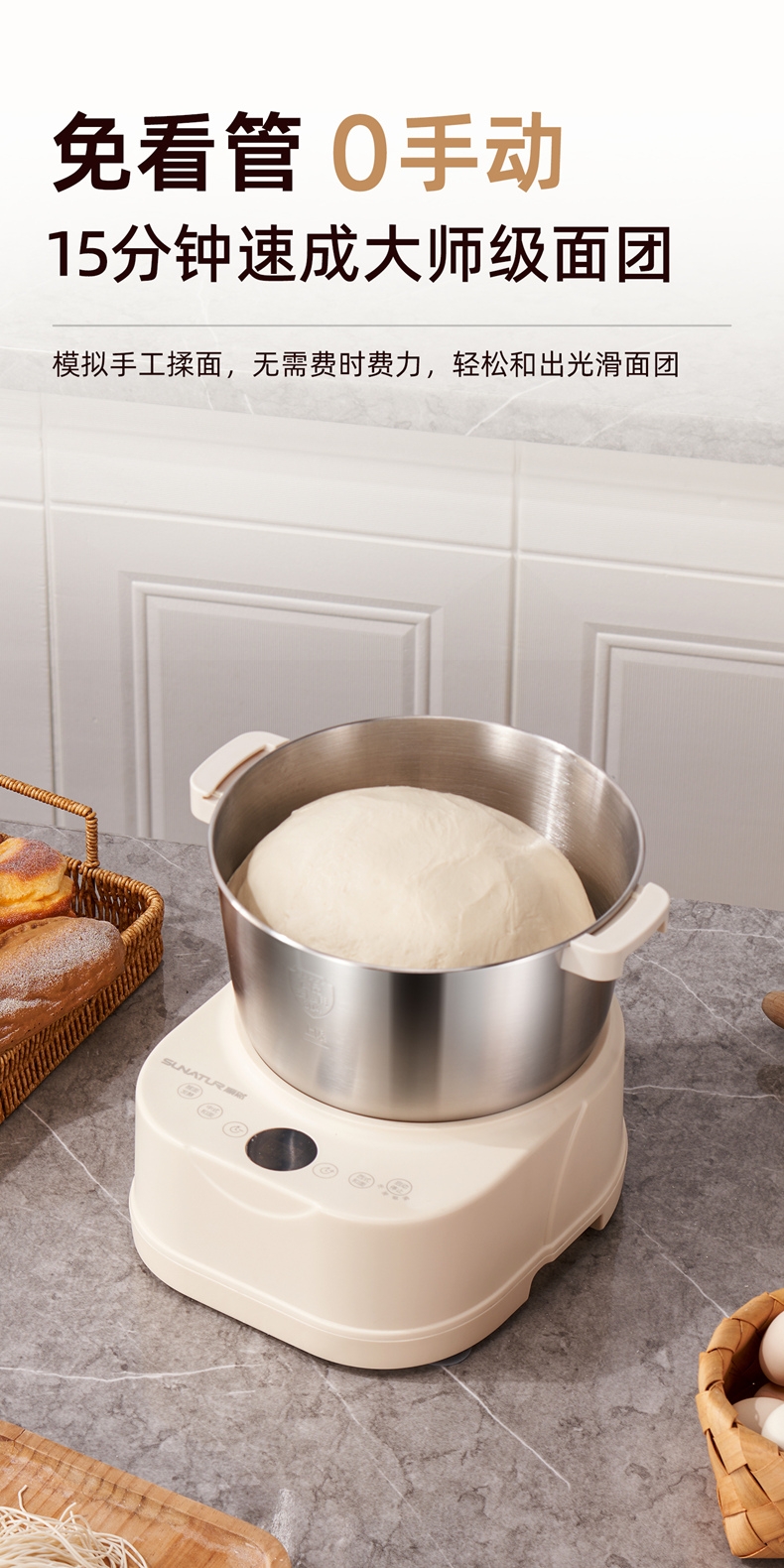 具备全自动和面、发酵醒面功能,还可用于蛋清奶盖打发;带有微电脑定时功能,智能揉面 + 恒温醒面;304不锈钢和面桶 直流轻音设计,运行时噪音低
