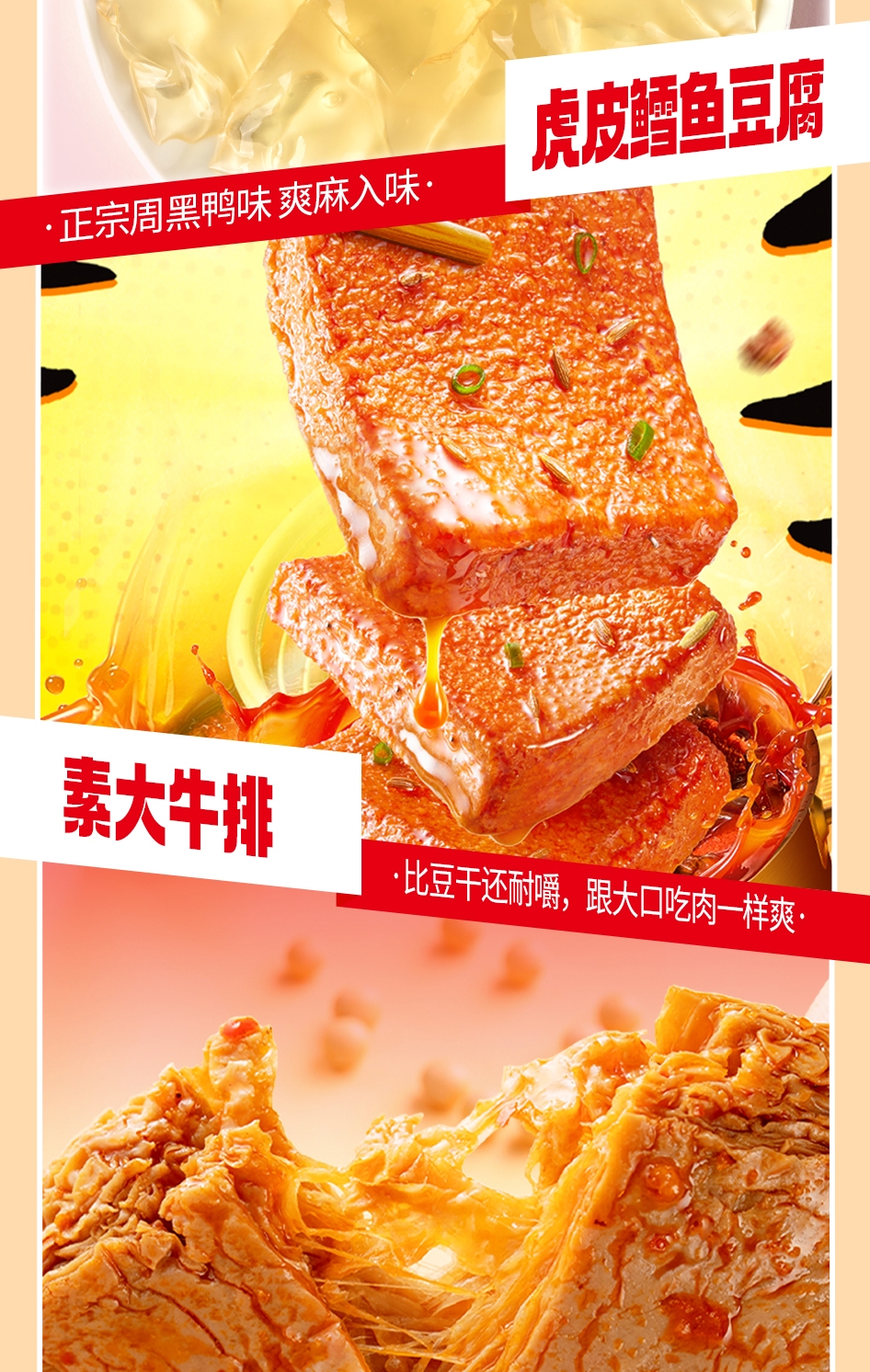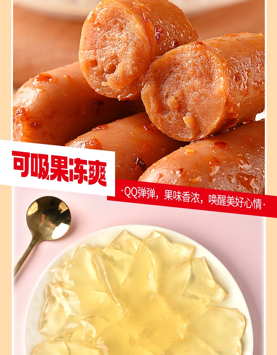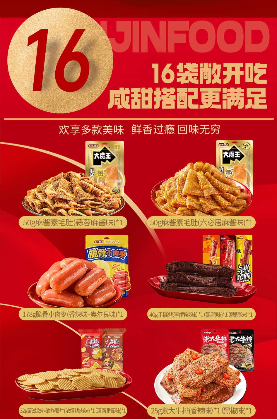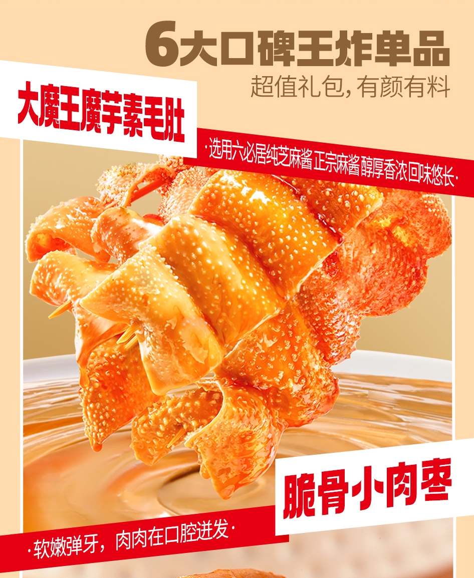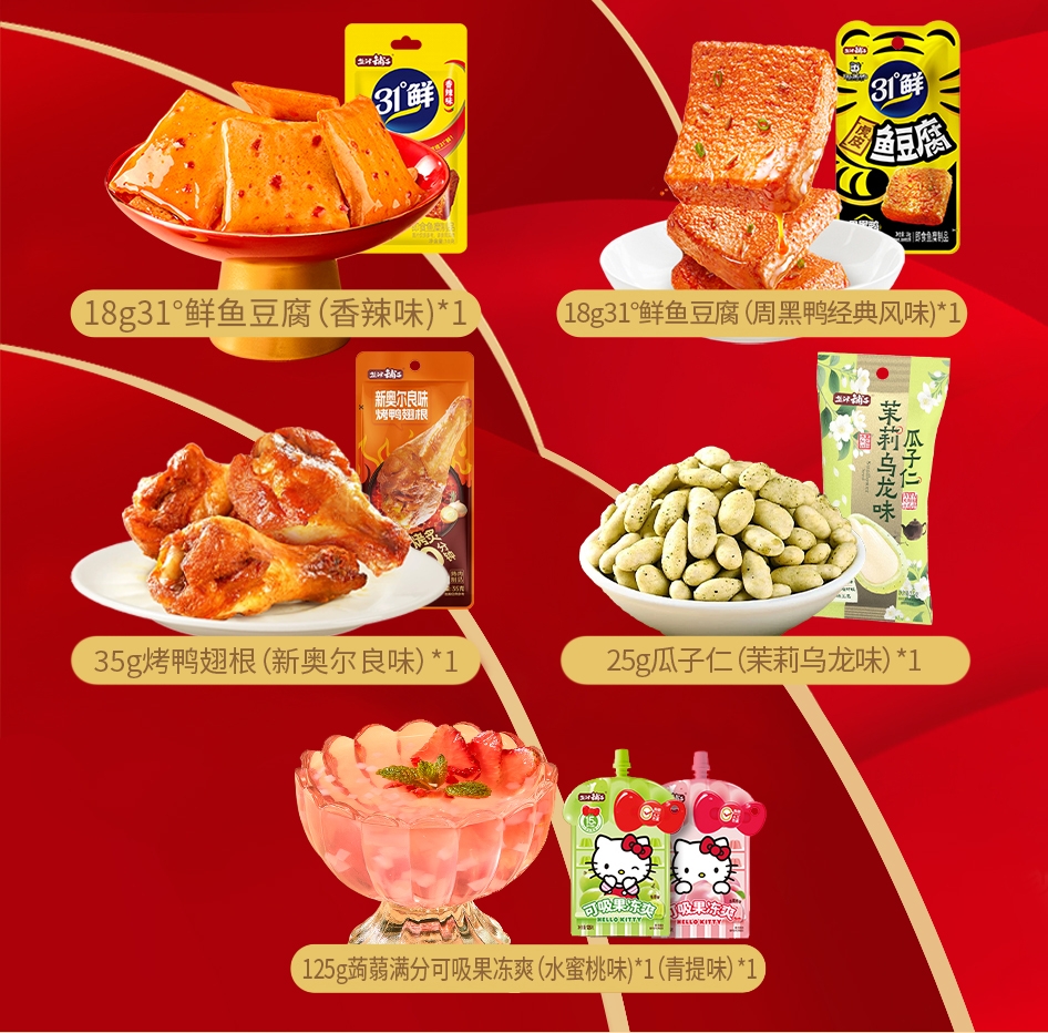 配置清单:178g脆骨小肉枣(香辣味+奥尔良味)*1 50g大魔王麻酱素毛肚(六必居麻酱味)*1 50g大魔王麻酱素毛肚(香辣麻酱味)*1或50g大魔王麻酱素毛肚(蒜蓉麻酱味)*1 40g手撕烤脖(香辣味)*1 40g手撕烤脖(黑鸭味)*1 40g手撕烤脖(糖醋味)*1 35g烤鸭翅根(新奥尔良味)*1 25g瓜子仁(茉莉乌龙味)*1 25g素大牛排(黑椒味)*1 25g素大牛排(香辣味)*1 18g31°鲜鱼豆腐(香辣味)*1 18g31°鲜虎皮鱼豆腐(周黑鸭经典风味)*1 32g薯滋滋非油炸薯片(浓情烤肉味)*1 32g薯滋滋非油炸薯片(清新番茄味)*1 125g蒟蒻满分可吸果冻爽(水蜜桃味)*1 125g蒟蒻满分可吸果冻爽(青提味)*1