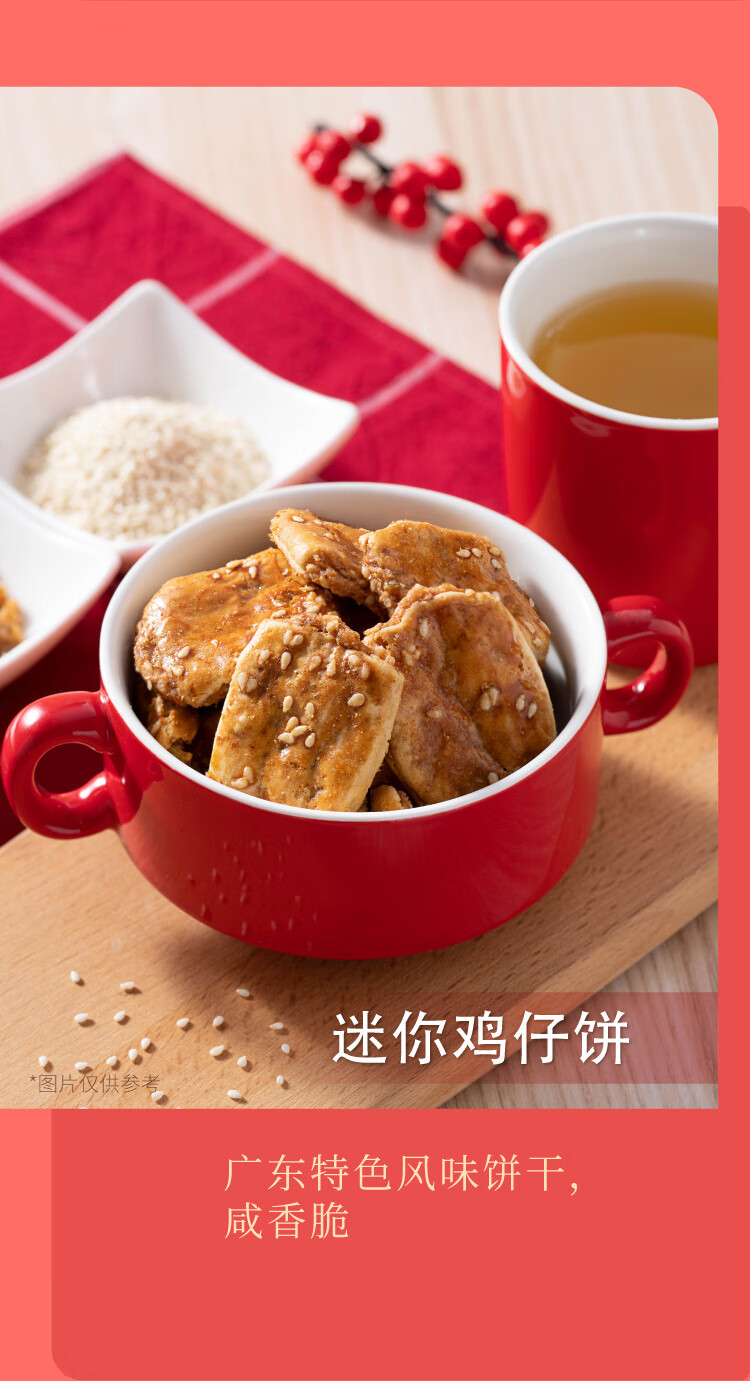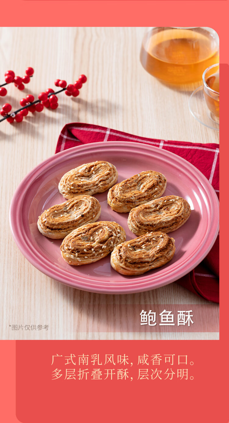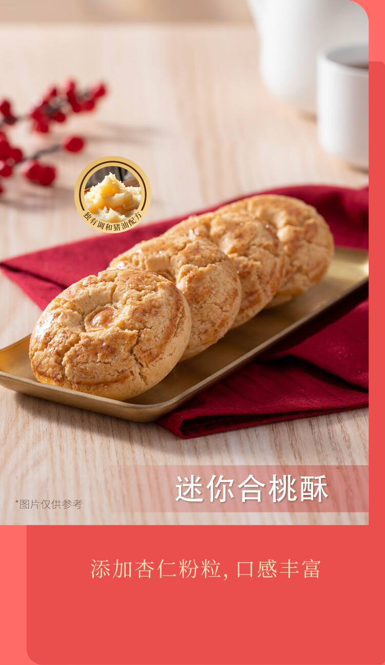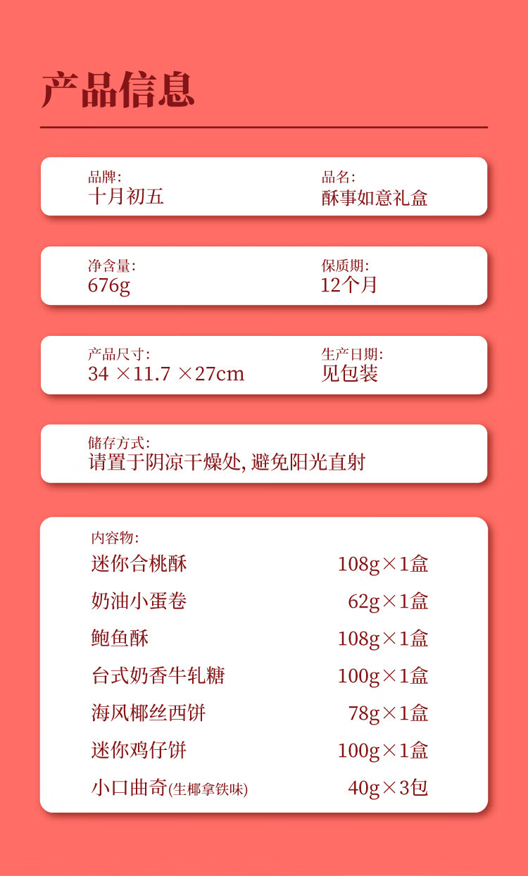 配置:108g迷你合桃酥x1盒 62g奶油小蛋卷x1盒 108g鲍鱼酥x1盒 100g牛轧糖x1盒 78g海风椰丝西饼x1盒 100g鸡仔饼x1盒 40g小口曲奇(生椰拿铁味)x3包