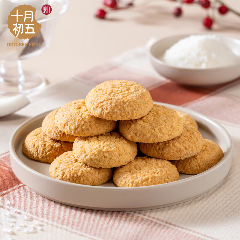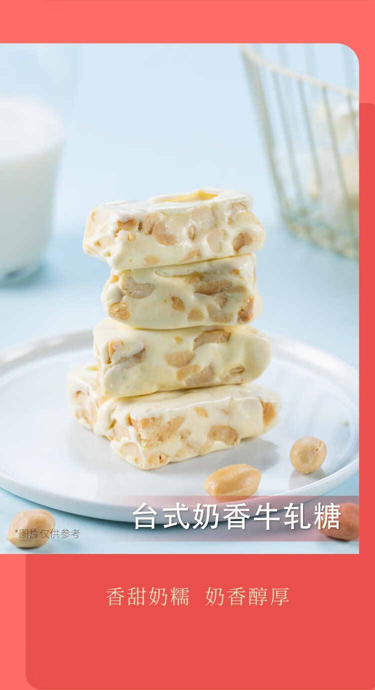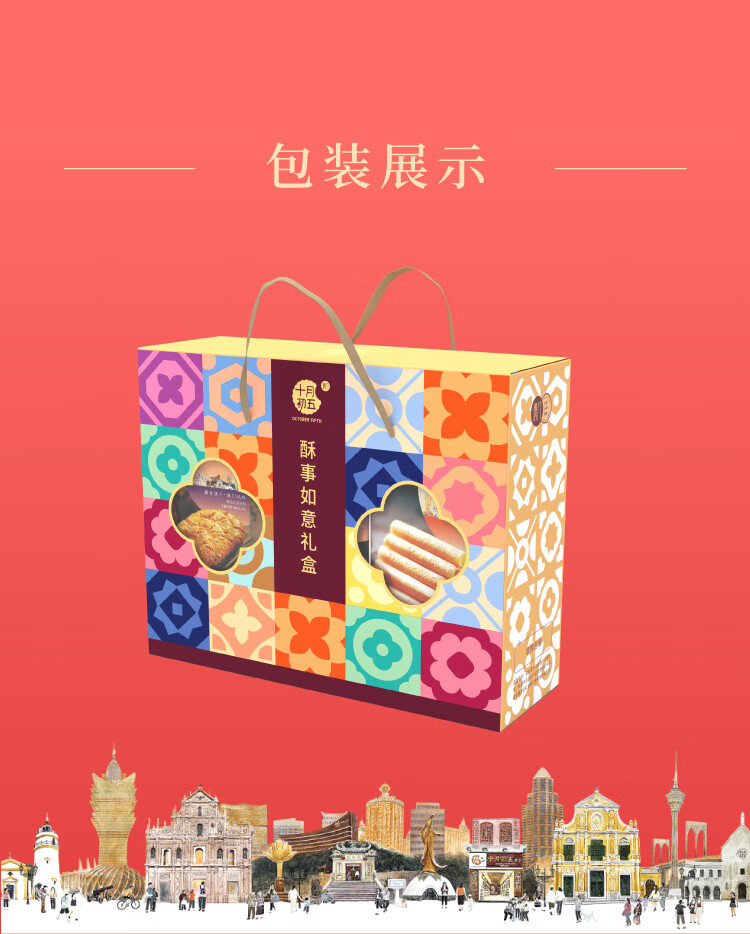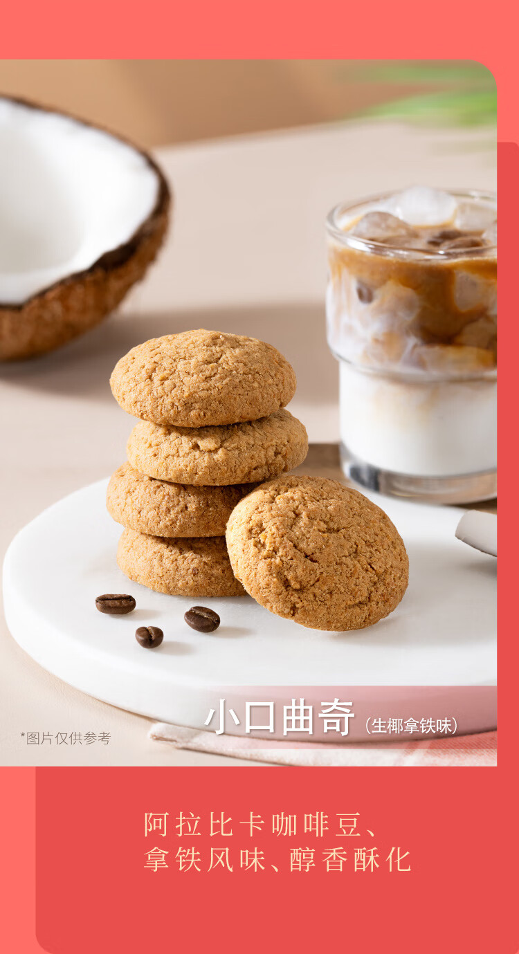 配置:108g迷你合桃酥x1盒 62g奶油小蛋卷x1盒 108g鲍鱼酥x1盒 100g牛轧糖x1盒 78g海风椰丝西饼x1盒 100g鸡仔饼x1盒 40g小口曲奇(生椰拿铁味)x3包