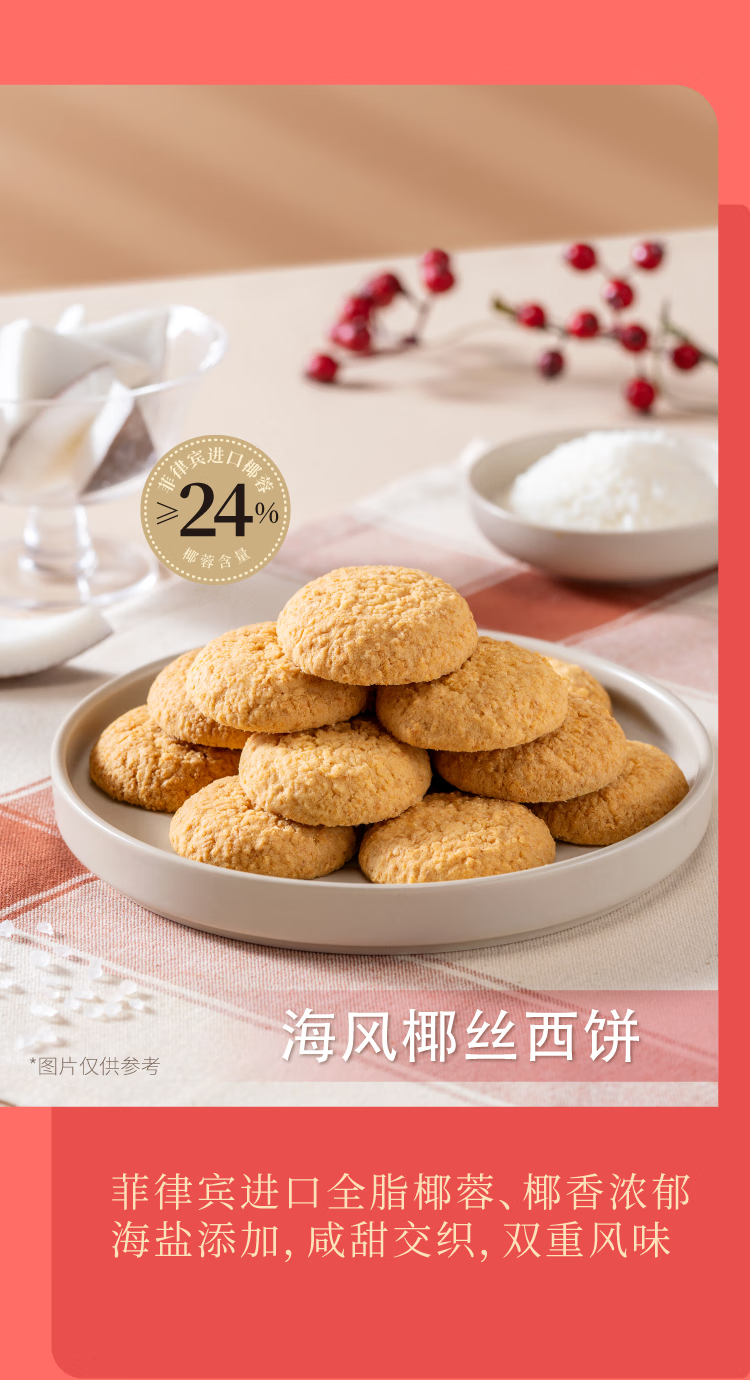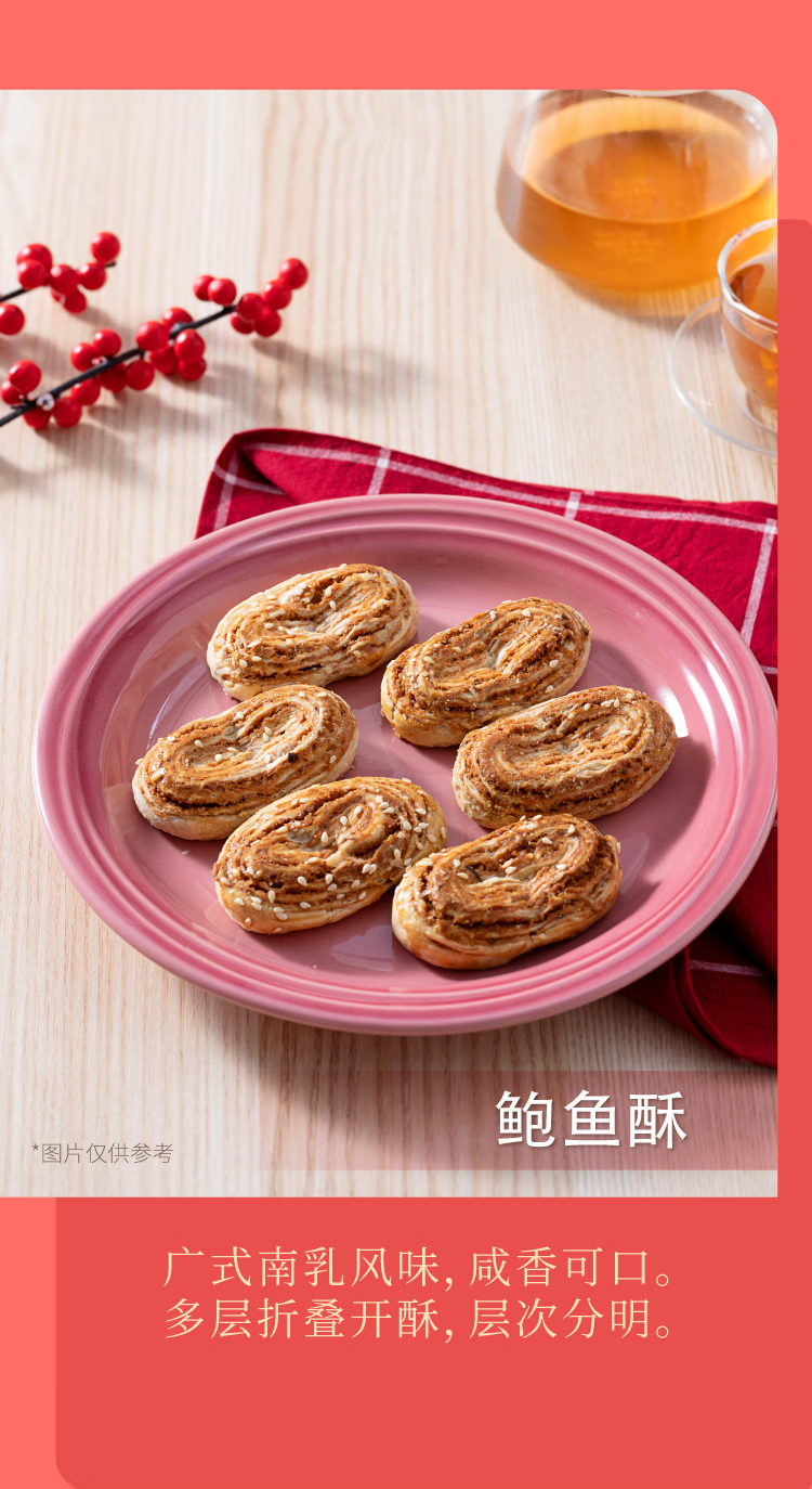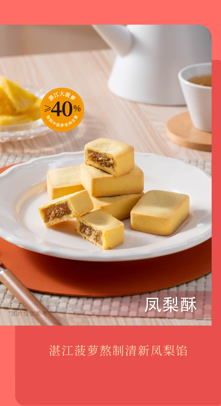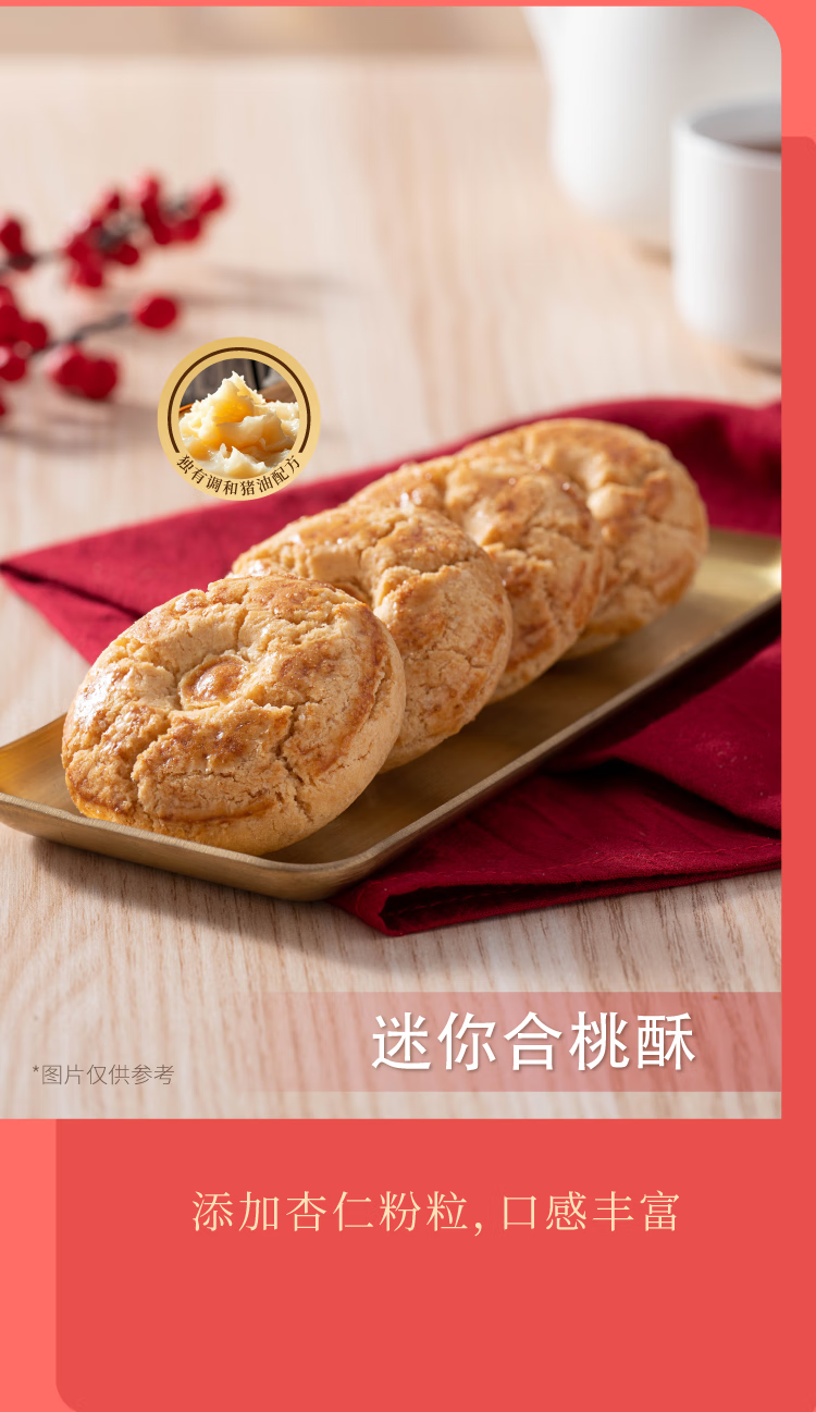 配置:108g迷你合桃酥x1盒 62g奶油小蛋卷x1盒 120g凤梨酥x1盒 78g海风椰丝西饼x1盒 100g鸡仔饼x1盒 80g茉莉绿茶酥条x1盒 108g鲍鱼酥x1盒 100g牛轧糖x1盒 40g小口曲奇(生椰拿铁味)x4包