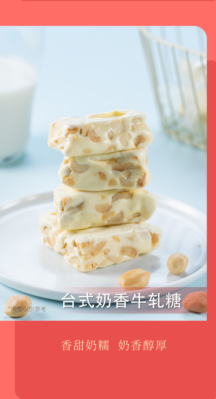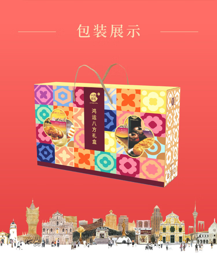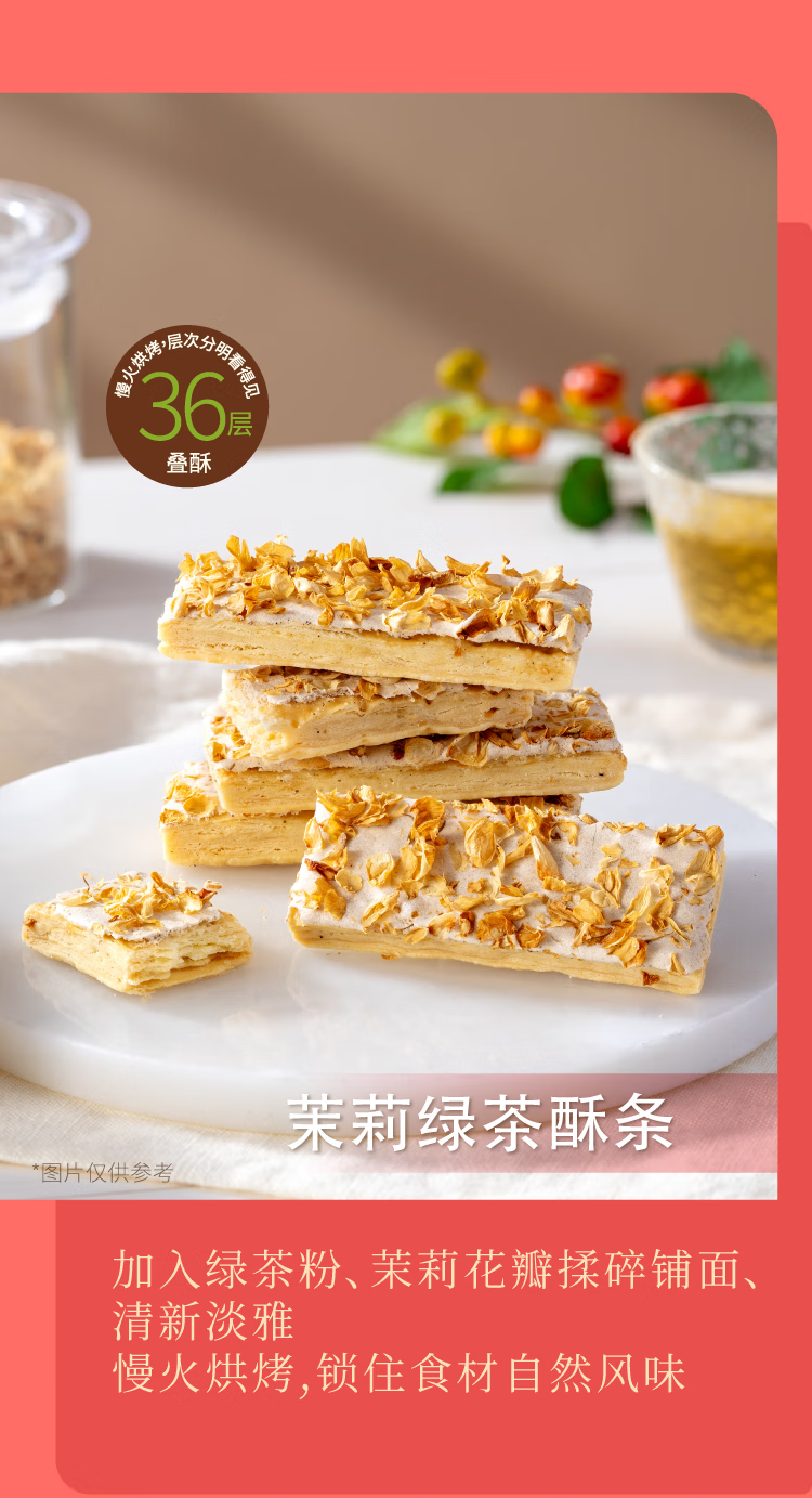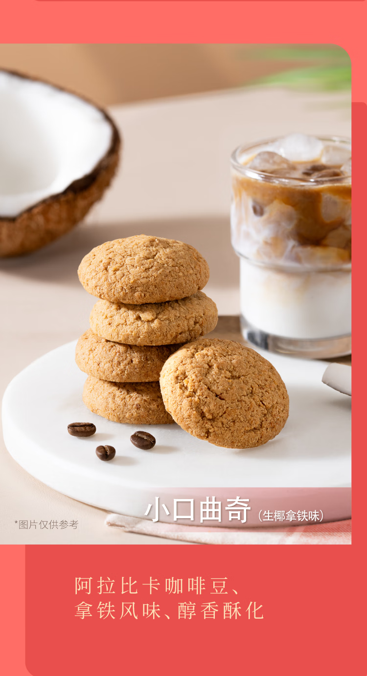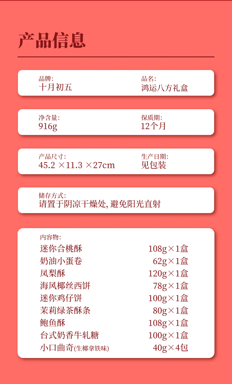 配置:108g迷你合桃酥x1盒 62g奶油小蛋卷x1盒 120g凤梨酥x1盒 78g海风椰丝西饼x1盒 100g鸡仔饼x1盒 80g茉莉绿茶酥条x1盒 108g鲍鱼酥x1盒 100g牛轧糖x1盒 40g小口曲奇(生椰拿铁味)x4包