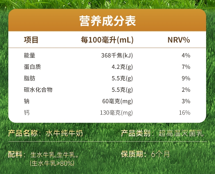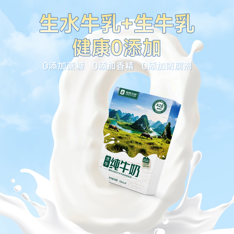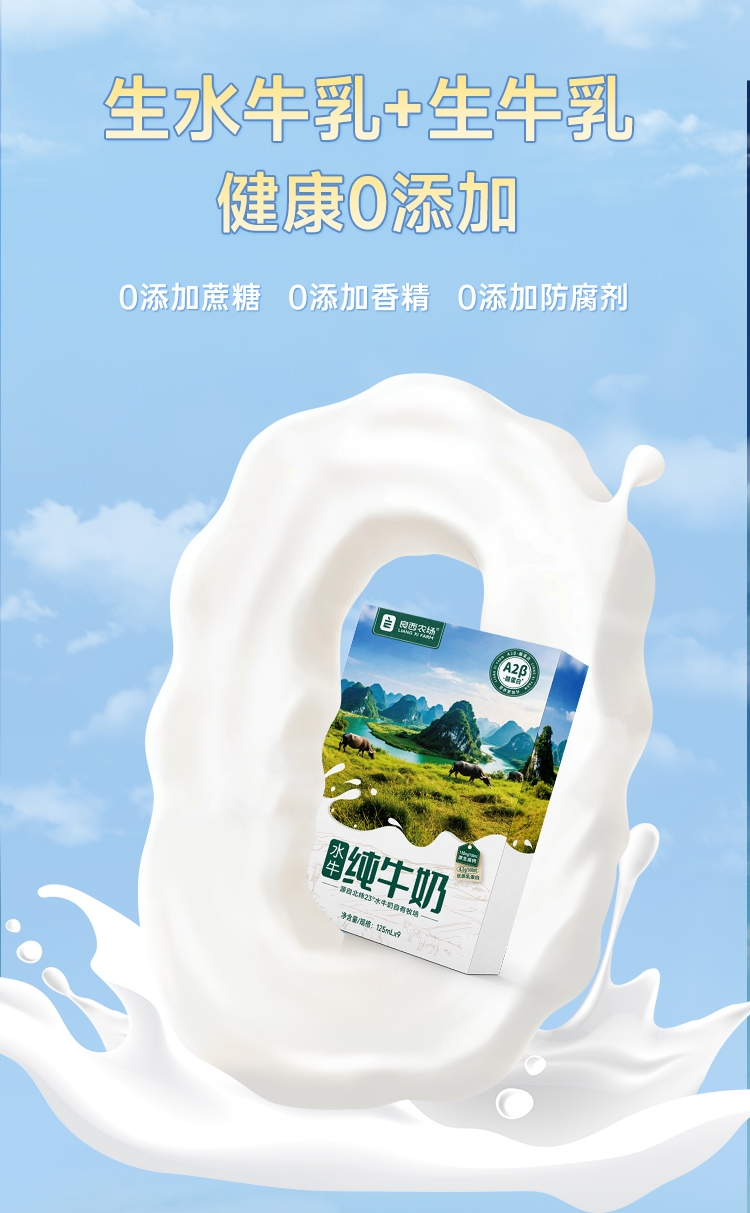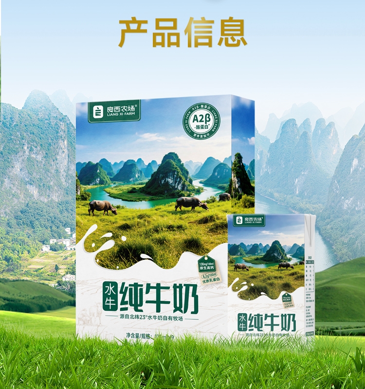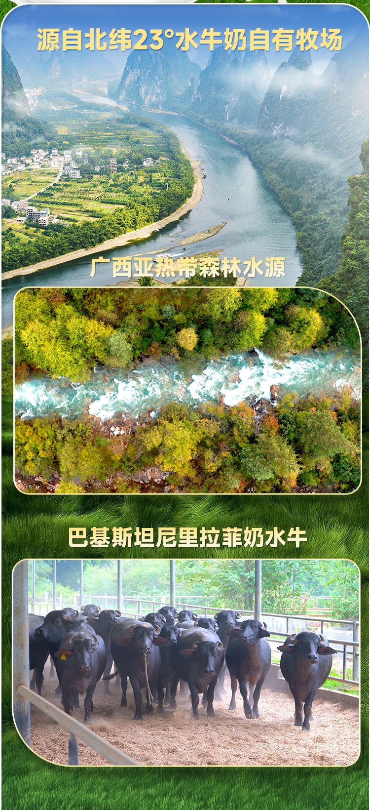 源自广西北纬23°水牛奶自有牧场;广西亚热带森林水源,更好的水源;进口巴基斯坦尼里拉菲奶水牛;4.2g/100ml优质乳蛋白;130mg/100ml原生高钙
