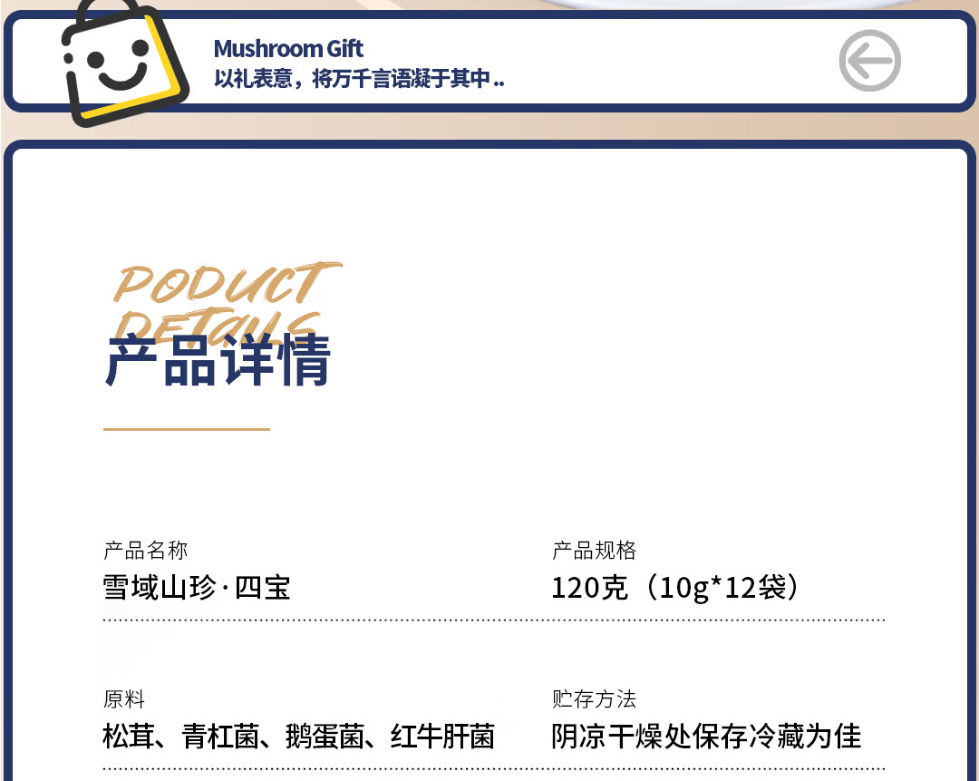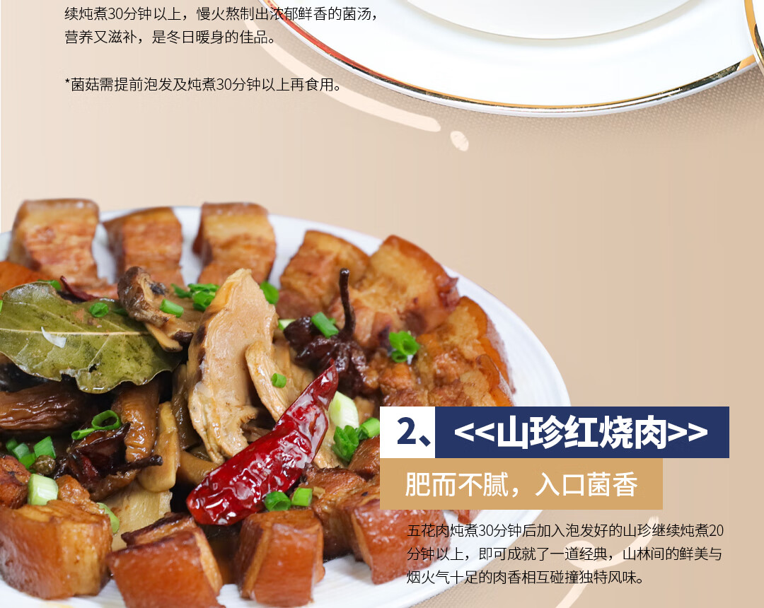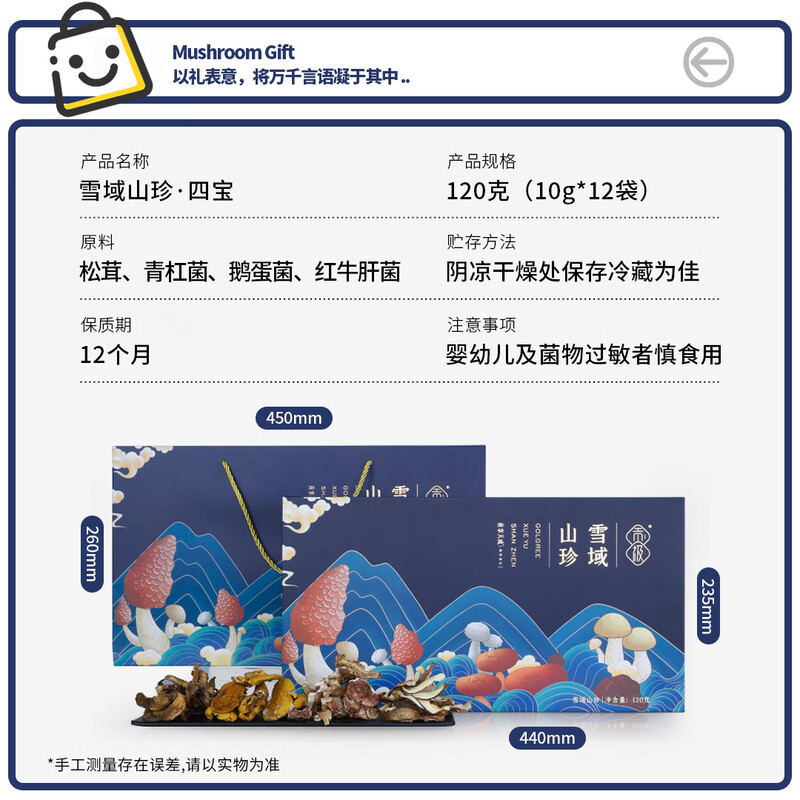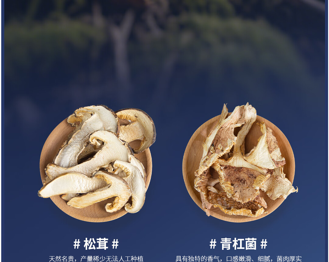 配置清单:野生:松茸(10g*2)红牛肝菌(10g*2) 青杠菌(10g*4) 鹅蛋菌(10g*4)手提袋*1 礼盒*1