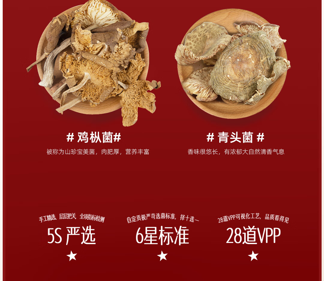 配置清单:野生:松茸(10g*2) 青杠菌(10g*2) 鸡枞菌(10g*2) 青头菌(10g*3) 鹅蛋菌(10g*3)红牛肝菌(10g*3)