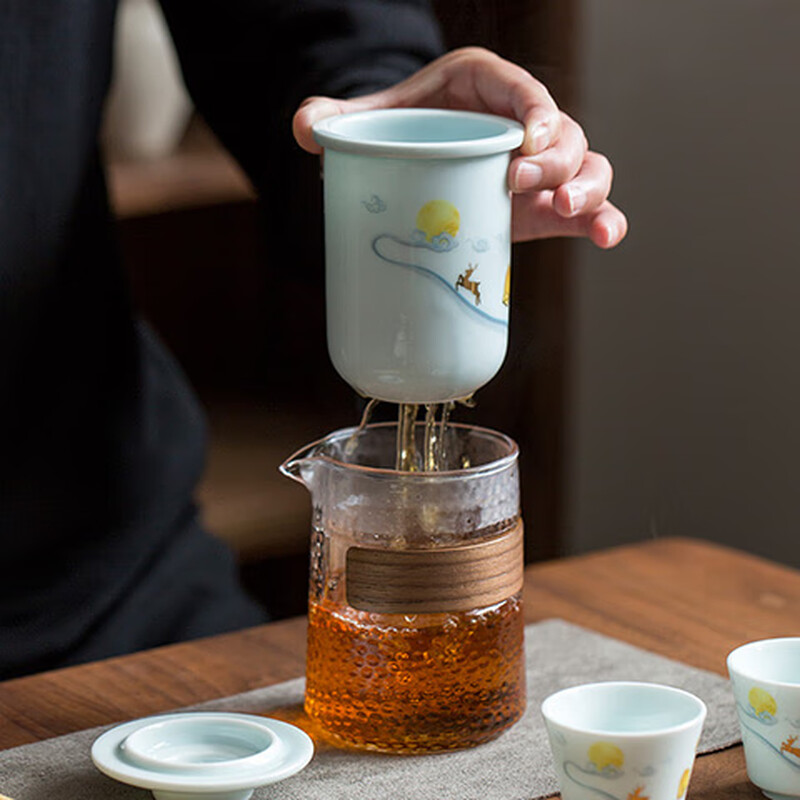青瓷材质,温润如玉;茶水分离,清澈茶汤。;简单随性,融入生活,居家、办公适用。