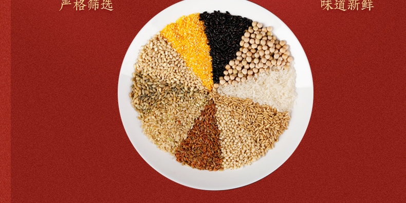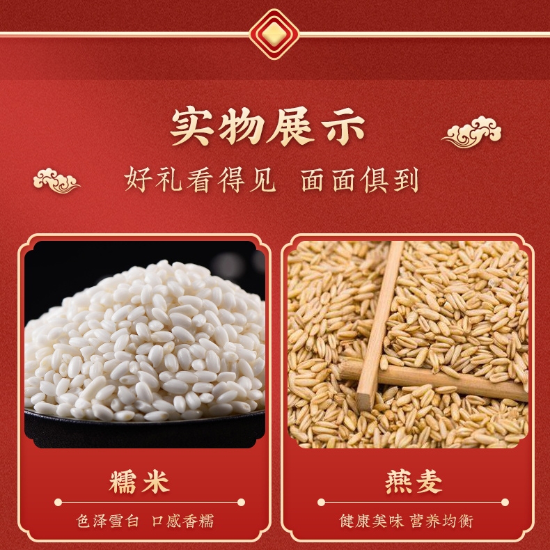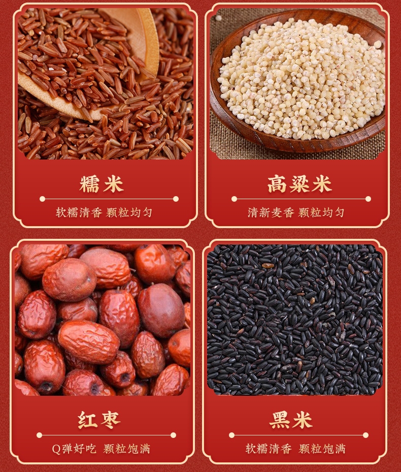 产品配置:糯米、燕麦、高粱米、红米、黑米各250g,红枣100g