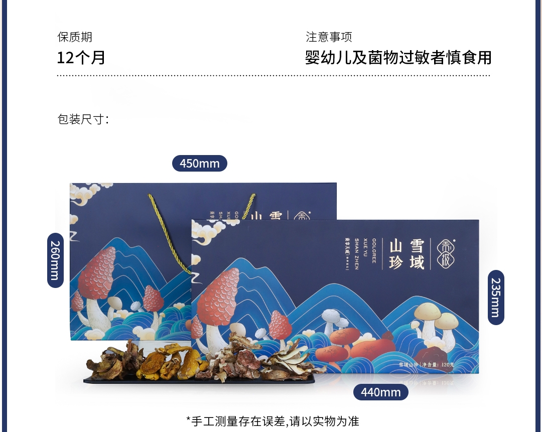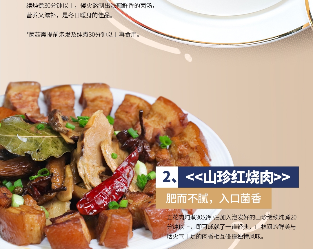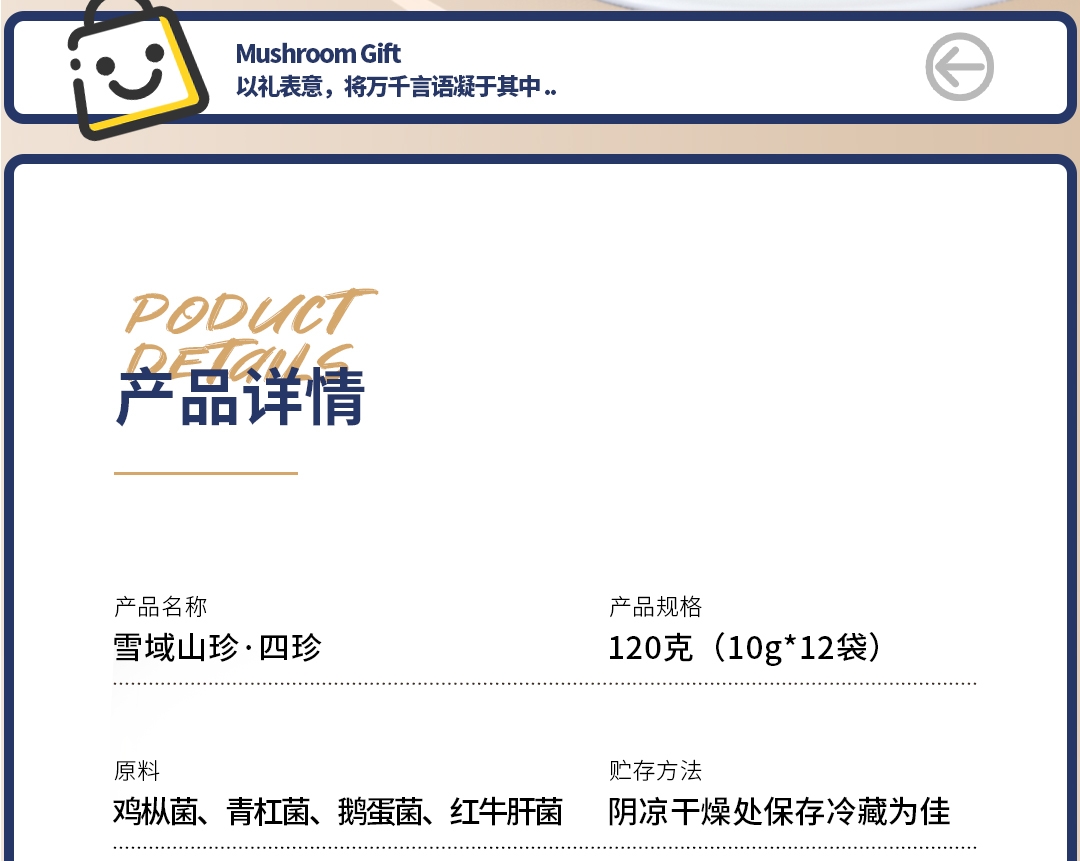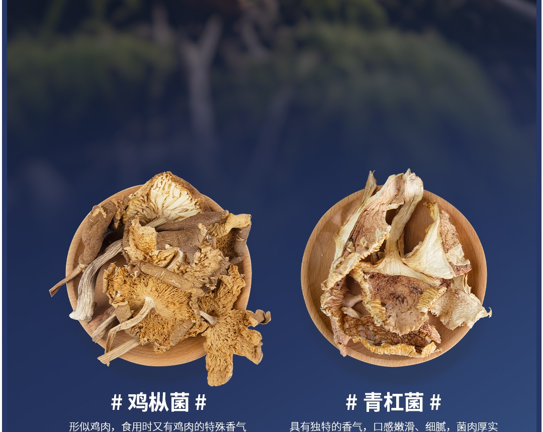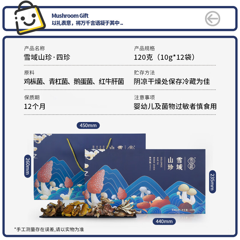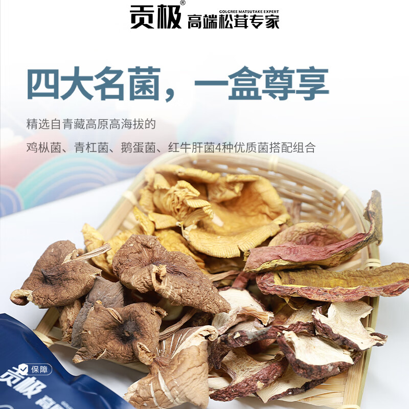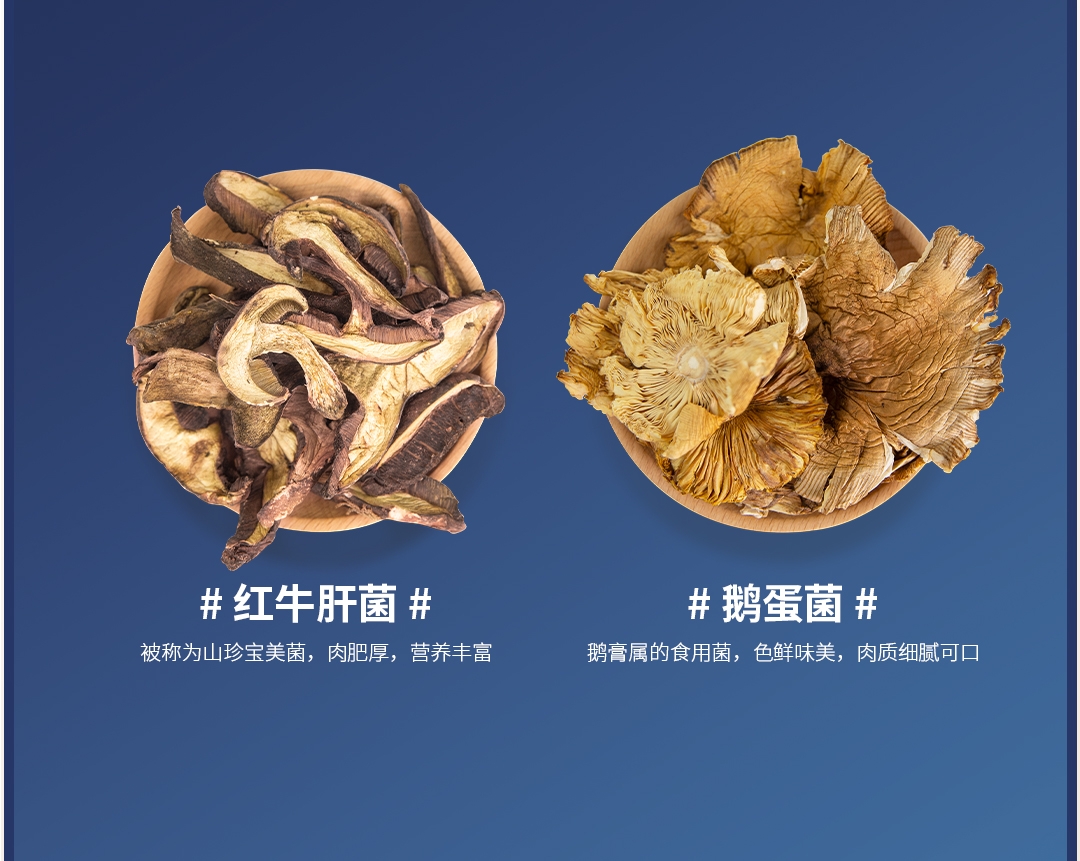 配置清单:野生: 鸡枞菌(10g*2) 红牛肝菌(10g*2) 青杠菌(10g*4) 鹅蛋菌(10g*4)
