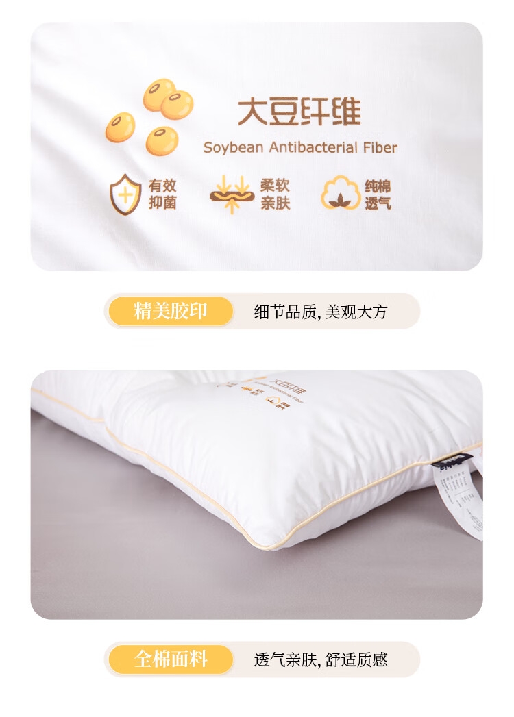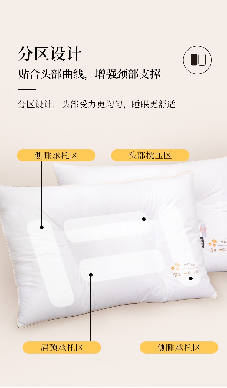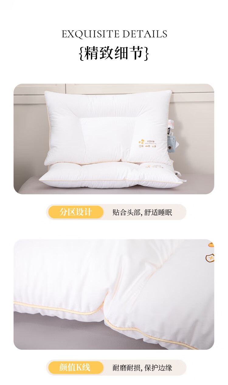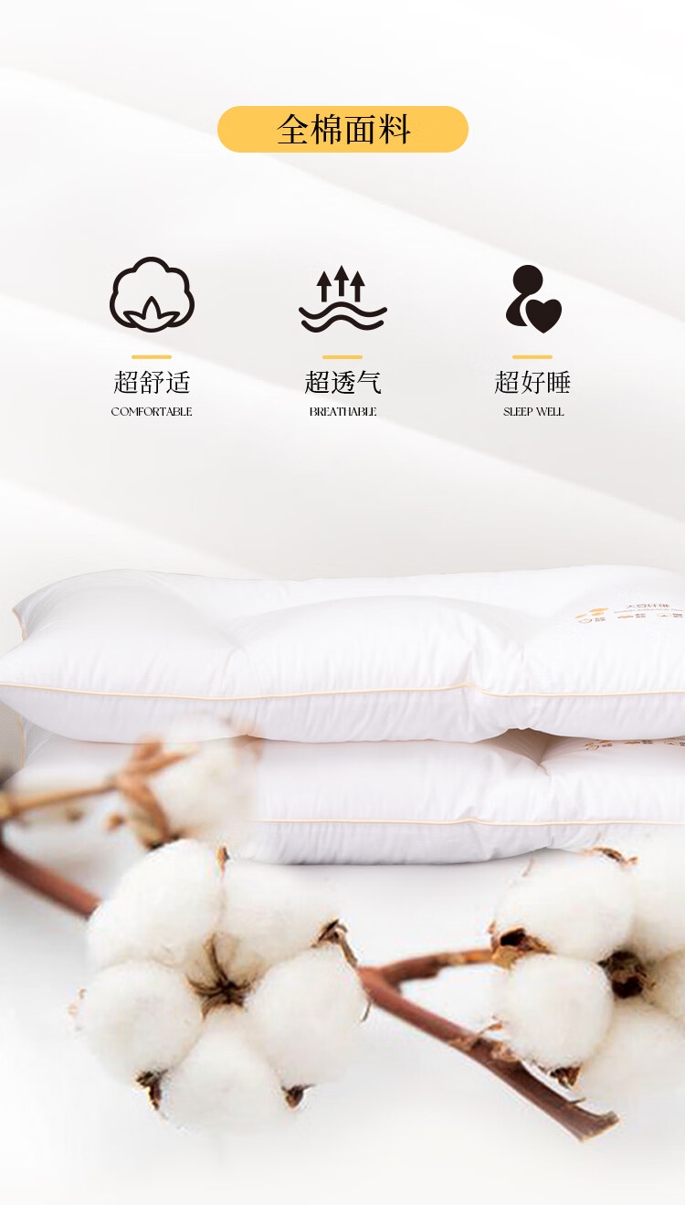 产品采用全棉A类面料;柔软,舒适,透气;分区设计,头部受力均匀,睡眠更舒适