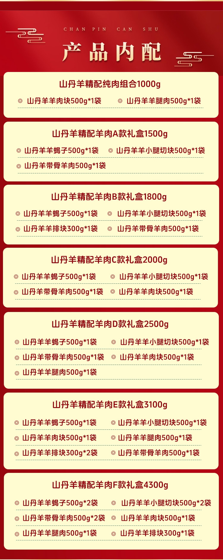 配置清单:山丹羊羊蝎子500g*1袋 羊小腿切块500g*1袋 山丹羊羊肉块500g*1袋 山丹羊羊腿肉500g*1袋 山丹羊羊排块300g*2袋 带骨羊肉500g*1袋