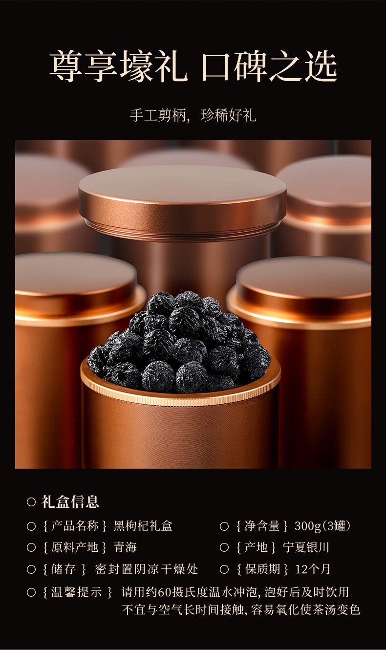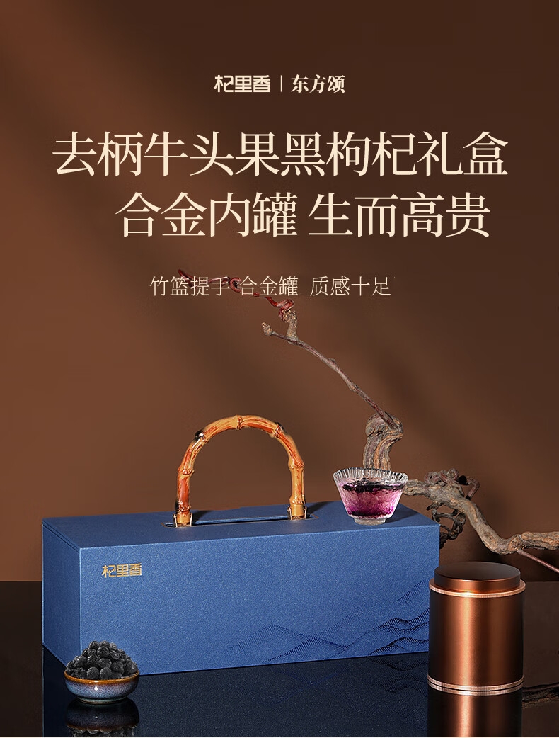配置清单:去柄大果黑枸杞礼盒300g*1盒+礼袋*1
