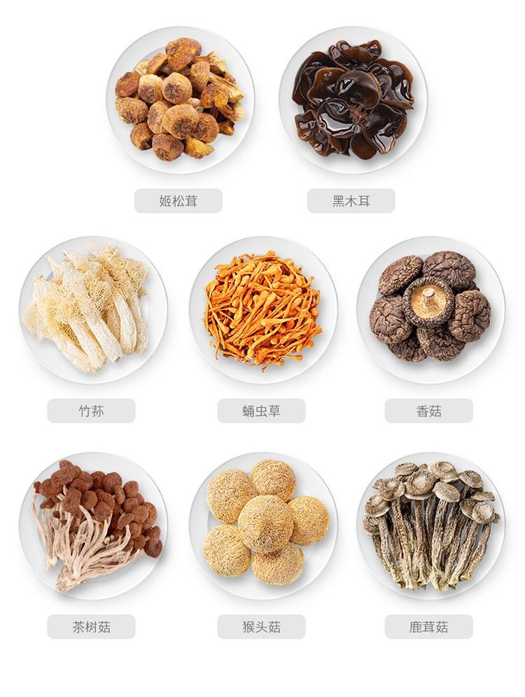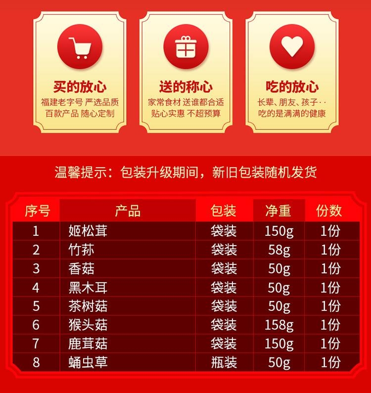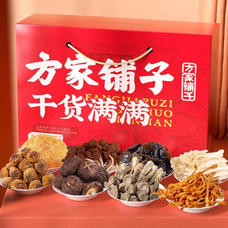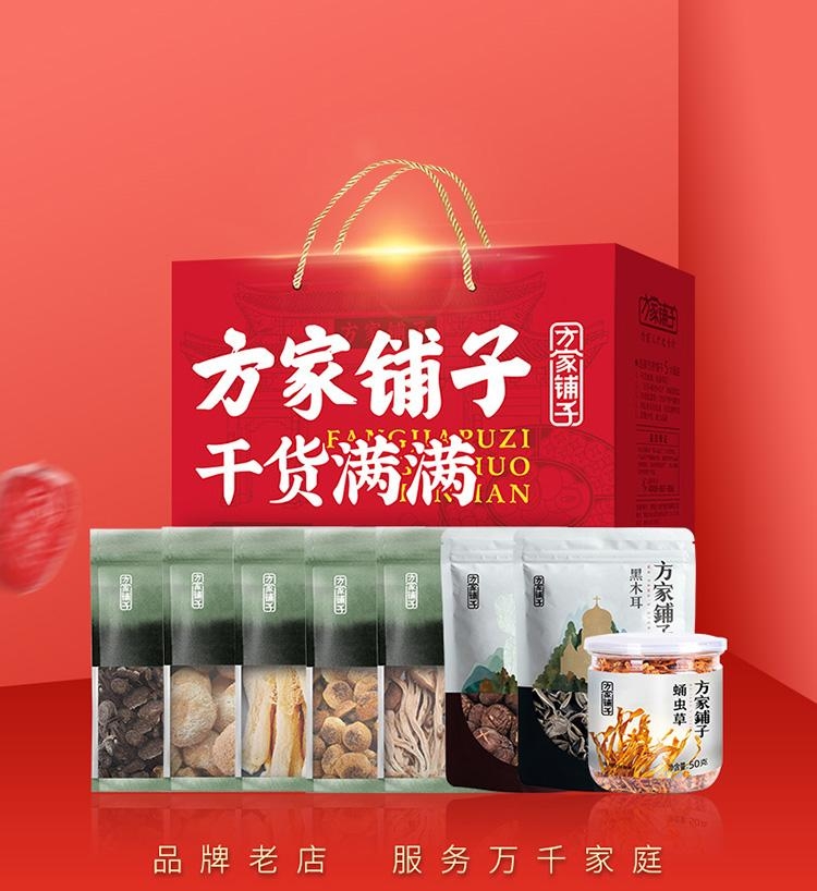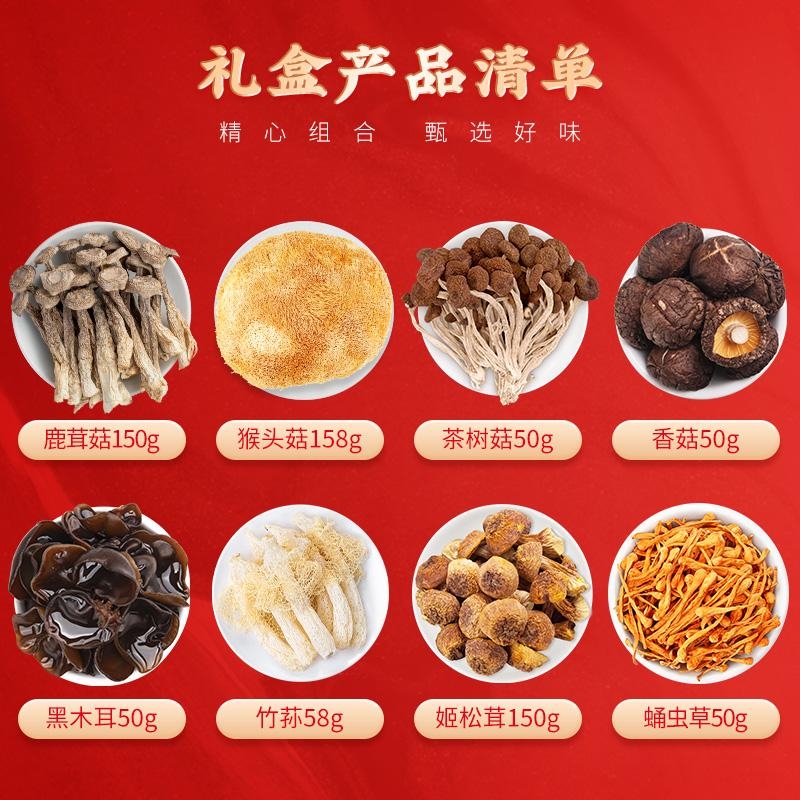 配置:【方家铺子】鹿茸菇150g/袋装 【方家铺子】猴头菇158g/袋装 【方家铺子】茶树菇50g/袋装 【方家铺子】香菇50g/袋装 【方家铺子】东北黑木耳50g/袋装 【方家铺子】竹荪58g/袋装 【方家铺子】姬松茸150g/袋装 【方家铺子】蛹虫草50g/瓶装