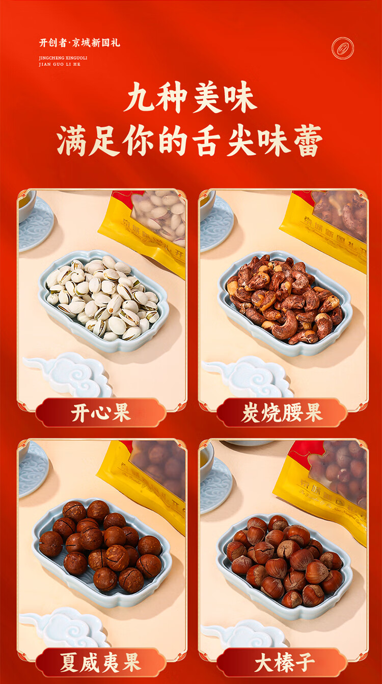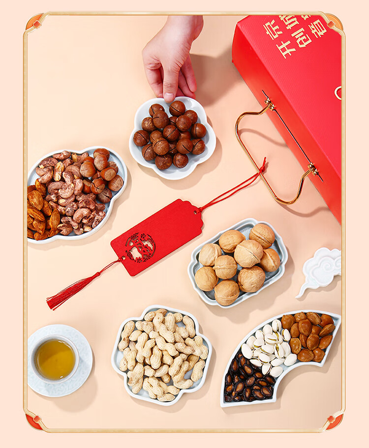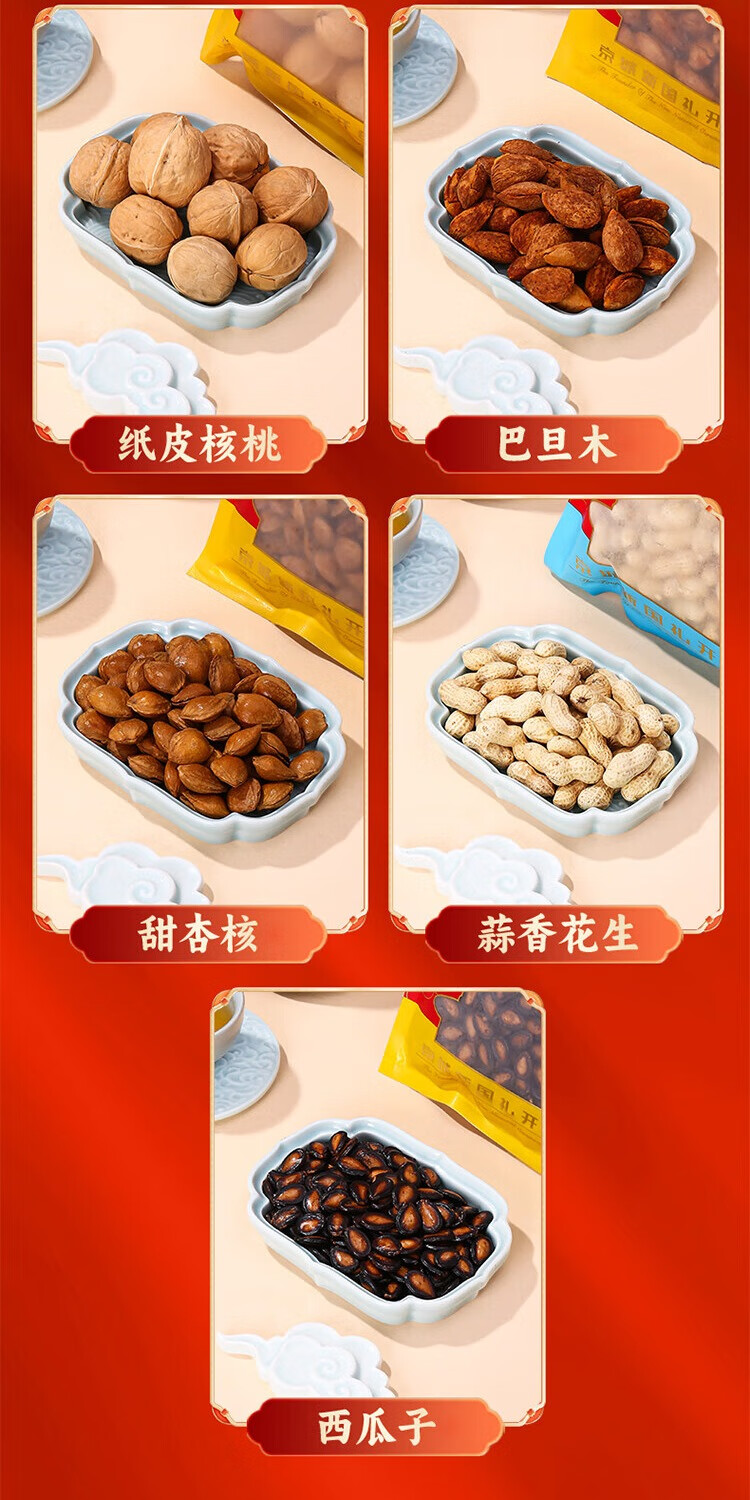配置:开心果100g 炭烧腰果100g 巴旦木100g 夏威夷果100g 大榛子100g 纸皮核桃150g 甜杏核200g 西瓜子200g 蒜香花生300g