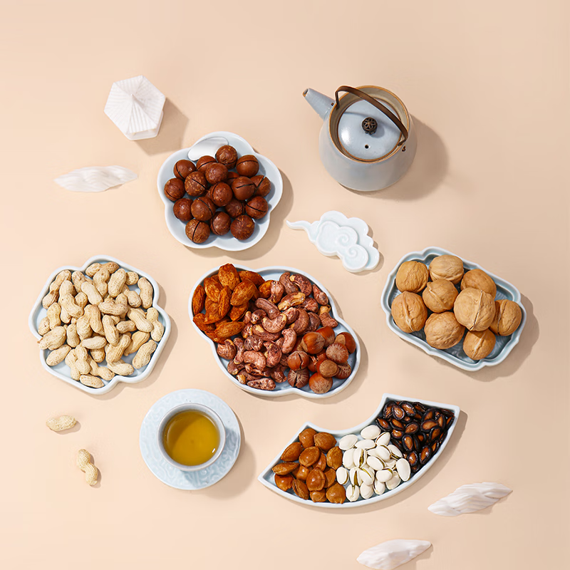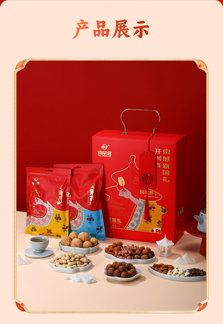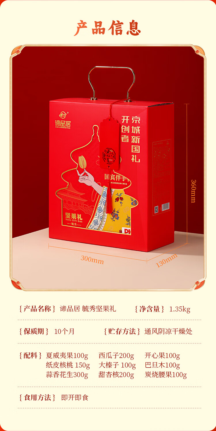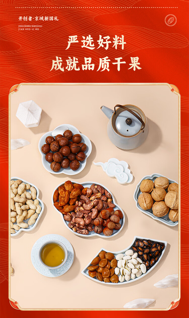 配置:开心果100g 炭烧腰果100g 巴旦木100g 夏威夷果100g 大榛子100g 纸皮核桃150g 甜杏核200g 西瓜子200g 蒜香花生300g