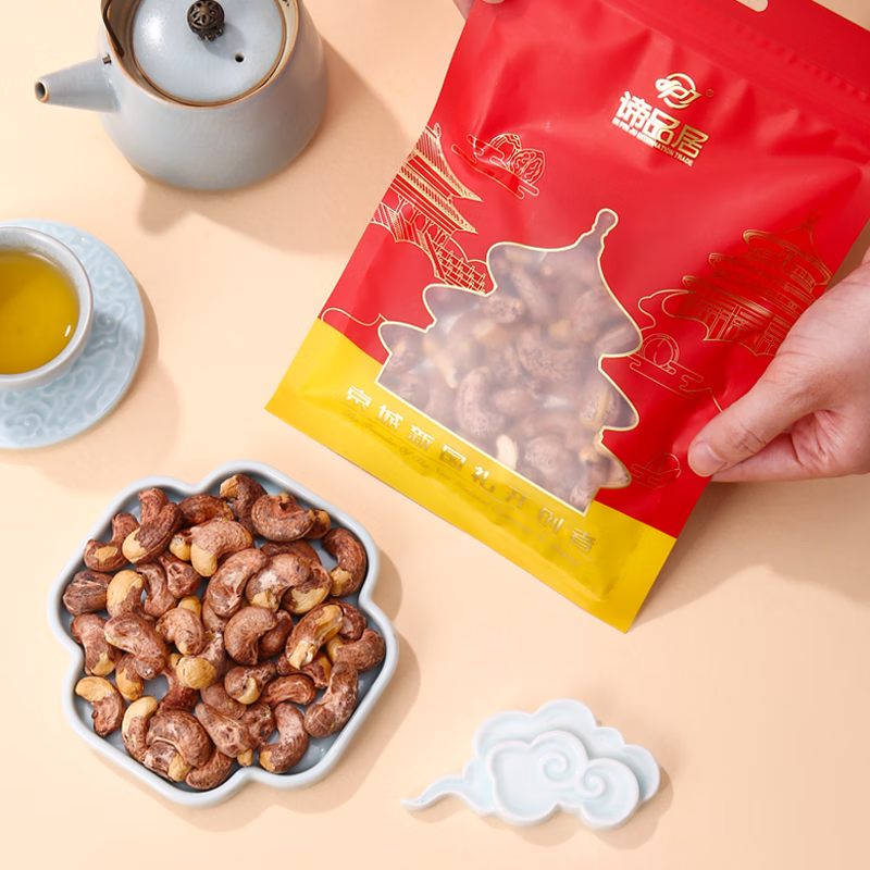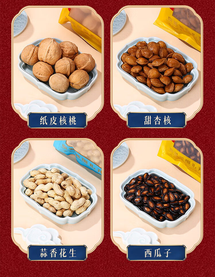 配置:炭烧腰果100g 巴旦木100g 夏威夷果100g 大榛子100g 纸皮核桃150g 甜杏核200g 西瓜子200g 蒜香花生300g