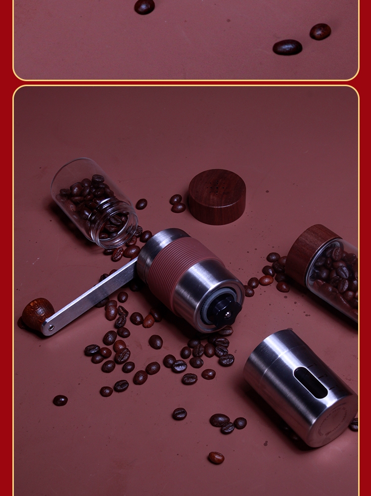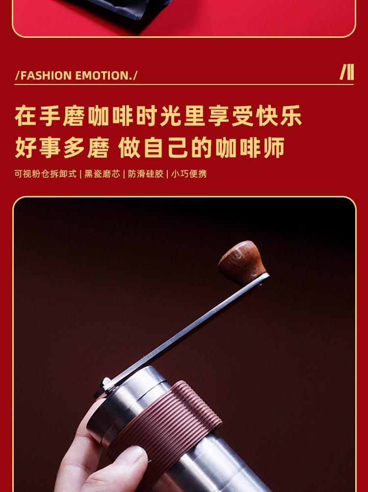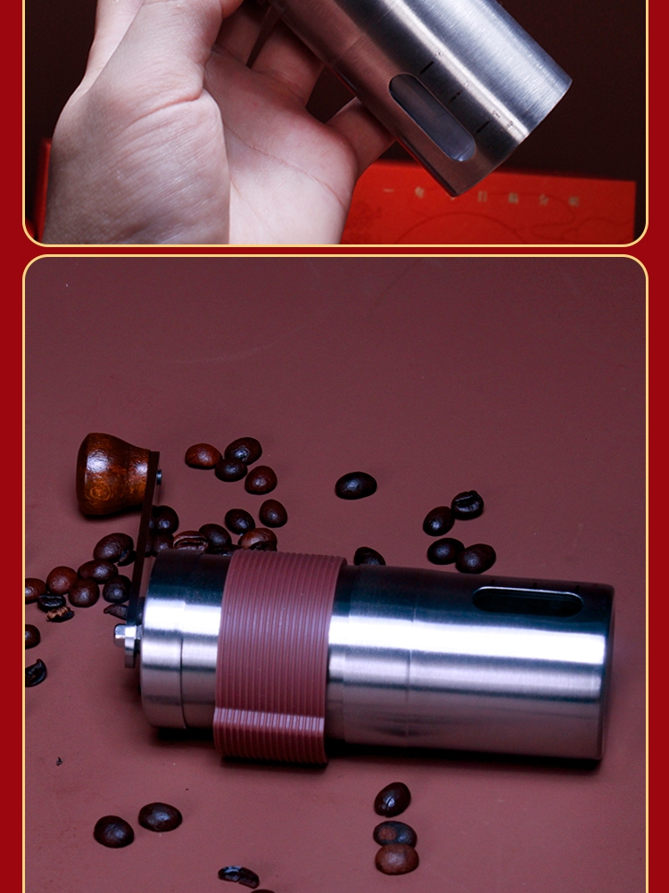配置:手磨咖啡机*1 意式拼配咖啡豆*1袋(100克) 玻璃保鲜便携豆罐*1 红色咖啡杯*1说明书*1 对联*1-红包*4 门神*2 精装礼盒手提袋*1 材质 榉木-黑瓷机芯-骨瓷--食品级硅胶-洒金纸-触感纸