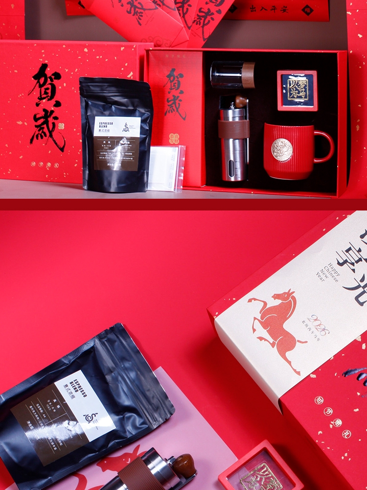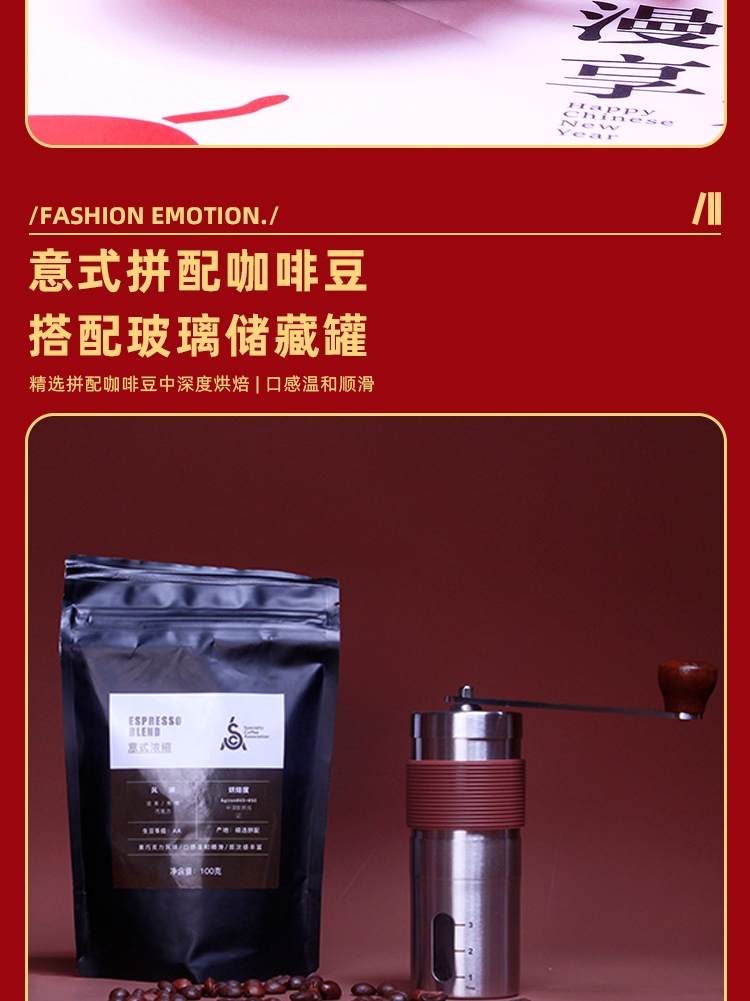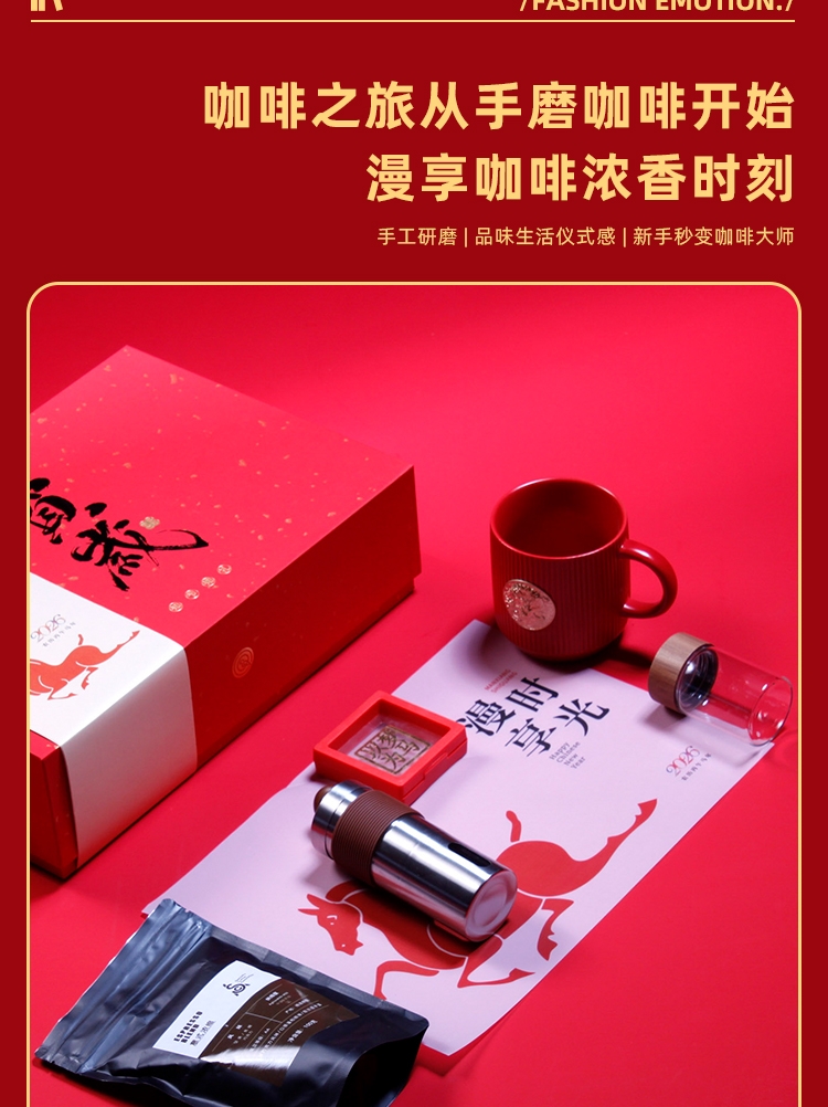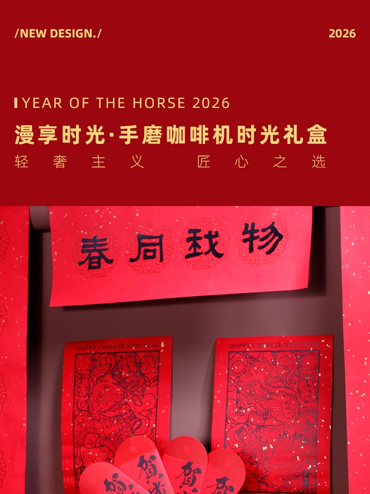 配置清单:手磨咖啡机*1 意式拼配咖啡豆*1袋(100克) 玻璃保鲜便携豆罐*1 红色咖啡杯*1说明书*1 对联*1-红包*4 门神*2 精装礼盒手提袋*1
