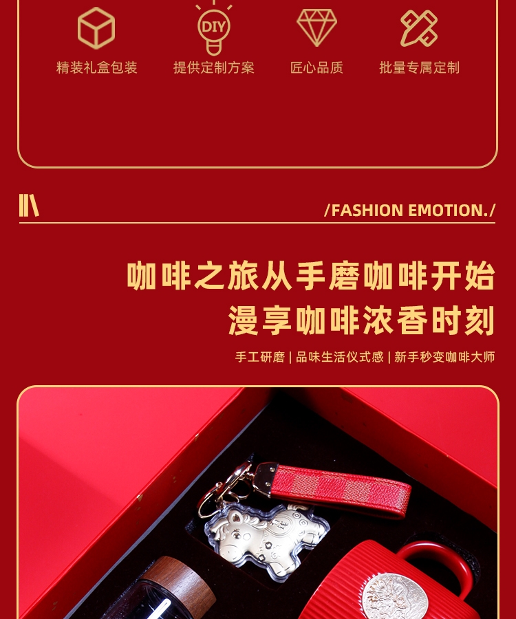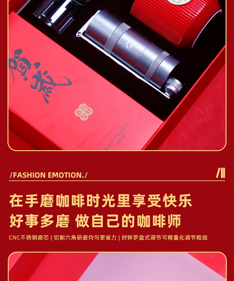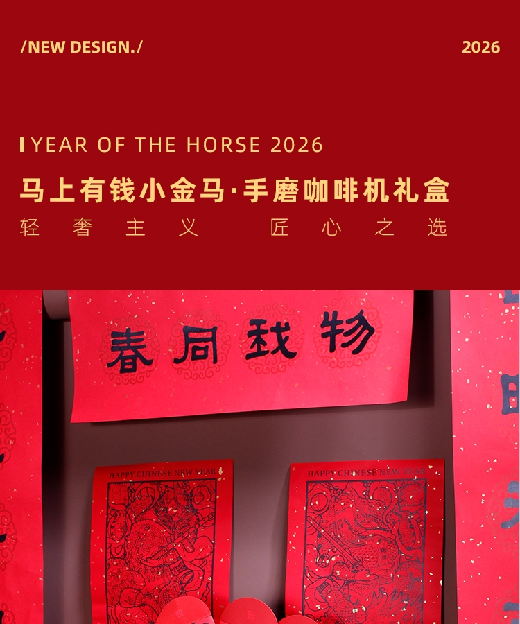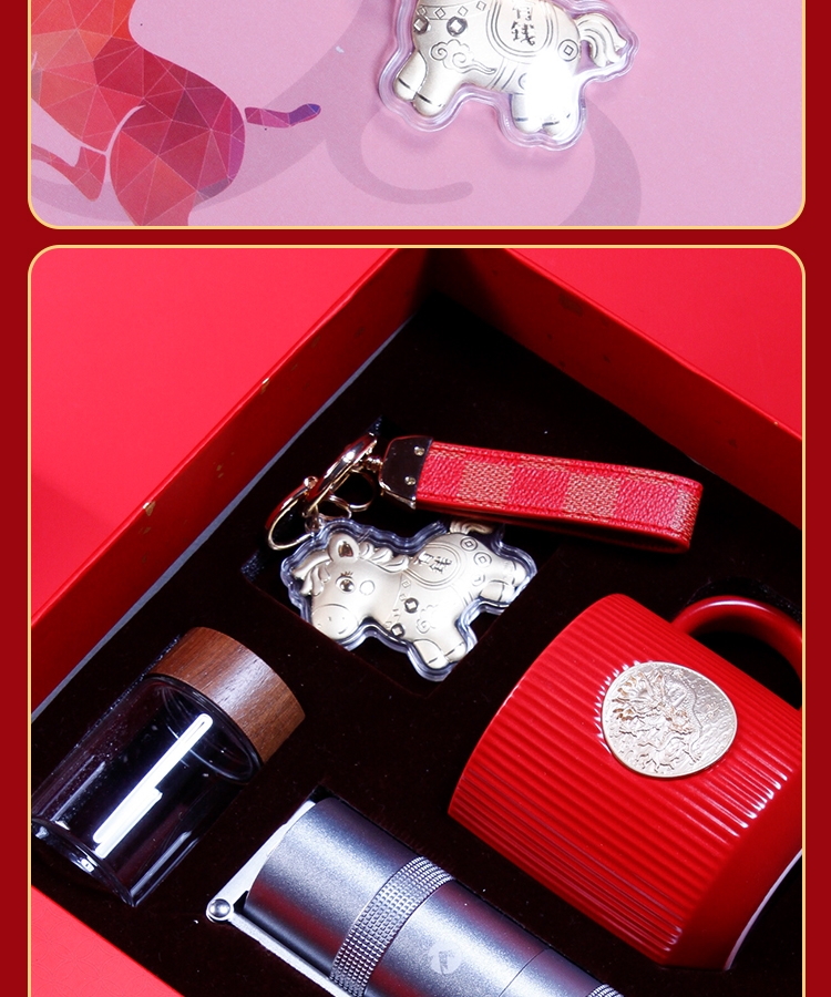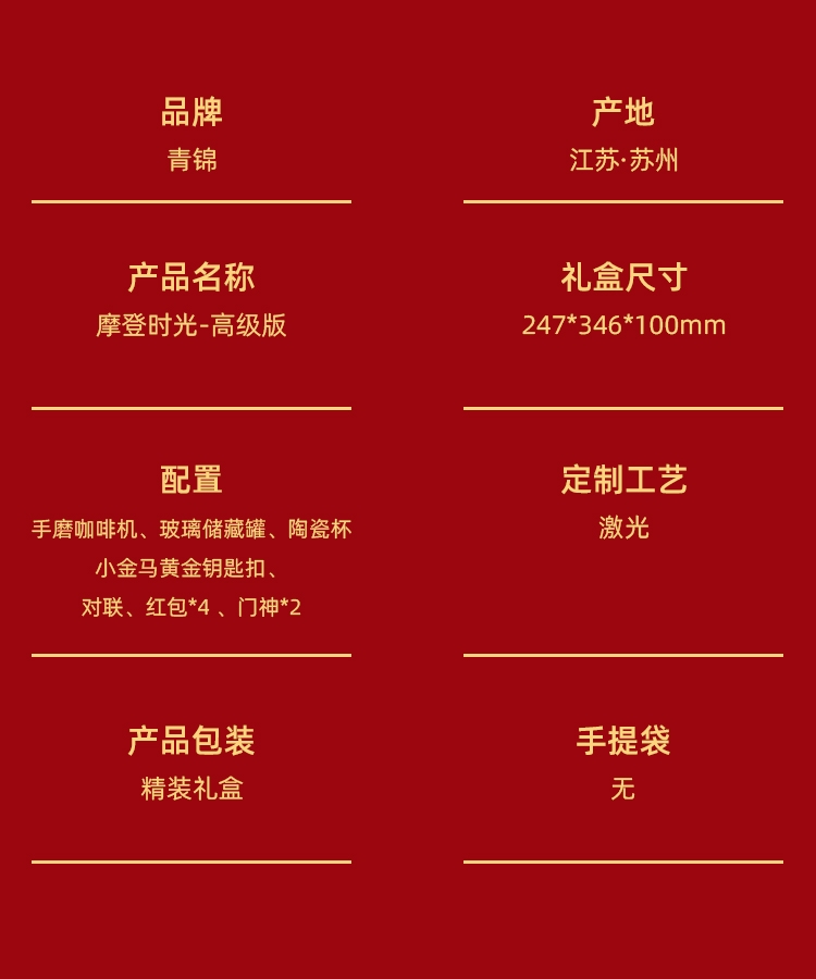 配置:科曼手磨咖啡机*1 意式拼配咖啡豆*1袋(100克) 玻璃保鲜便携豆罐*1咖啡杯*1 马上有钱小金马黄金钥匙扣*1 对联*1-红包*4 门神*2 精装礼盒手提袋*1