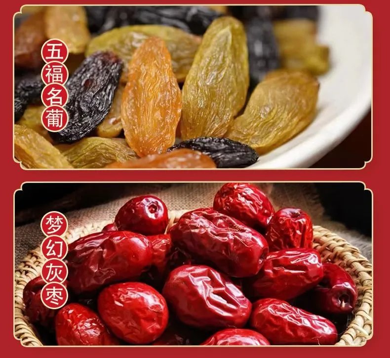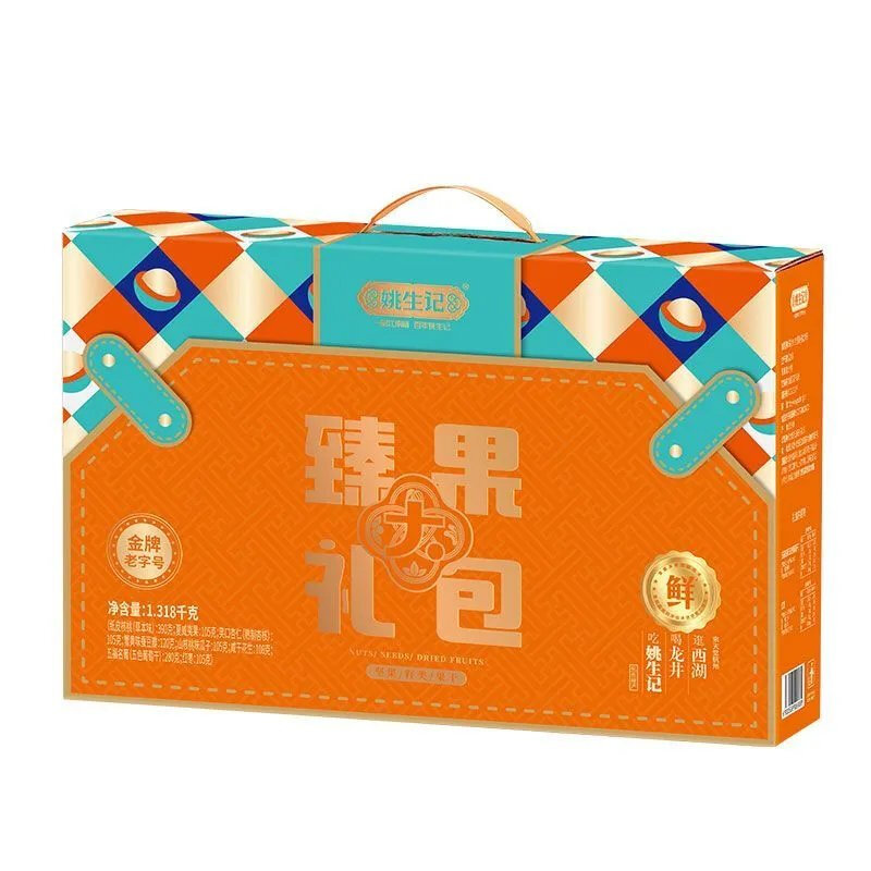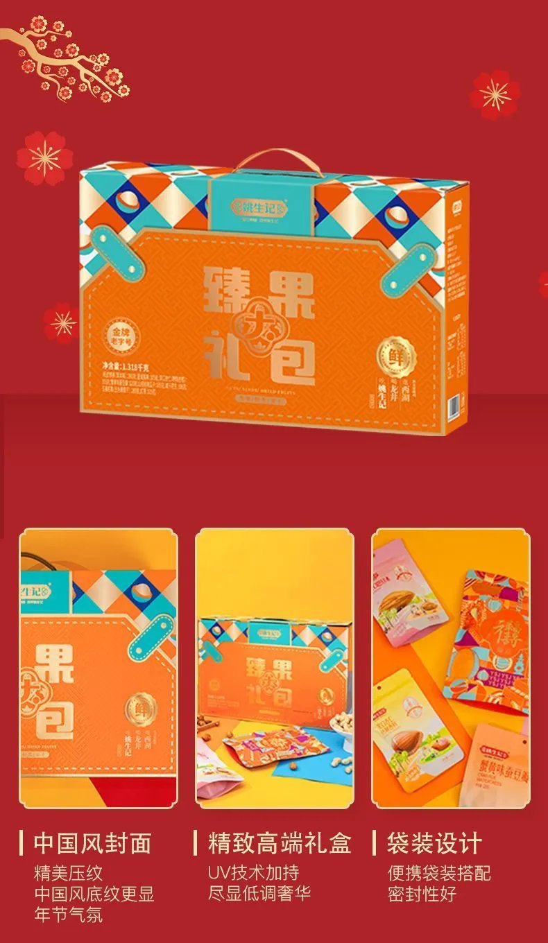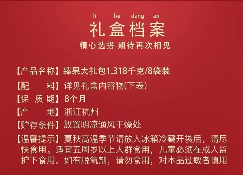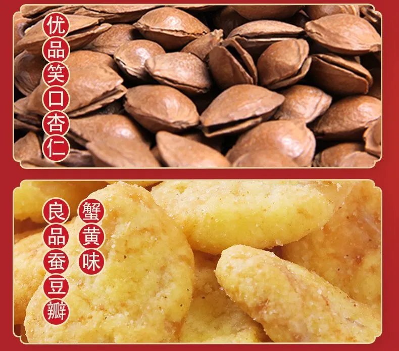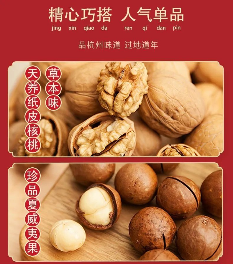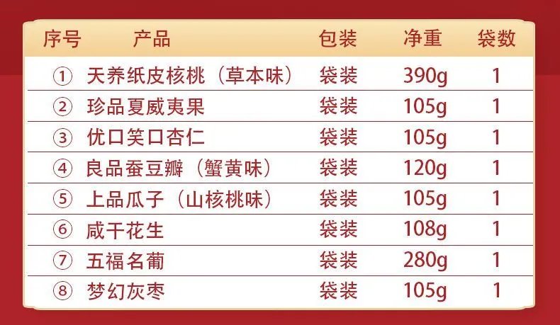 配置:105克珍品夏威夷果 1袋 105克优品笑口杏仁 1袋 390克天养纸皮核桃(草本味) 1袋 120克蟹黄味蚕豆瓣 1袋 105克山核桃味瓜子 1袋 280克五福名葡 1袋 105克暴富枣 1袋