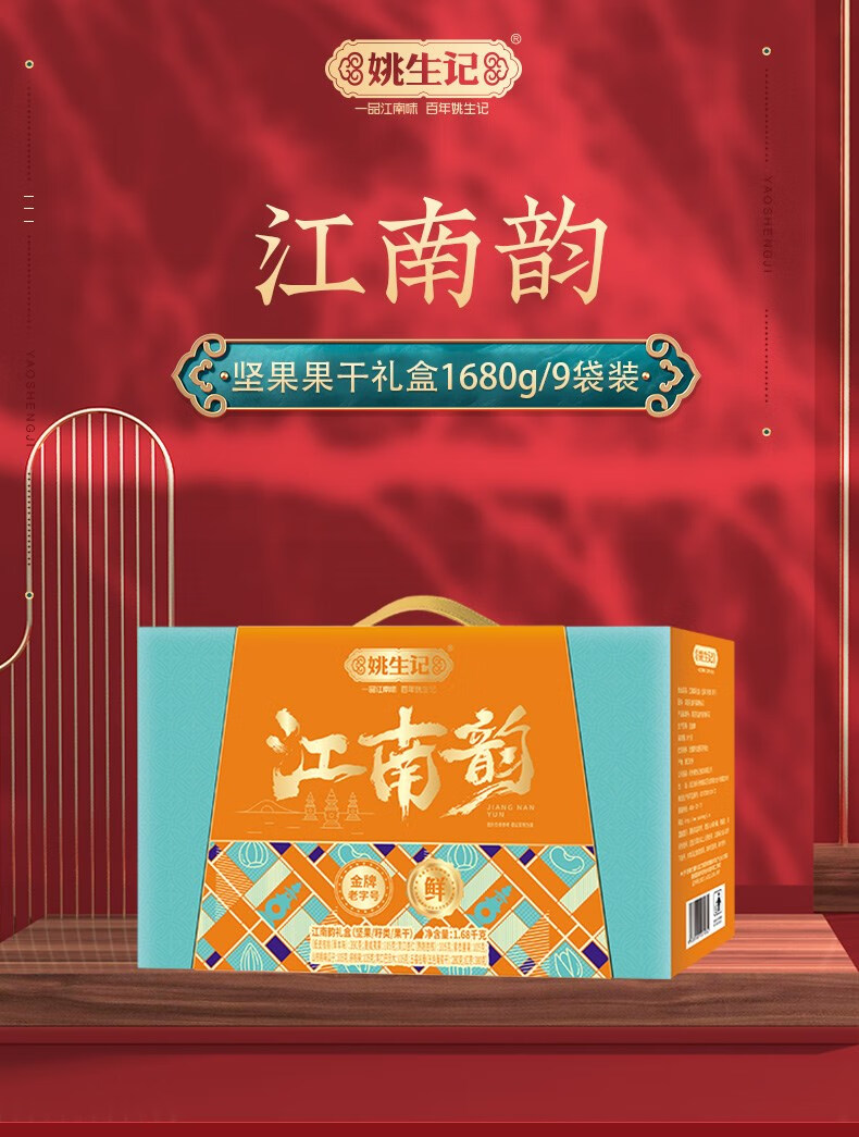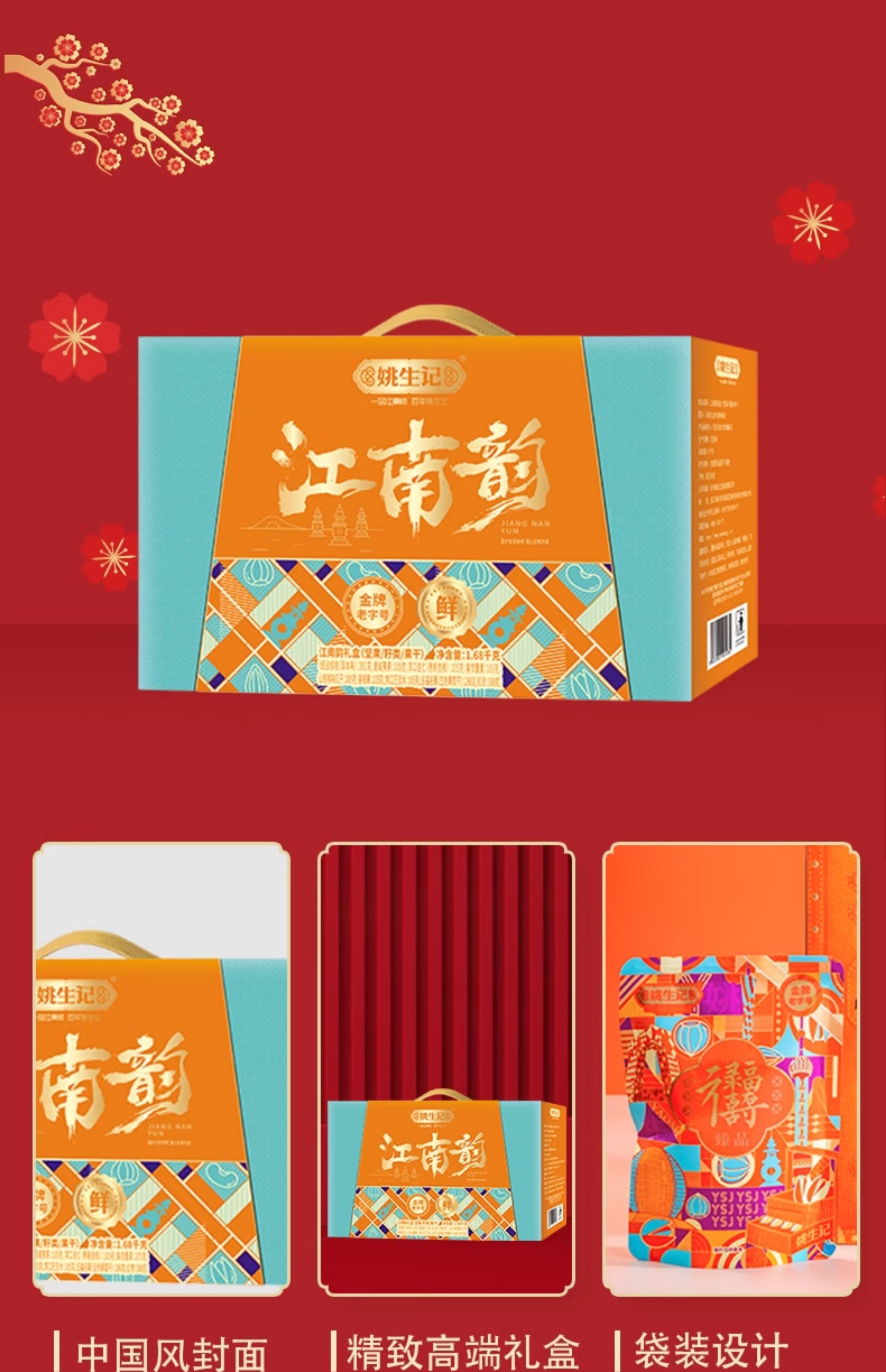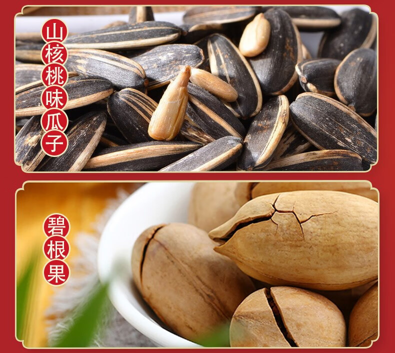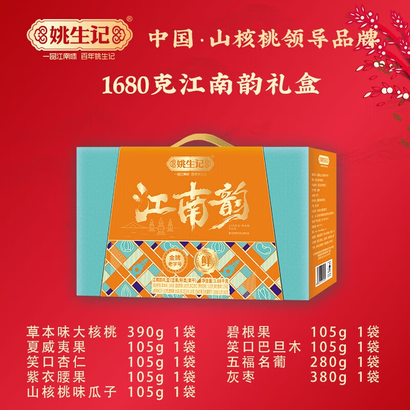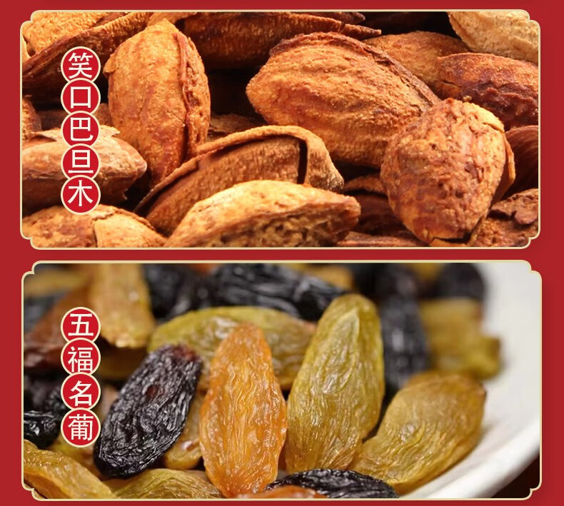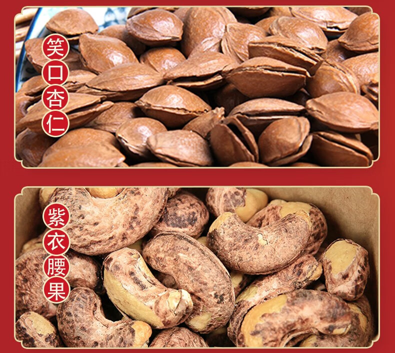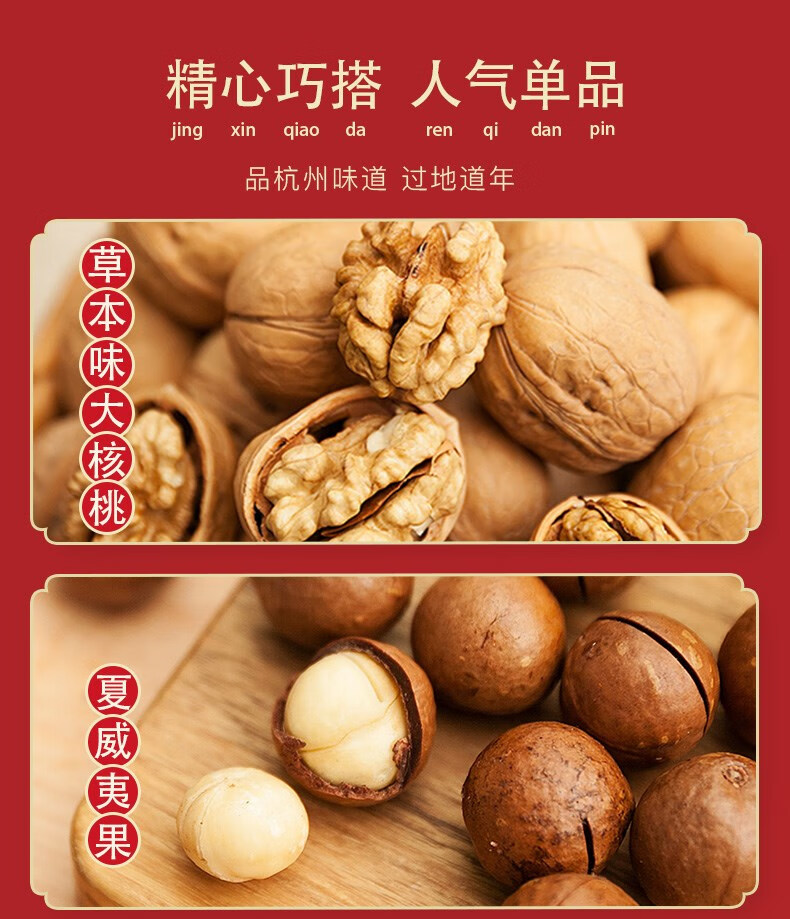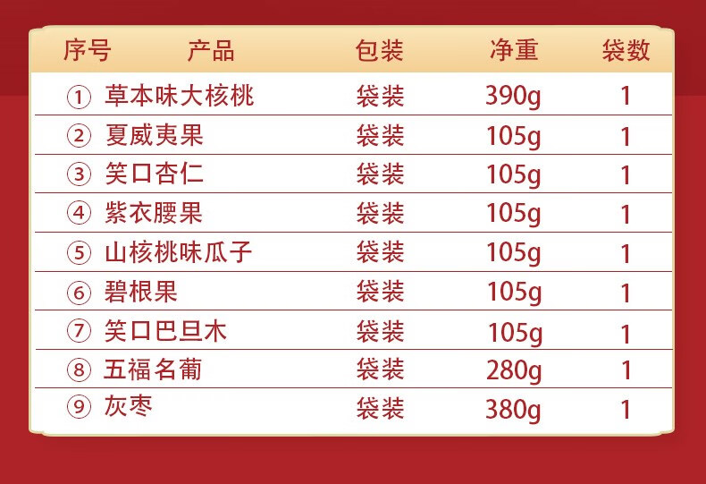 配置:105克夏威夷果 105克笑口杏仁 390克天养纸皮核桃(草本味) 105克紫衣腰果 105克碧根果 105克山核桃味瓜子 105克笑口巴旦木 280克五福名葡 380克暴富枣(红枣)