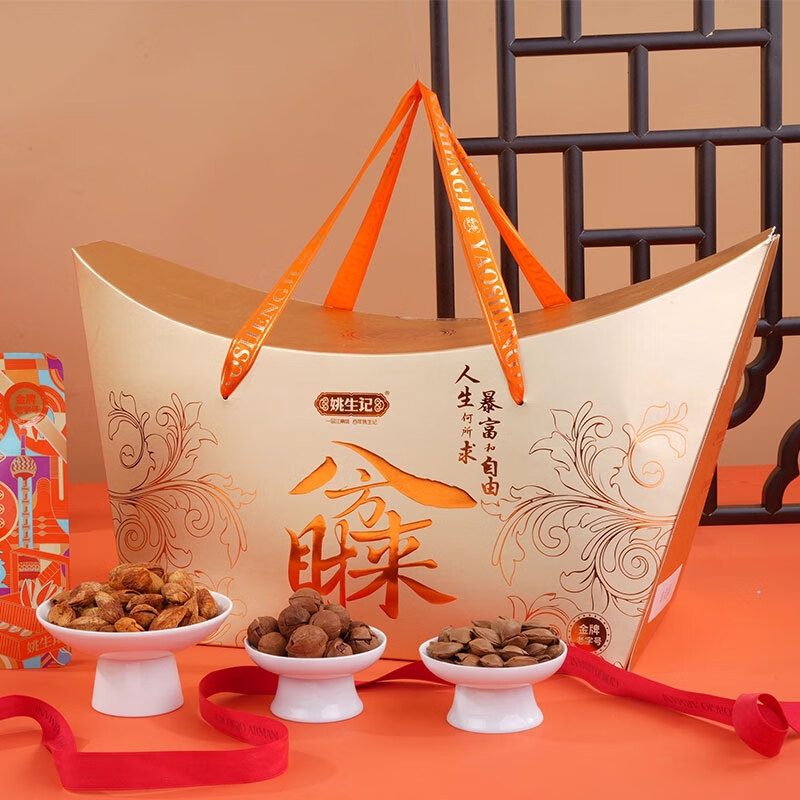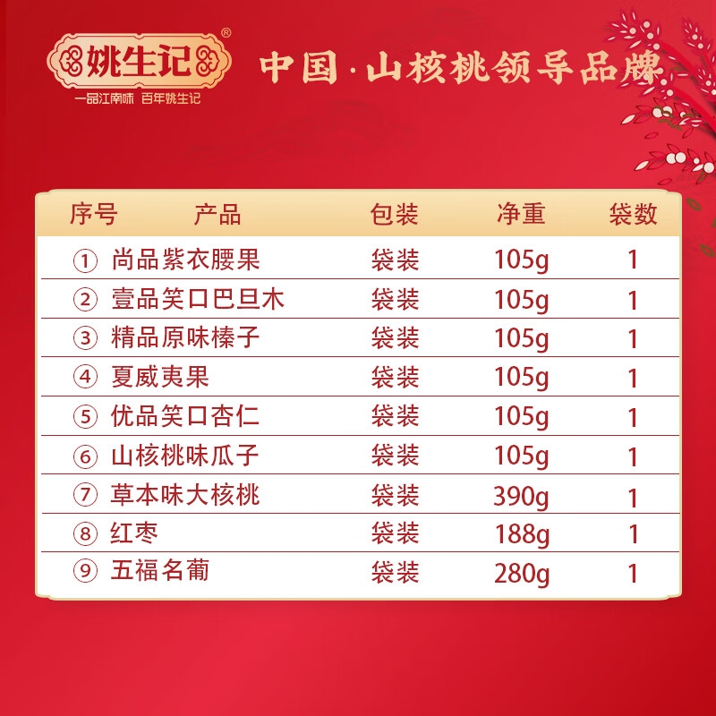 配置:105克紫衣腰果 105克笑口巴旦木 105克夏威夷果 105克原味榛子 105克笑口杏仁 105克山核桃味瓜子 390克天养纸皮核桃(草本味) 188克富贵枣(红枣) 280克五福名葡