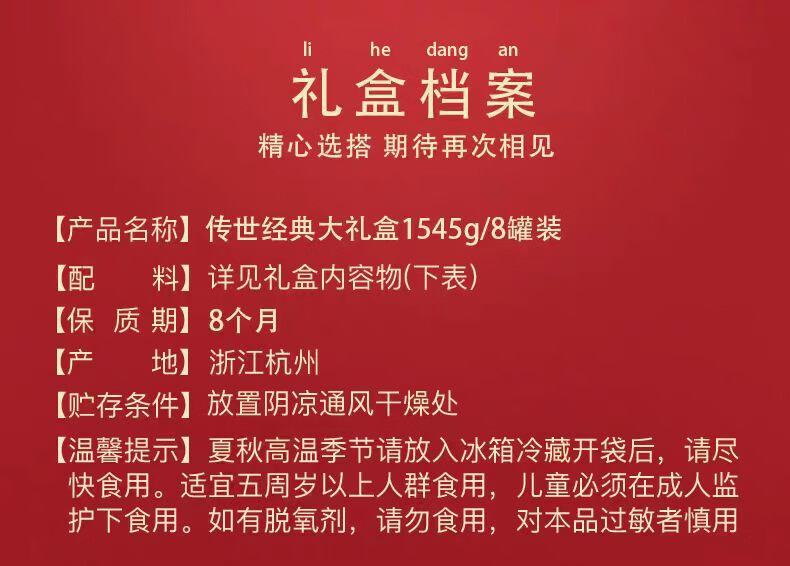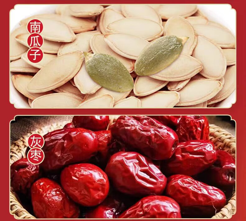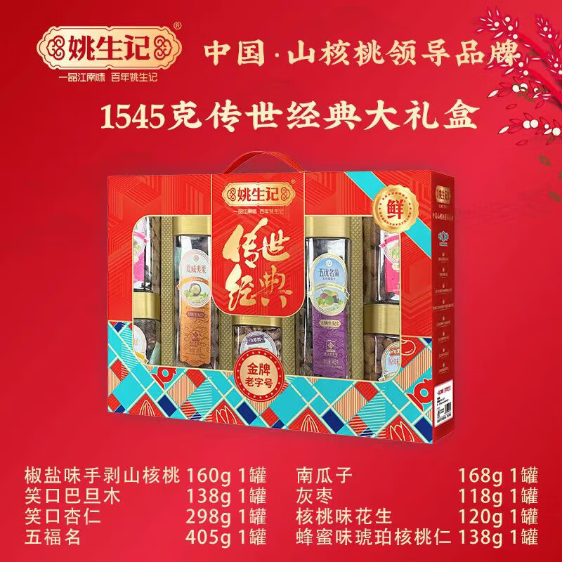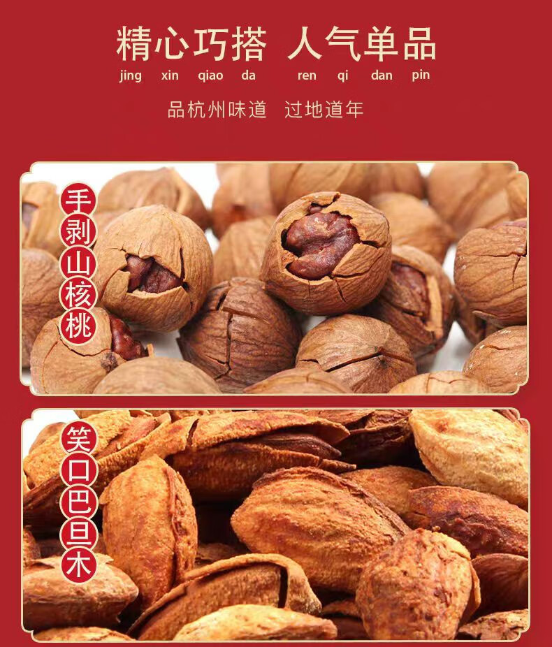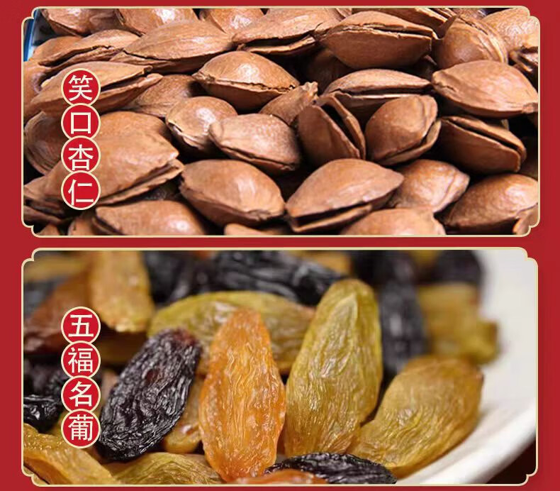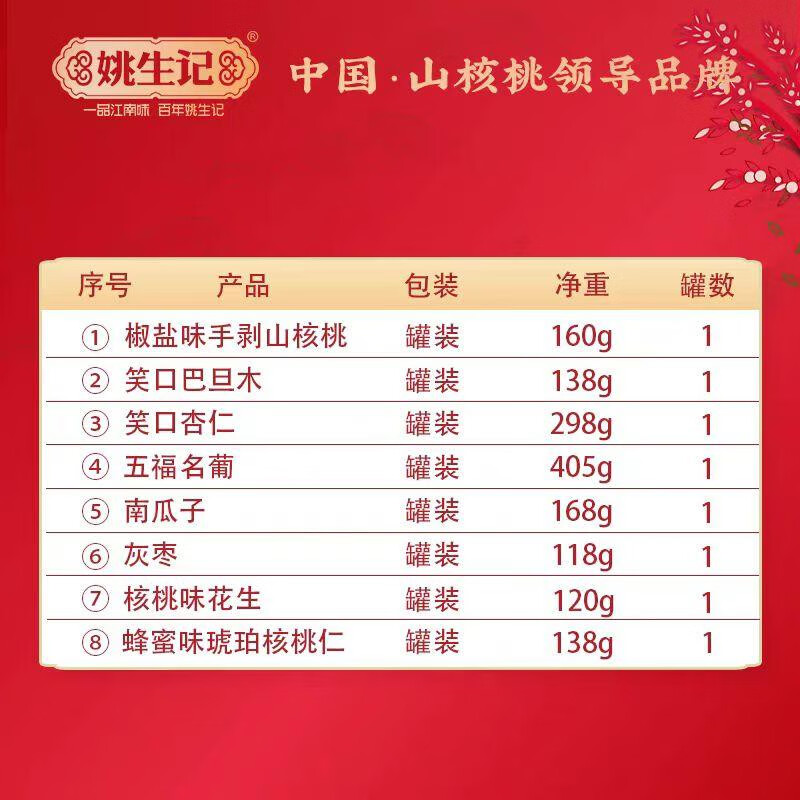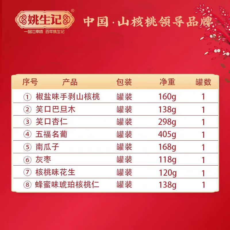 配置:160克椒盐味手剥山核桃/方形罐 1罐 138克笑口巴旦木/方形罐 1罐 298克笑口杏仁/方形罐 1罐 405克五福名葡/方形罐 1罐 168克佳品南瓜子/方形罐 1罐 118克红枣/方形罐 1罐 120克茗品核桃味花生/方形罐 1罐 138克蜂蜜味琥珀核桃仁/方形罐 1罐