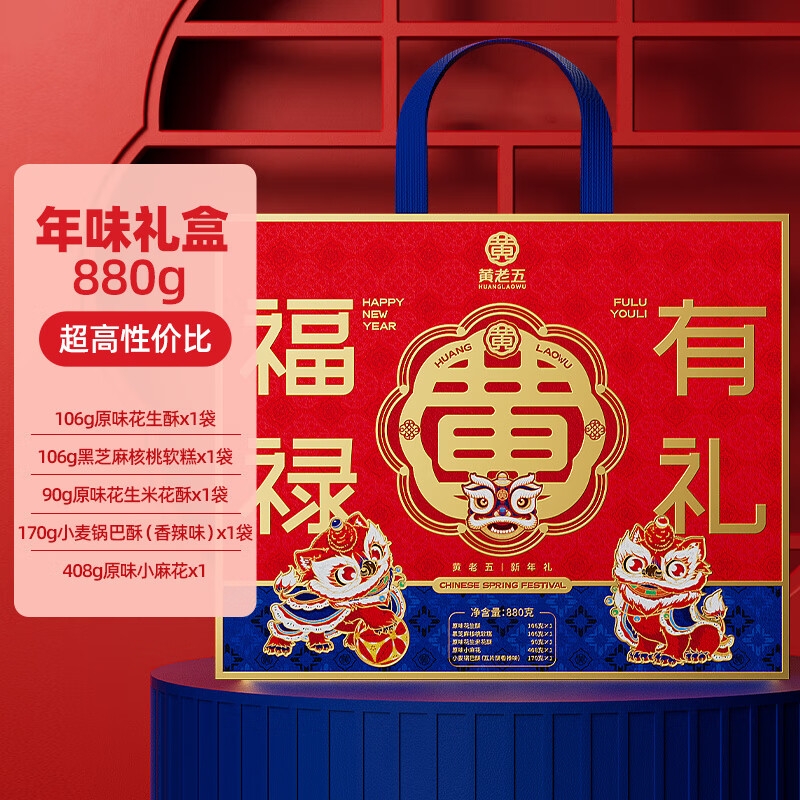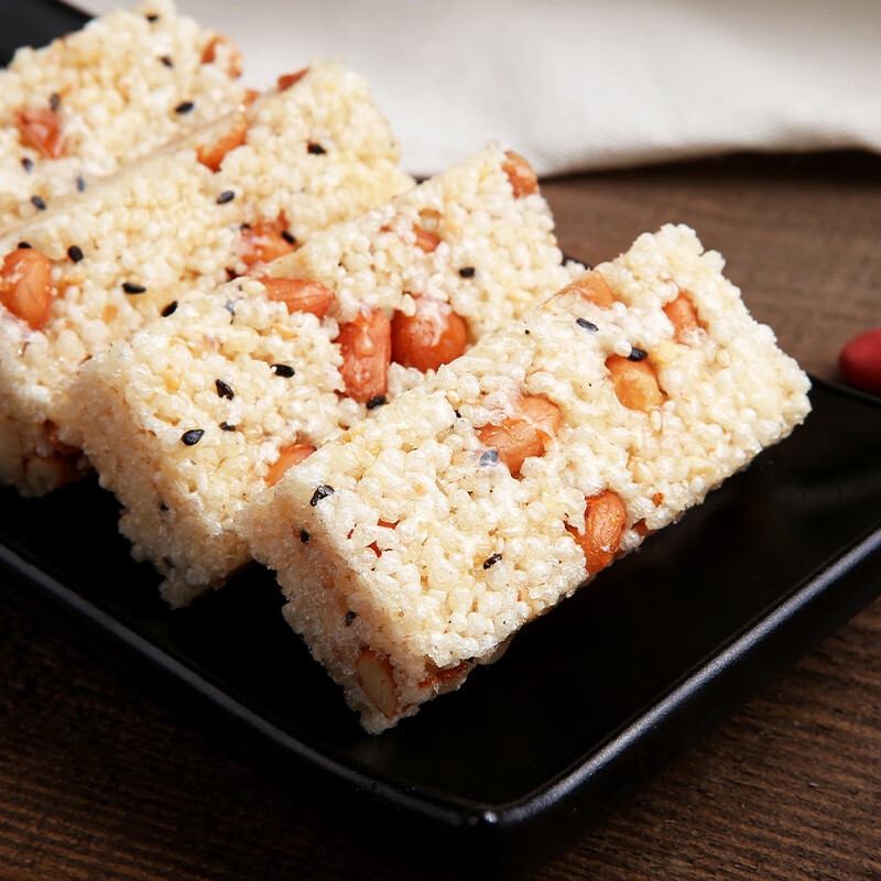 配置:106g原味花生酥*1 106g黑芝麻核桃软糕*1 90g原味花生米花酥*1 170g小麦锅巴酥(瓦片酥香辣味)*1 408g原味小麻花*1