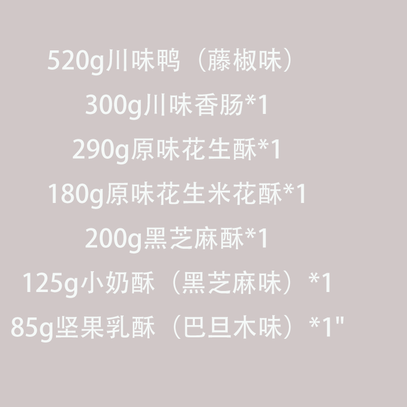 配置:520g川味鸭(藤椒味) 300g川味香肠*1 290g原味花生酥*1 180g原味花生米花酥*1 200g黑芝麻酥*1 125g小奶酥(黑芝麻味)*1 85g坚果乳酥(巴旦木味)*1